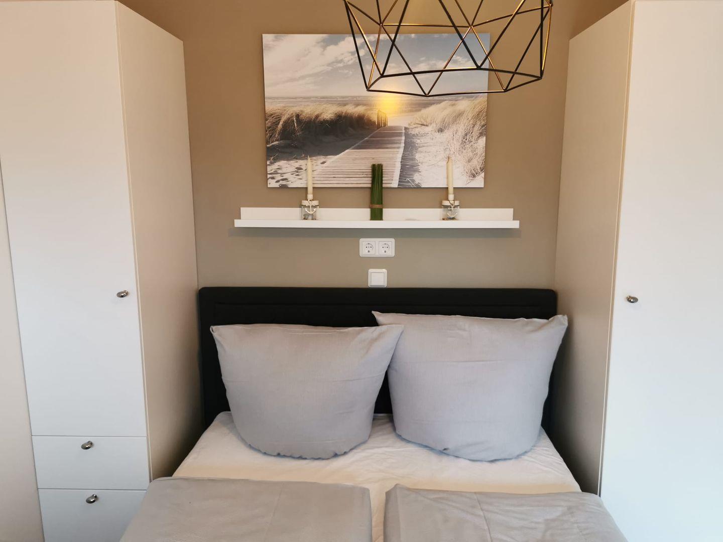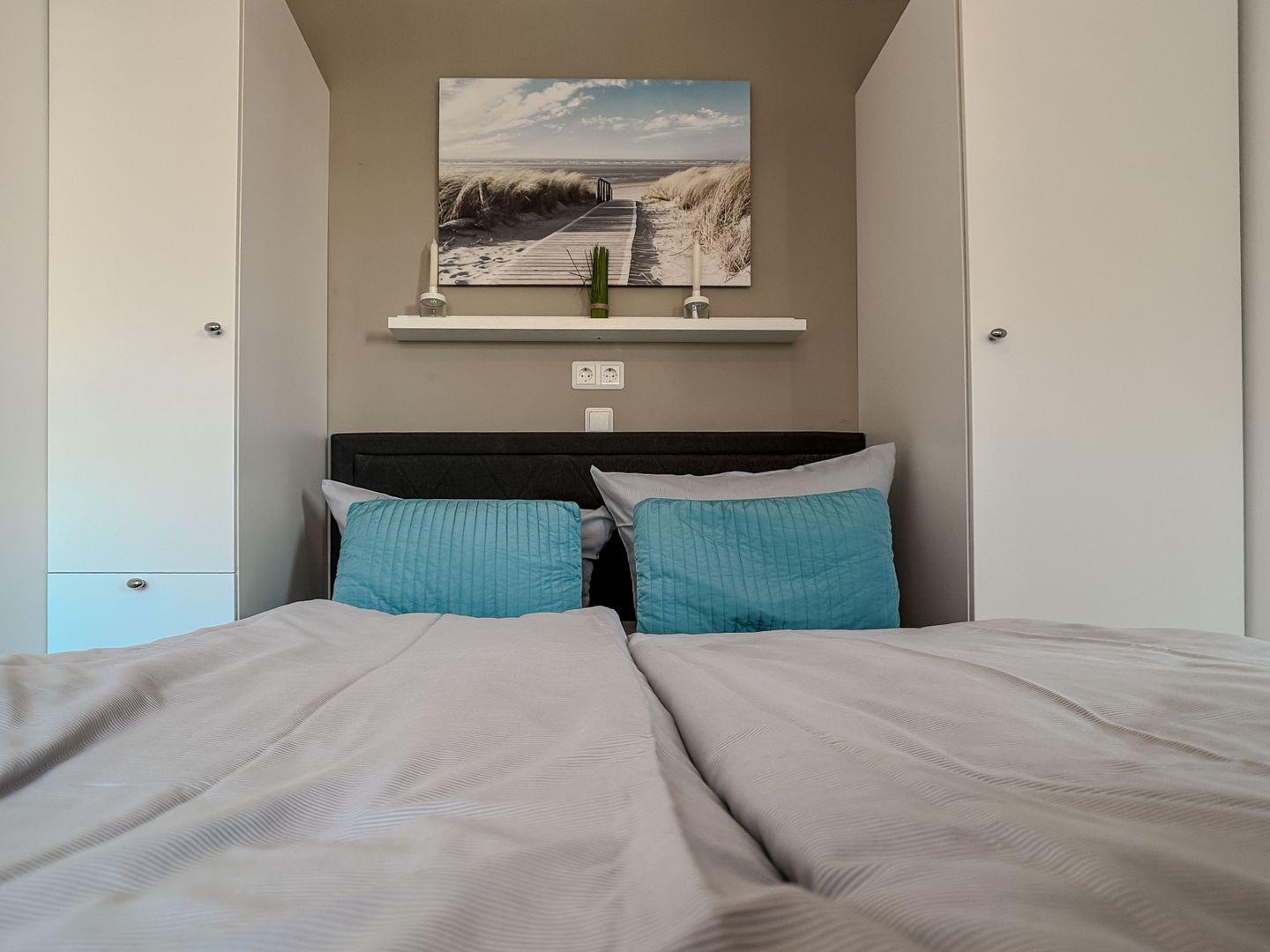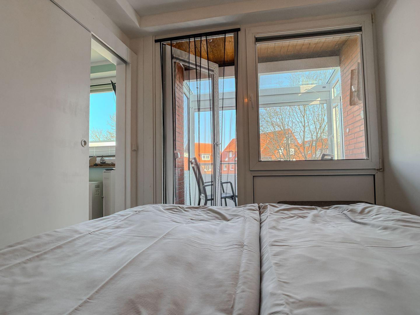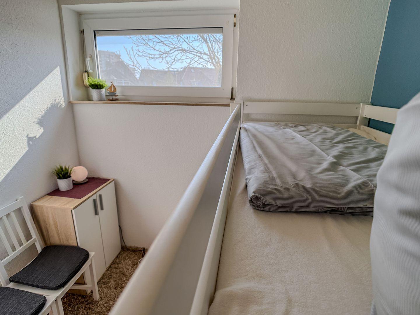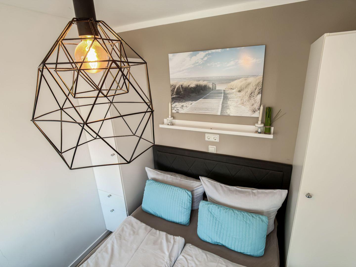 Das Schlafzimmer mit Doppelbett und Balkonzugang lädt zum Entspannen ein. Ein weiteres Schlafzimmer mit Etagenbett sorgt für erholsame Nächte.