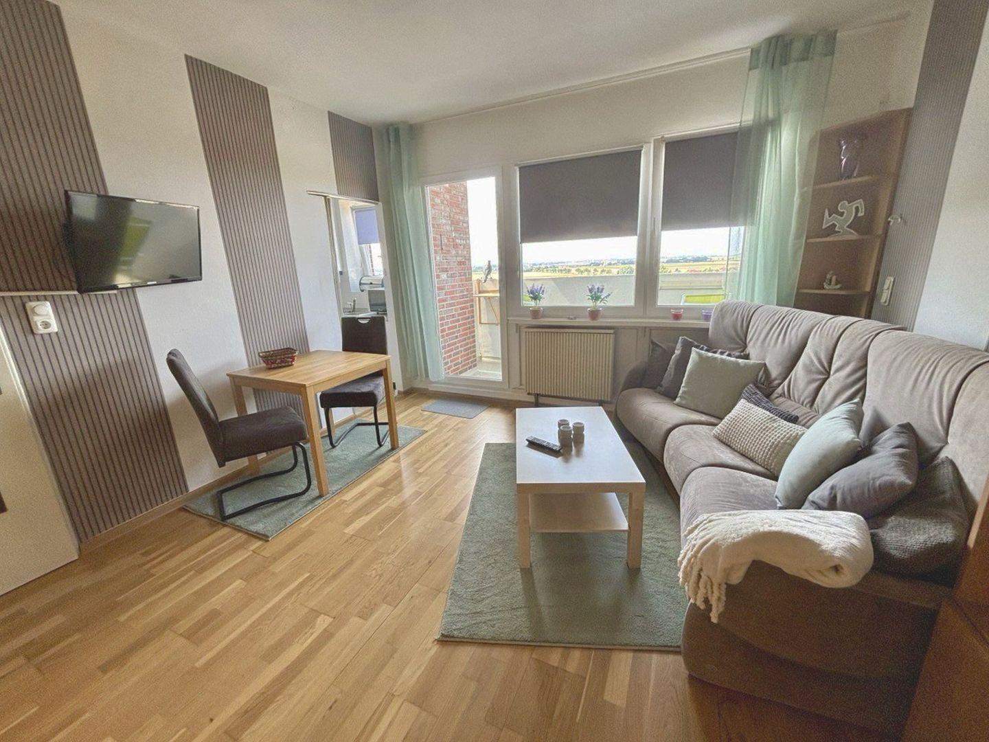Der kleine Meerengel in der 10. Etage bietet einen eindrucksvollen Ausblick. Die Wohnung verfügt über ein Wohn- und Schlafbereich mit separater Küche. Durch die zwei Schrankbetten bleibt reichlich Platz für die täglichen Gewohnheiten. Das Frühstück lässt sich bei Schietwetter am Esstisch mit zwei Stühlen oder bei schönem Wetter auf dem Balkon einnehmen. Selbstverständlich soll die Kommunikation per Internet nicht zu kurz kommen.