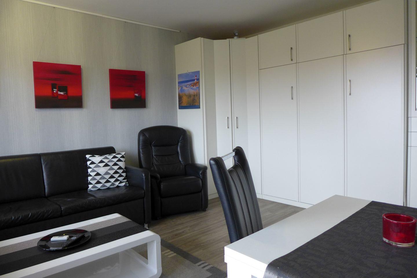 Ein kombinierter Wohn-Schlafraum mit Doppelschrankbett, Sofa, Fernsehsessel, Eckkleiderschrank 110 x 110 cm, gemütlicher Essecke, TV-Flachbildschirm, CD + DVDPlayer