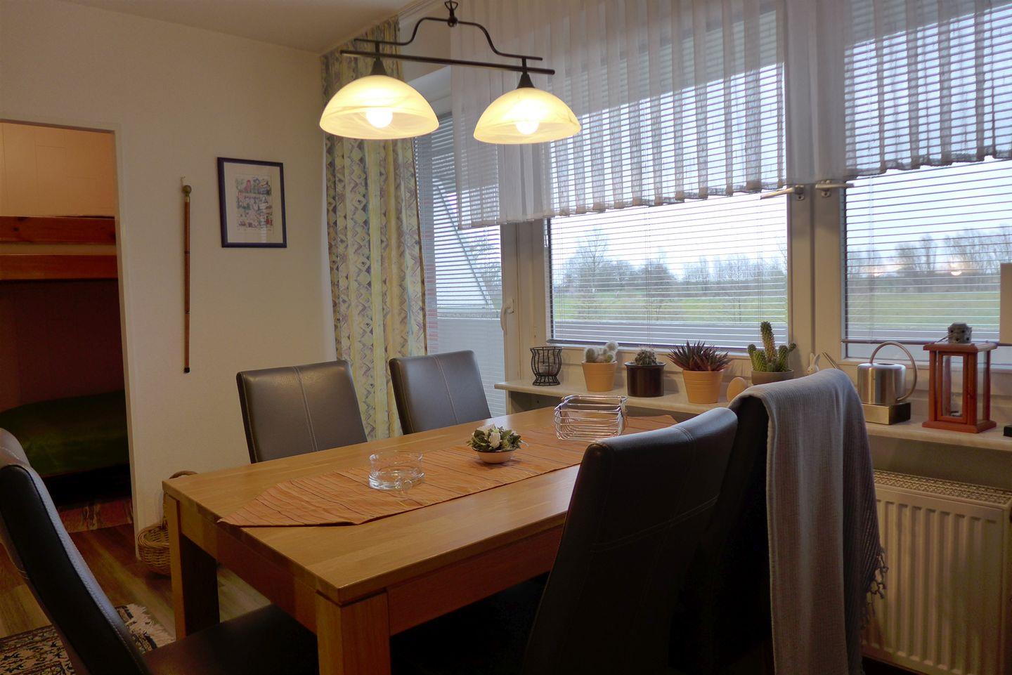 Eine moderne Küche ist mit Spülmaschine, Cerankochfeld, Backofen mit integrierter Mikrowelle und allen erforderlichen E-Geräten, z. B. Wasser- , Eierkocher und Toaster, Porzellan, Gläsern sowie Tischwäsche ausgestattet. Ferner gibt es ein neues Duschbad. Im Flur befindet sich ein Einbaukleiderschrank. Die Ferienwohnung ist mit einer Zentralwarmwasser-Elektroheizung (keine Nachtspeicherheizung) ausgestattet.