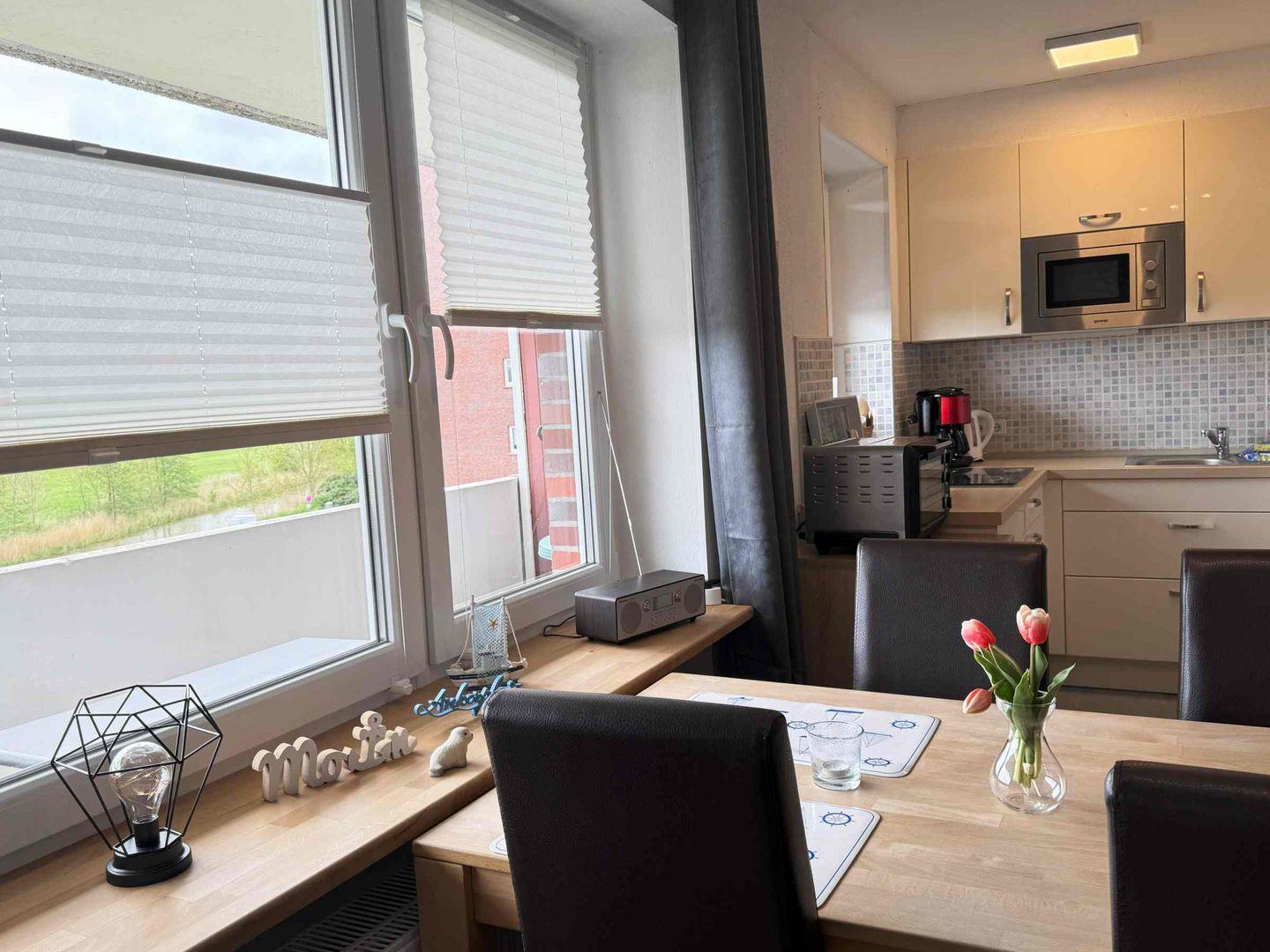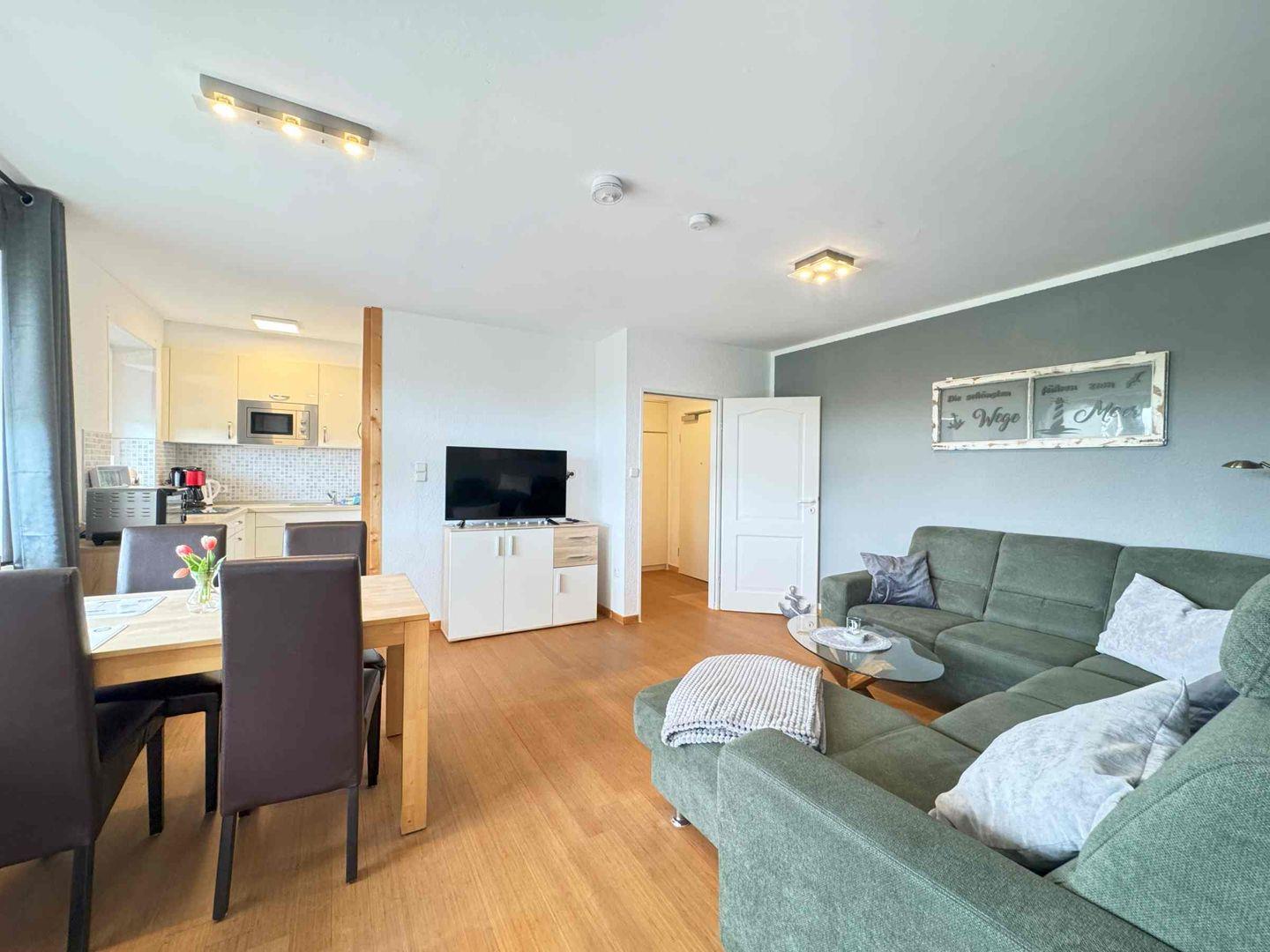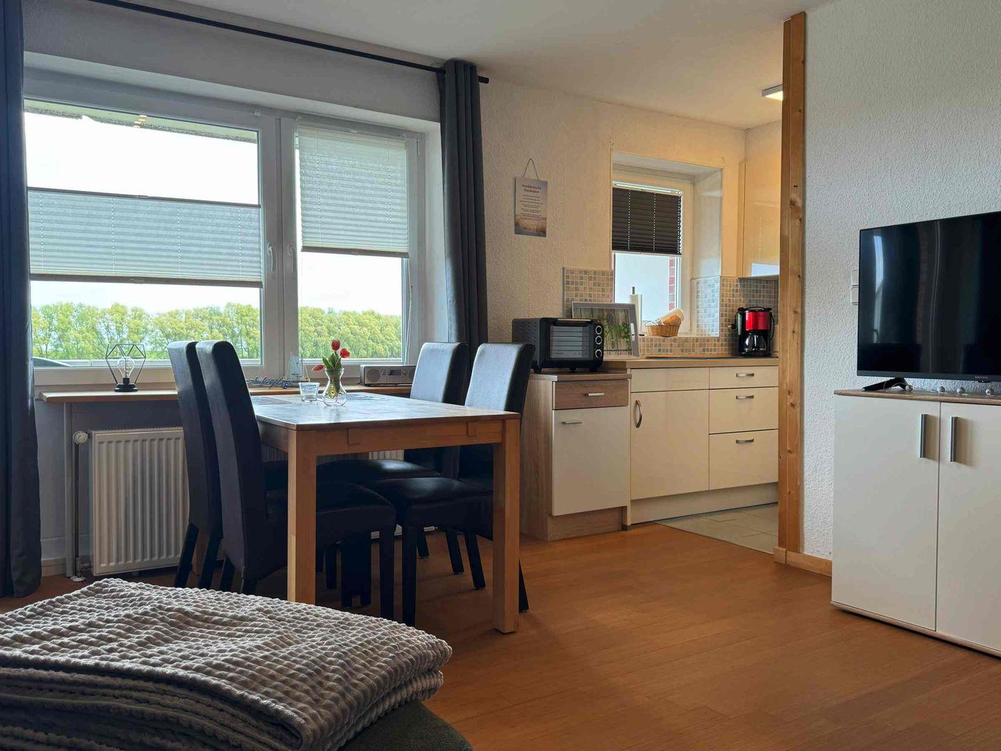 Diese moderne und klare Wohnung bietet mit seinen offenen Zimmern eine herrliche Aussicht. Auf dem großzügigem Balkon mit Blick zum Meer und auf den Deich mit den Schafen können Sie ihr Frühstück sonnig genießen.
