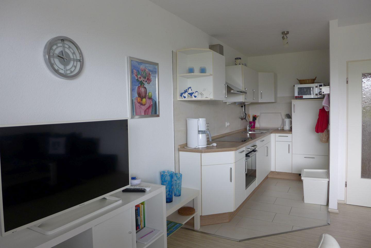 Die Wohnung verfügt über 2 Zimmer, einen offenen Wohn-Essbereich, Schlafraum und Schafsofa im Wohnbereich, Duschbad und einen großzügigen Balkon, auf dem sie bis mittags die Sonne genießen können. 2-4 Personen finden hier Platz. Backofen und Geschirrspüler sind vorhanden.