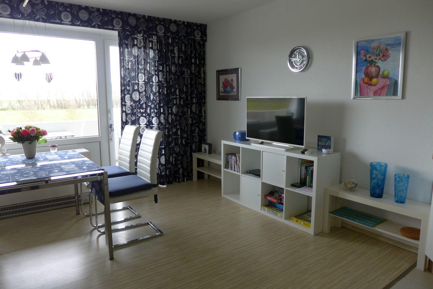 Die Wohnung verfügt über 2 Zimmer, einen offenen Wohn-Essbereich, Schlafraum und Schlafsofa im Wohnbereich, Duschbad und einen großzügigen Balkon, auf dem sie bis mittags die Sonne genießen können. 2-4 Personen finden hier Platz. Backofen und Geschirrspüler sind vorhanden.