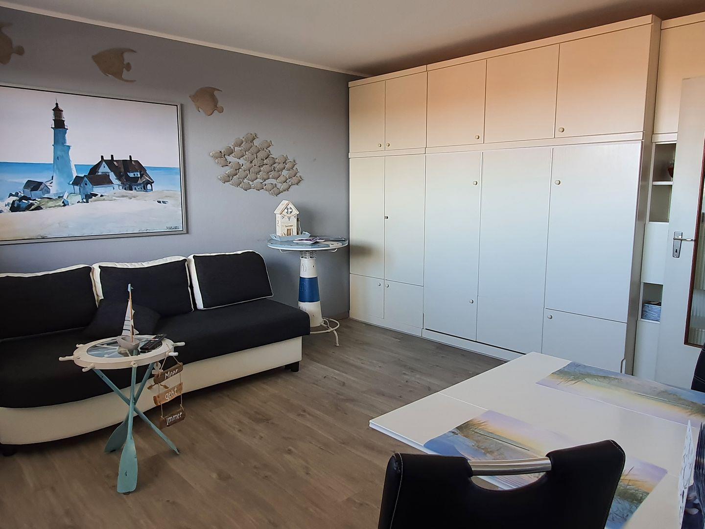 Diese helle und gemütliche Einzimmerwohnung, in der 3`ten Etage, mit Blick auf Horumersiel, ist gerade mit allergikerfreundlichem Laminatboden neu renoviert worden. Im kombinierten Wohn- und Schlafraum befindet sich eine neue Sofaecke, ein Flachbildfernseher, ein doppeltes Schrankbett und eine gemütliche Essecke. Haustiere nicht erlaubt .