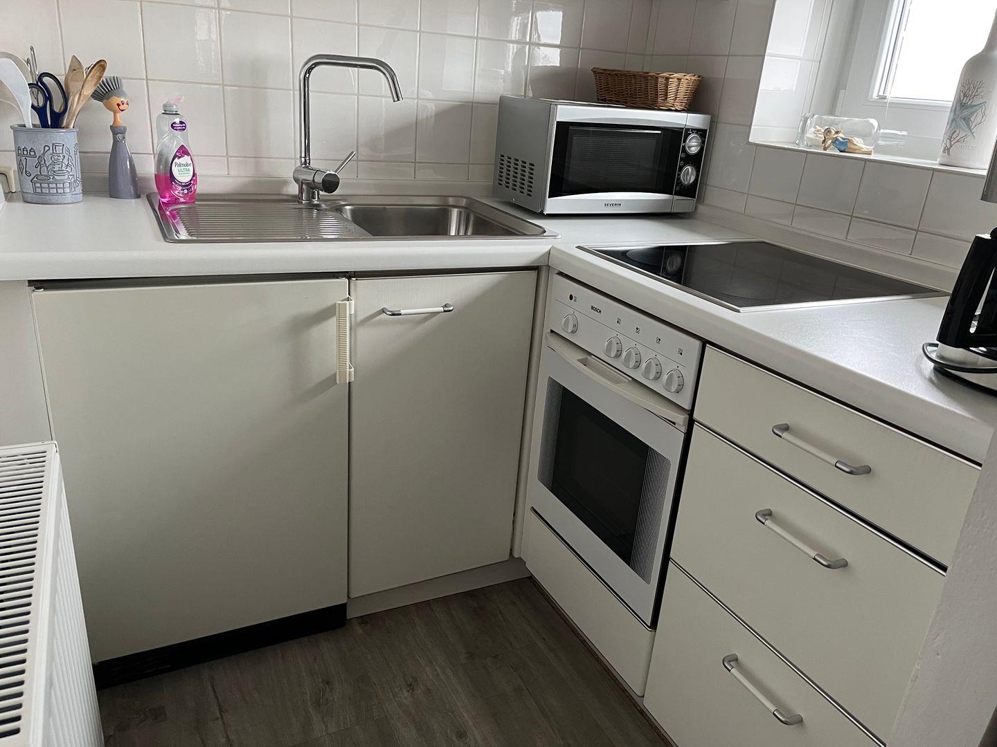 Diese helle und gemütliche Einzimmerwohnung, in der 3`ten Etage, mit Blick auf Horumersiel, ist gerade mit allergikerfreundlichem Laminatboden neu renoviert worden. Im kombinierten Wohn- und Schlafraum befindet sich eine neue Sofaecke, ein Flachbildfernseher, ein doppeltes Schrankbett und eine gemütliche Essecke. Die Küche ist mit Backofen und Ceranfeld, Kühlschrank, Kaffeemaschine, Toaster, Mikrowelle, Geschirr und Besteck ausgestattet. Alles für den perfekten Urlaub.