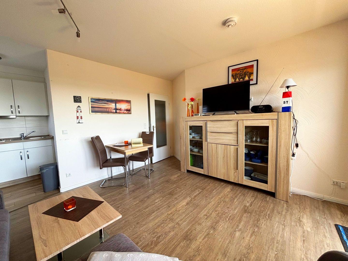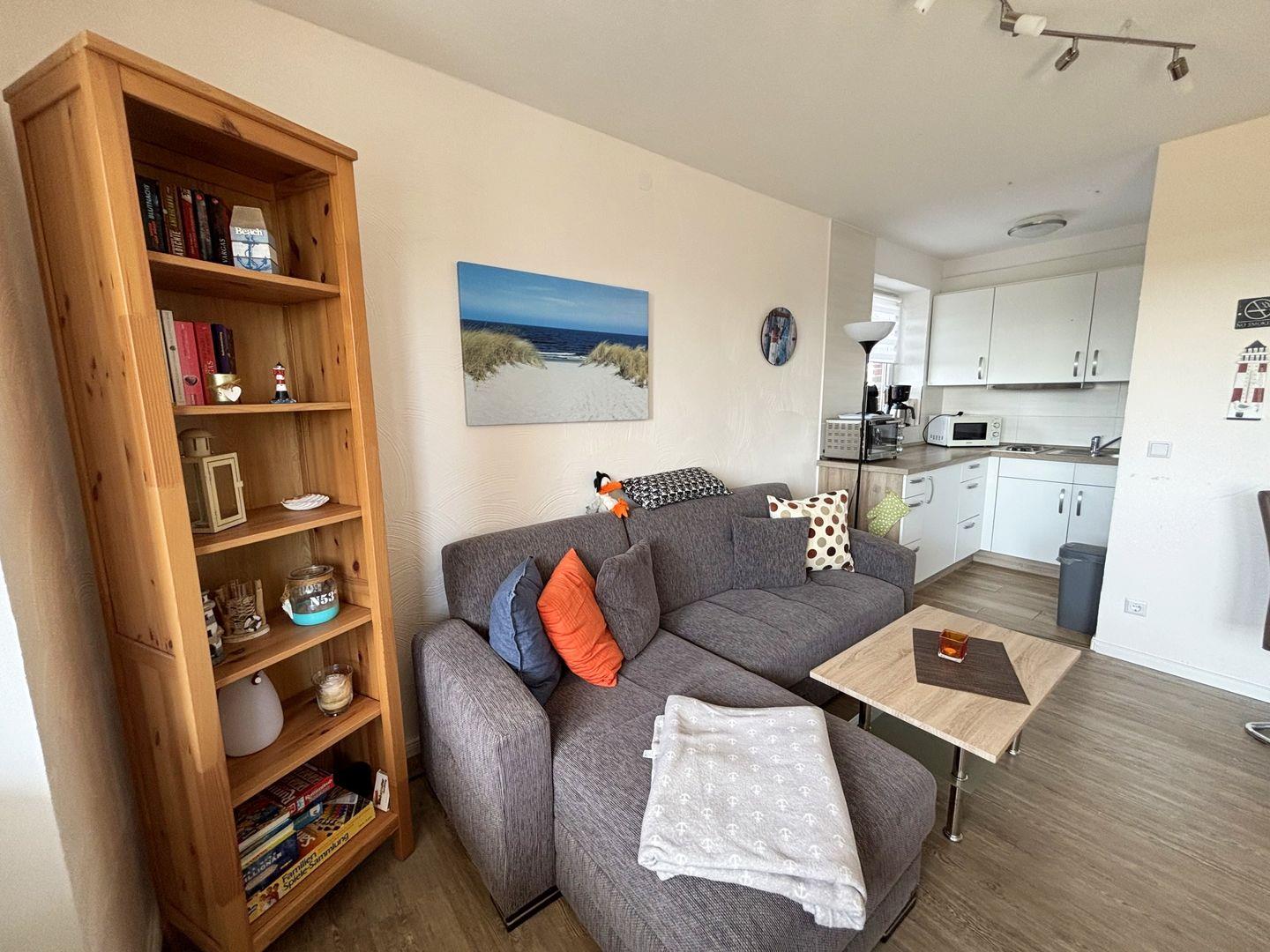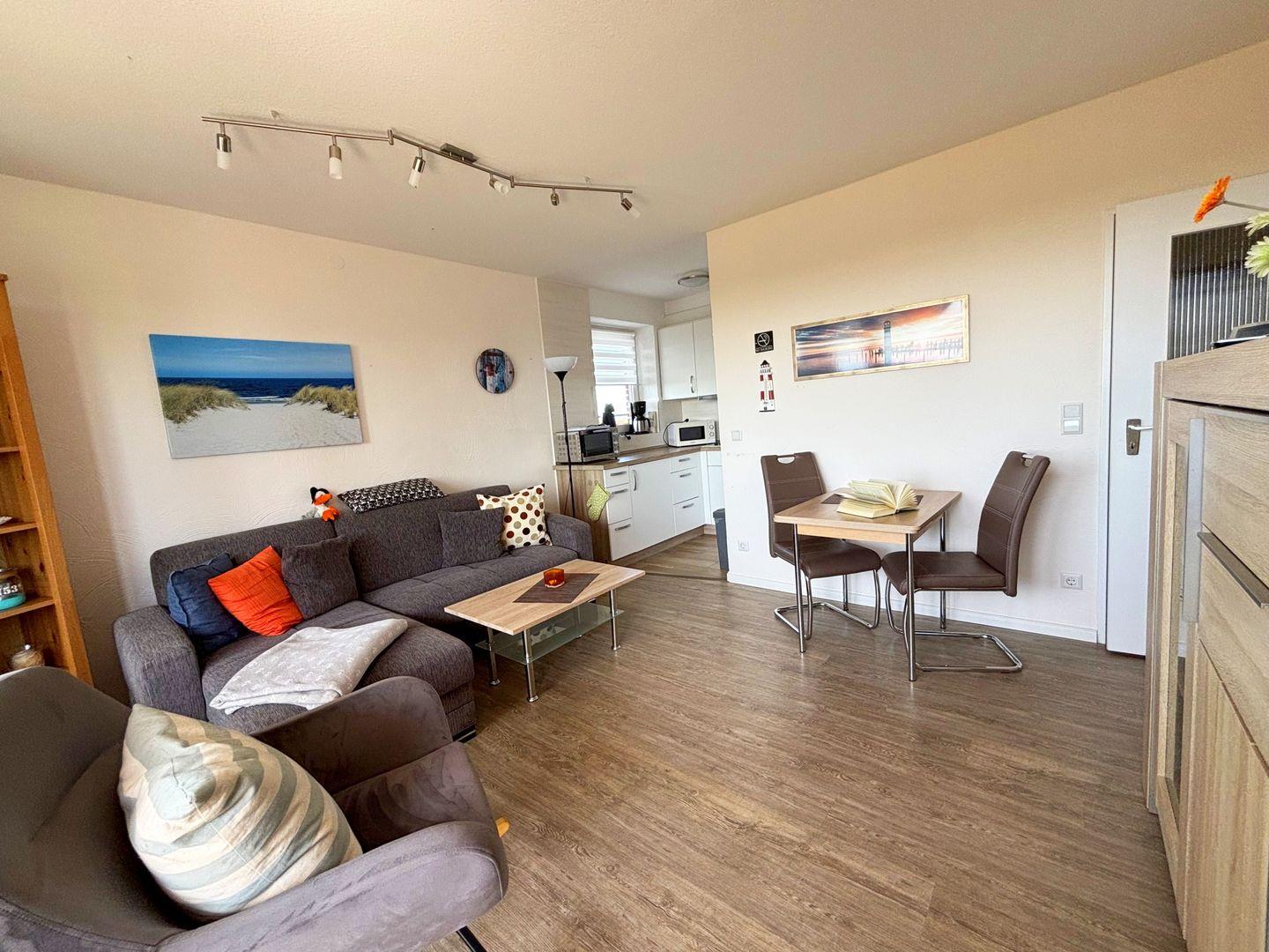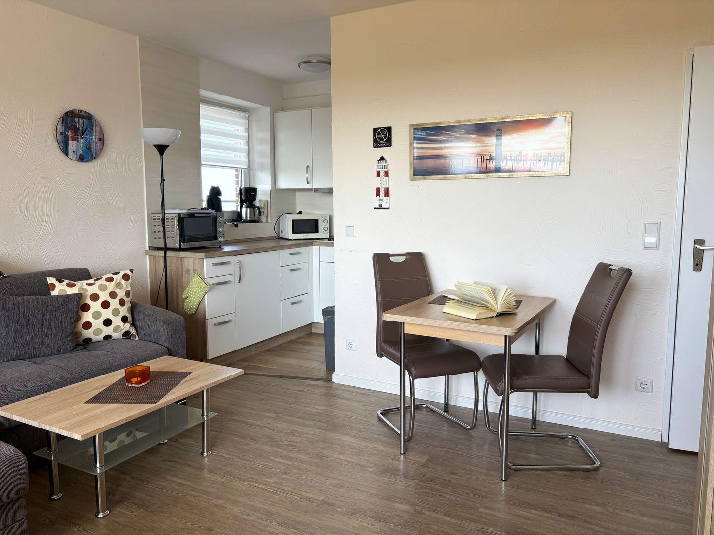 Das Wohnzimmer mit offener Küche, einem extra Essbereich und einer schönen Wohnlandschaft laden zum entspannen ein. Die Küche ist modern und zweckmäßig mit Mikrowelle mit Grill, Senseo-Kaffeemaschine, Kaffeemaschine und Wasserkocher eingerichtet.