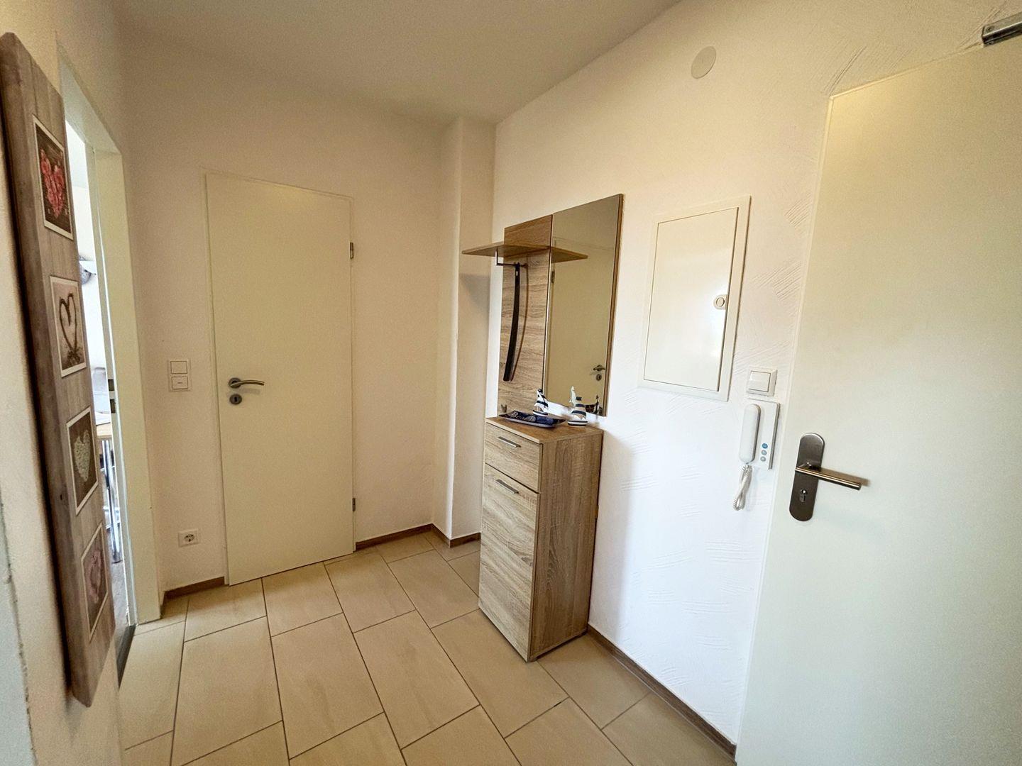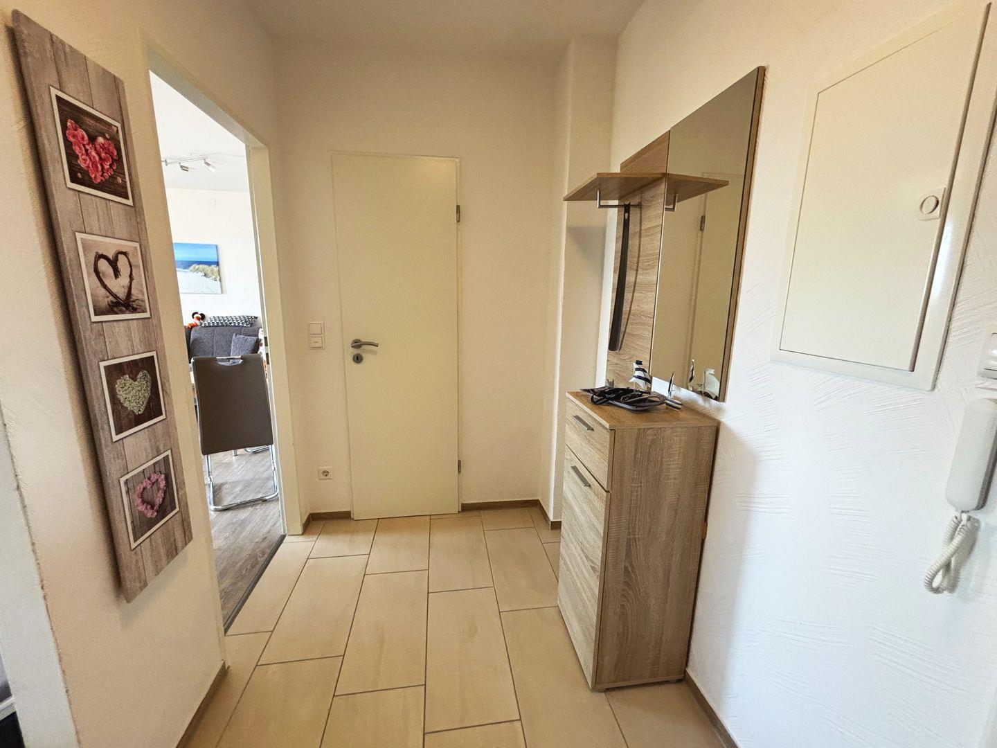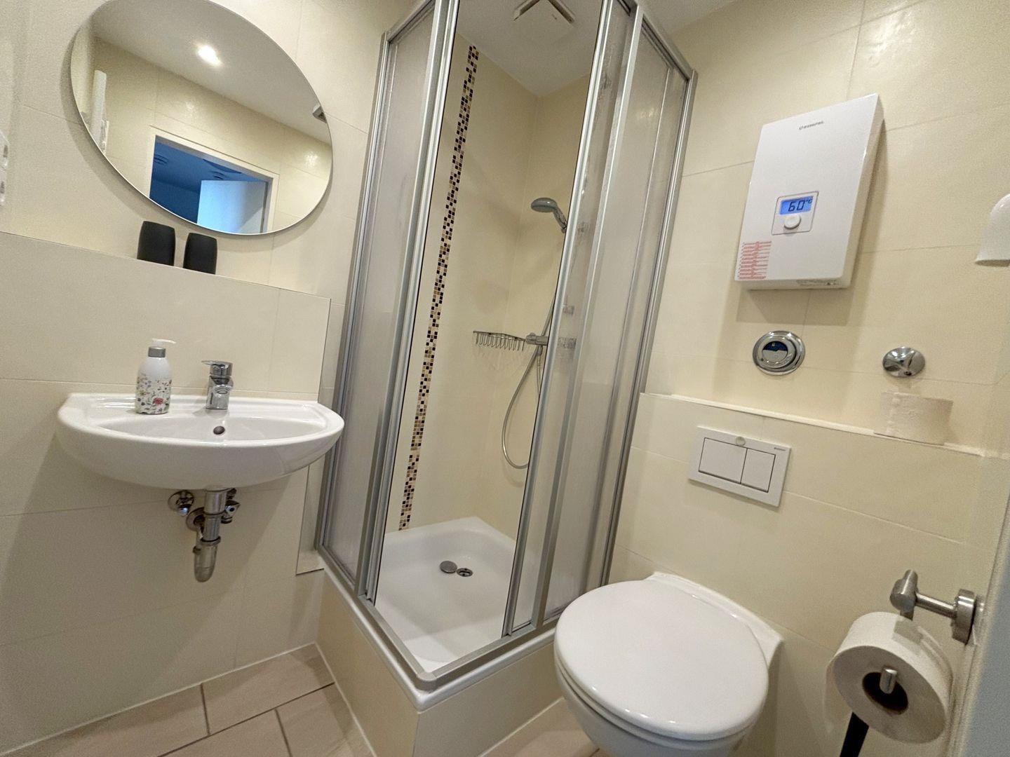Das Duschbad ist frisch renoviert. Der Flur ist mit Garderobe, Schuh und Kofferschrank ausgestattet.