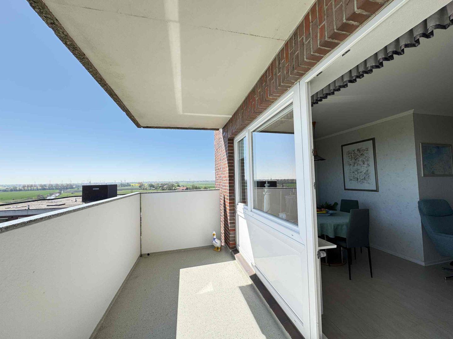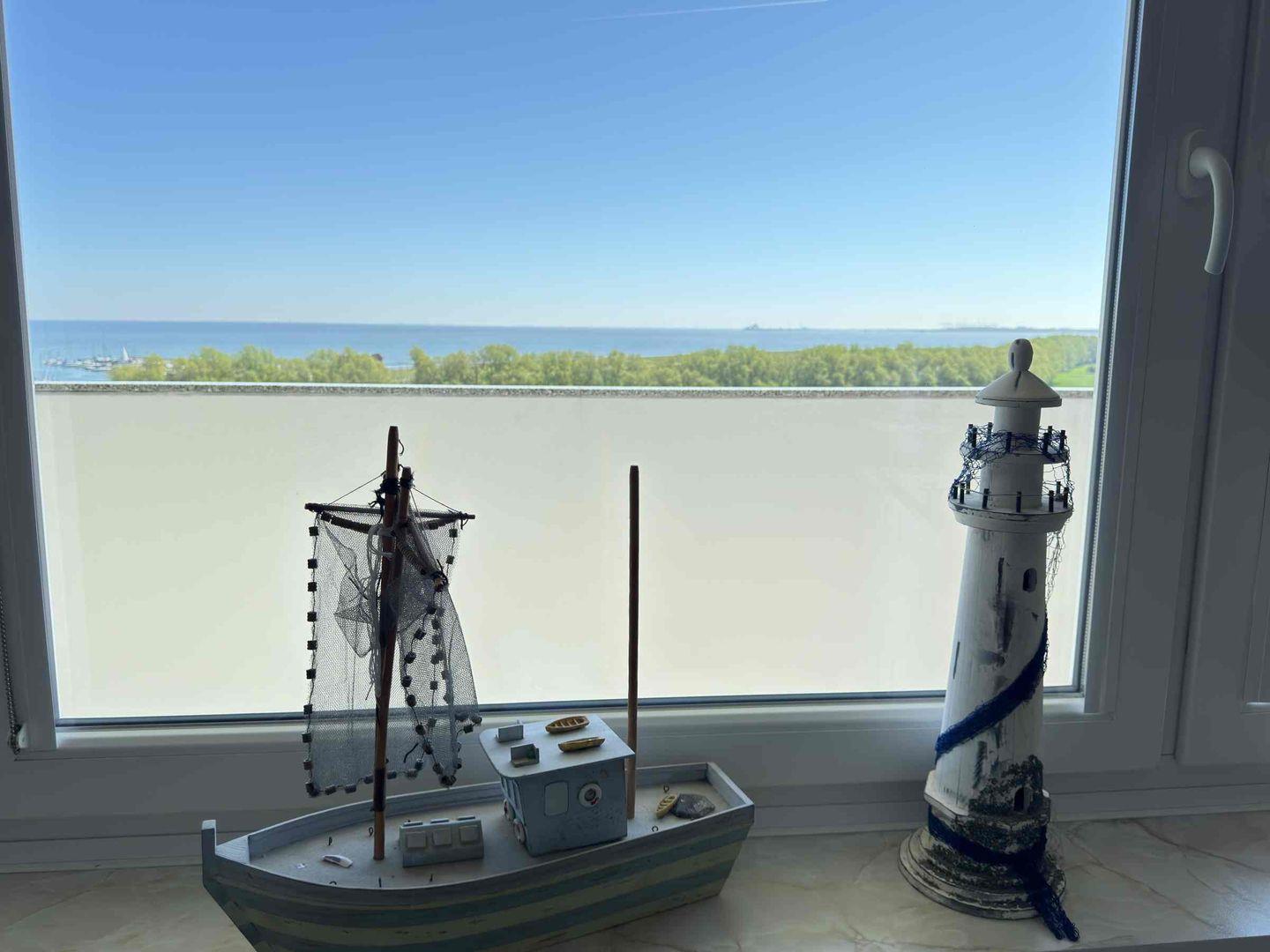 Der Balkon mit einem wunderschönen Blick zum Meer. Die Wohnung hat ein extra Schlafzimmer mit zwei einzelnen Betten und einem Wohnschlafraum.