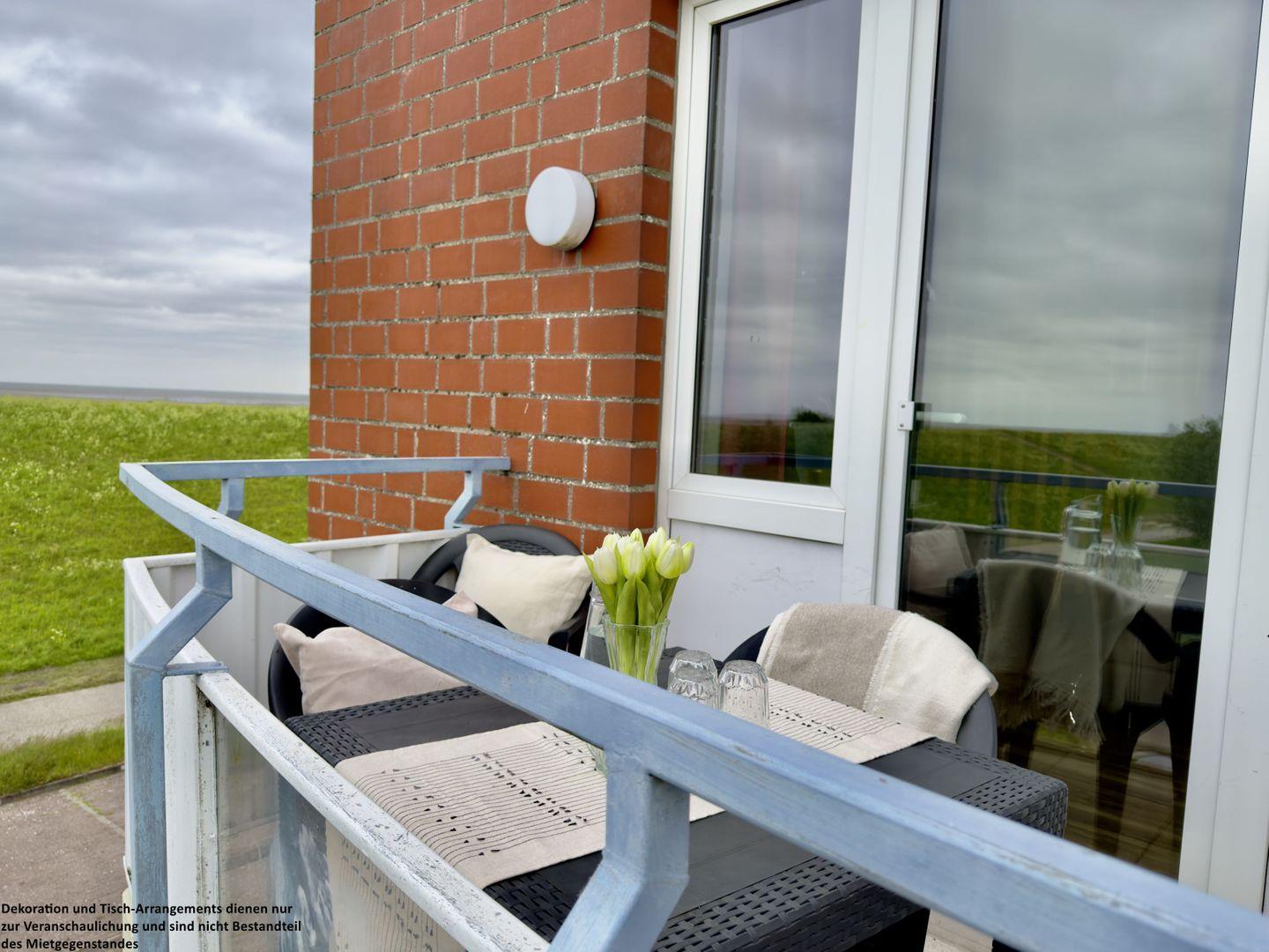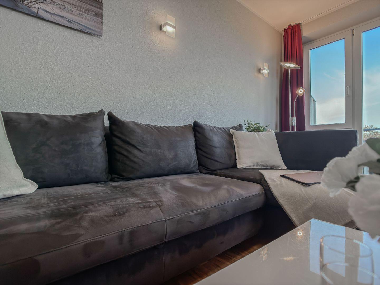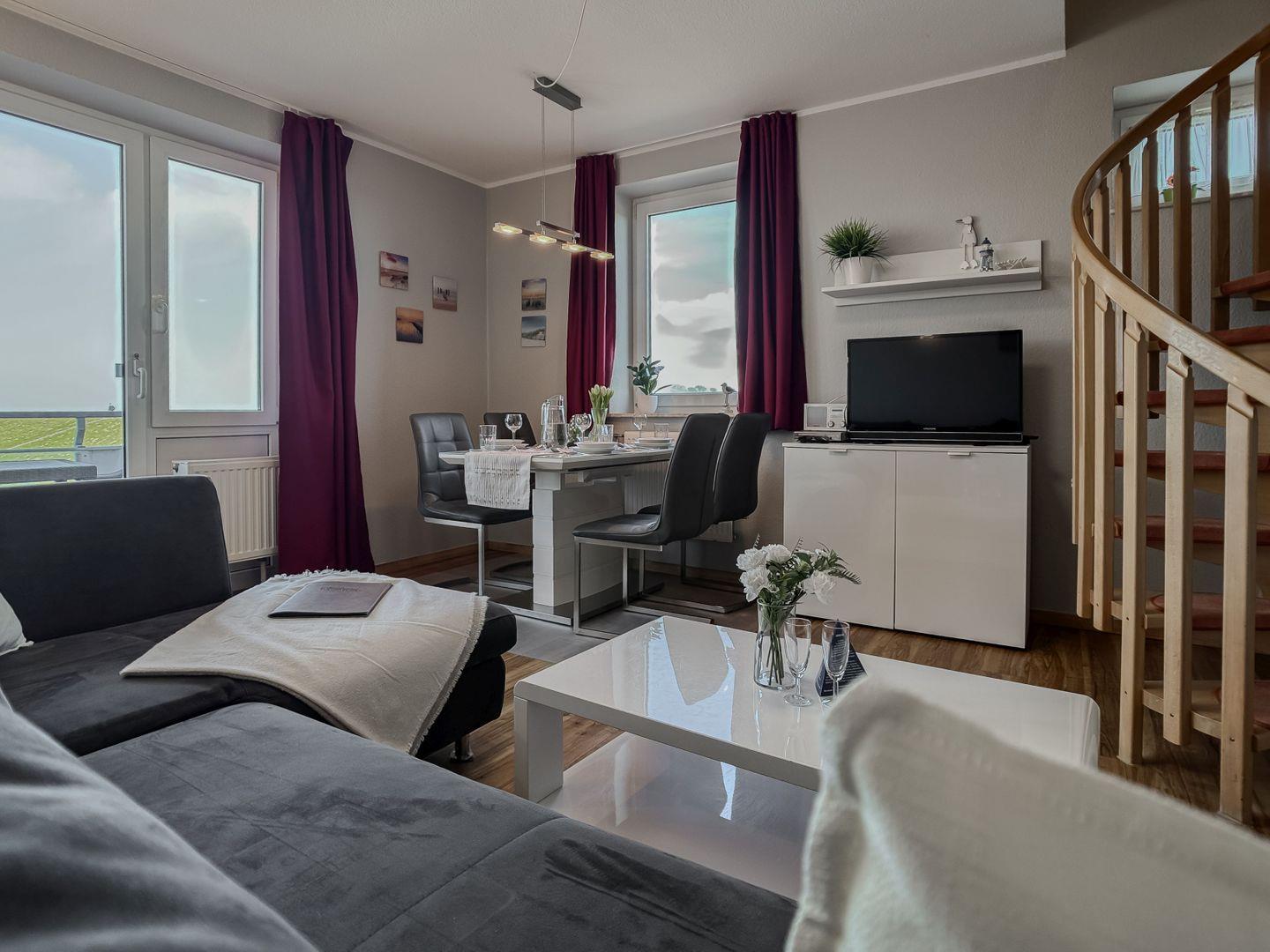 Das angrenzende, lichtdurchflutete Wohnzimmer lädt mit seinem gemütlichen Sofa zu entspannten Abenden ein – sei es bei einem guten Buch, einem Film oder einfach beim Lauschen der Wellen in der Ferne. Die integrierte Essgruppe bietet den idealen Platz für gemeinsame Mahlzeiten oder lustige Spieleabende. Von hier aus gelangen Sie direkt auf den wunderschönen Balkon, wo Sie die frische Nordseeluft genießen und den Blick über das Meer schweifen lassen können.