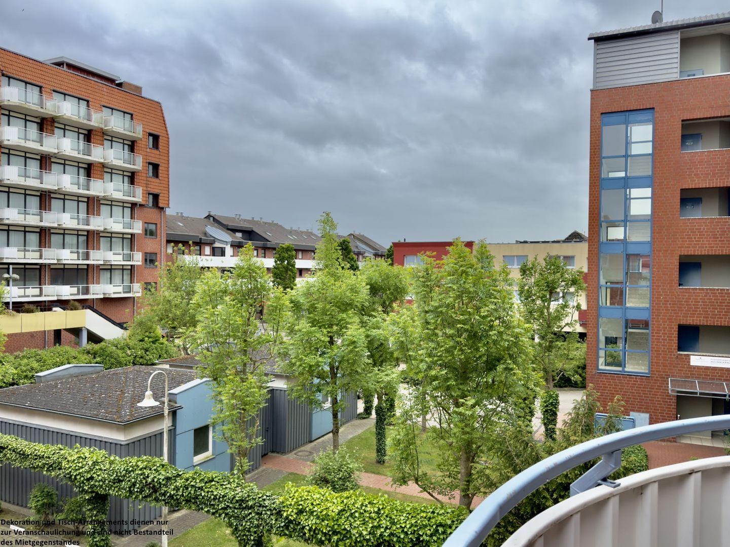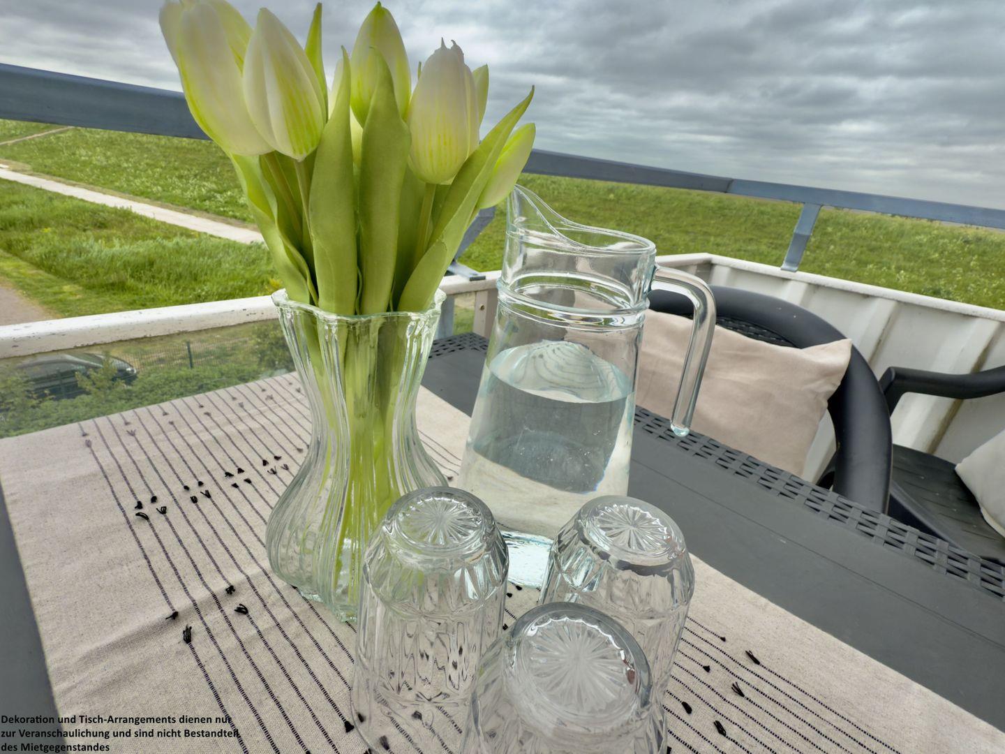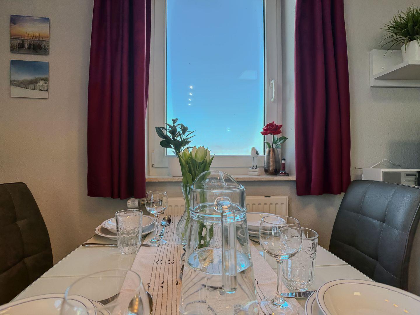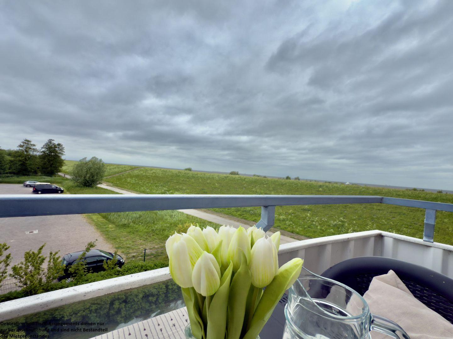 Das angrenzende, lichtdurchflutete Wohnzimmer lädt mit seinem gemütlichen Sofa zu entspannten Abenden ein – sei es bei einem guten Buch, einem Film oder einfach beim Lauschen der Wellen in der Ferne. Die integrierte Essgruppe bietet den idealen Platz für gemeinsame Mahlzeiten oder lustige Spieleabende. Von hier aus gelangen Sie direkt auf den wunderschönen Balkon, wo Sie die frische Nordseeluft genießen und den Blick über das Meer schweifen lassen können.