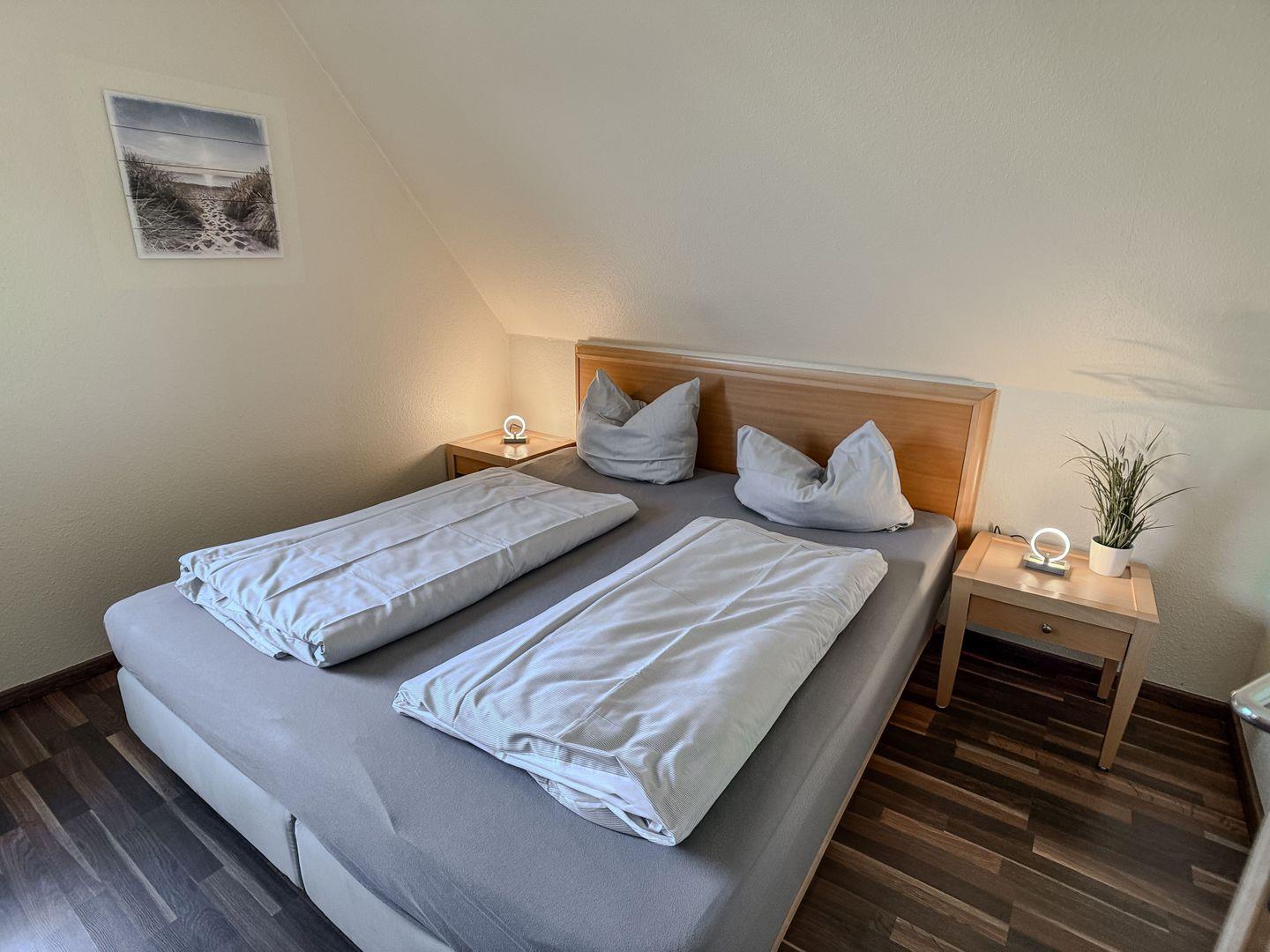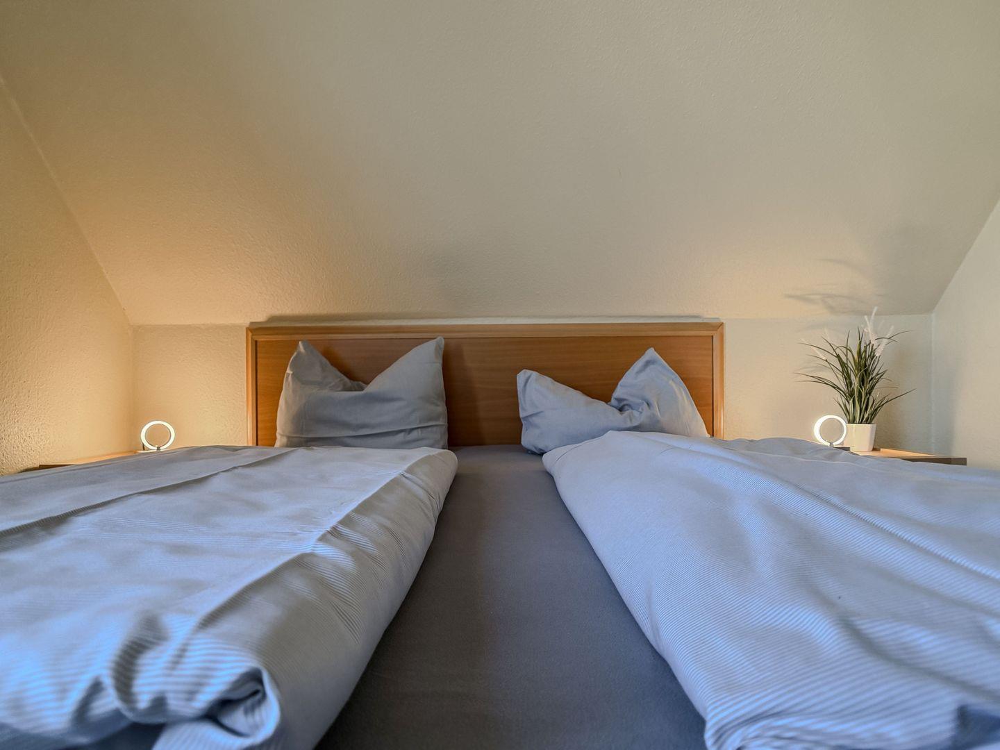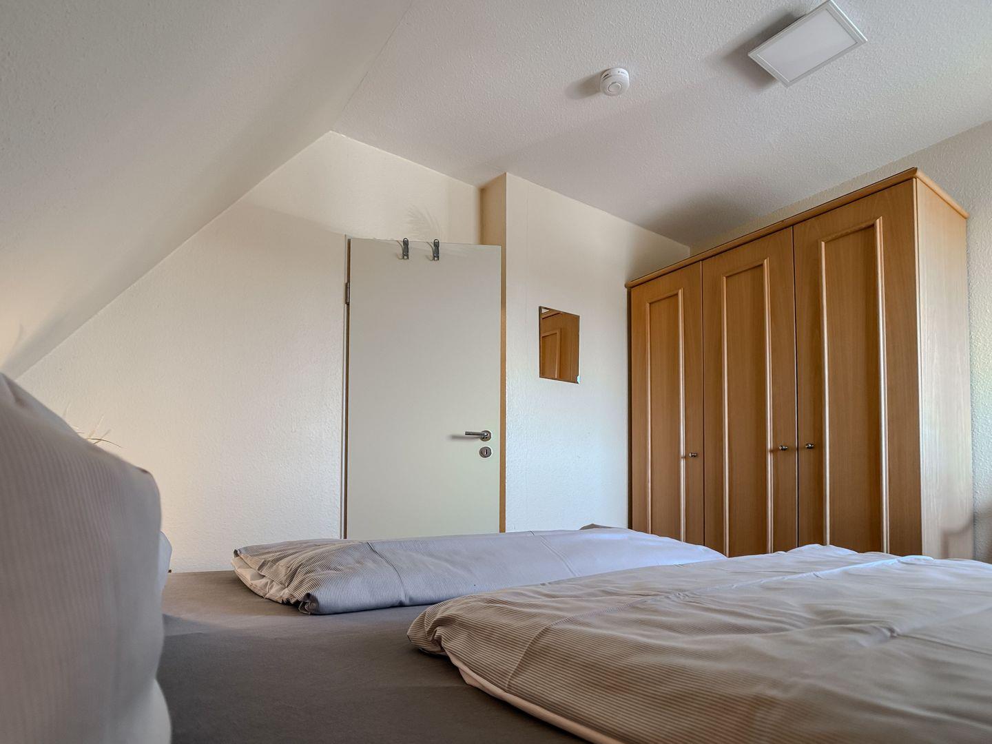 Über eine stabile Holztreppe im Wohnzimmer erreichen Sie die obere Etage, in der sich die beiden liebevoll eingerichteten Schlafzimmer befinden. Das erste Schlafzimmer verfügt über ein gemütliches Doppelbett und einen geräumigen Kleiderschrank, während im zweiten Schlafzimmer zwei Einzelbetten bereitstehen – ideal für Kinder oder mitreisende Freunde. Alle Räume lassen sich für eine erholsame Nachtruhe verdunkeln.
