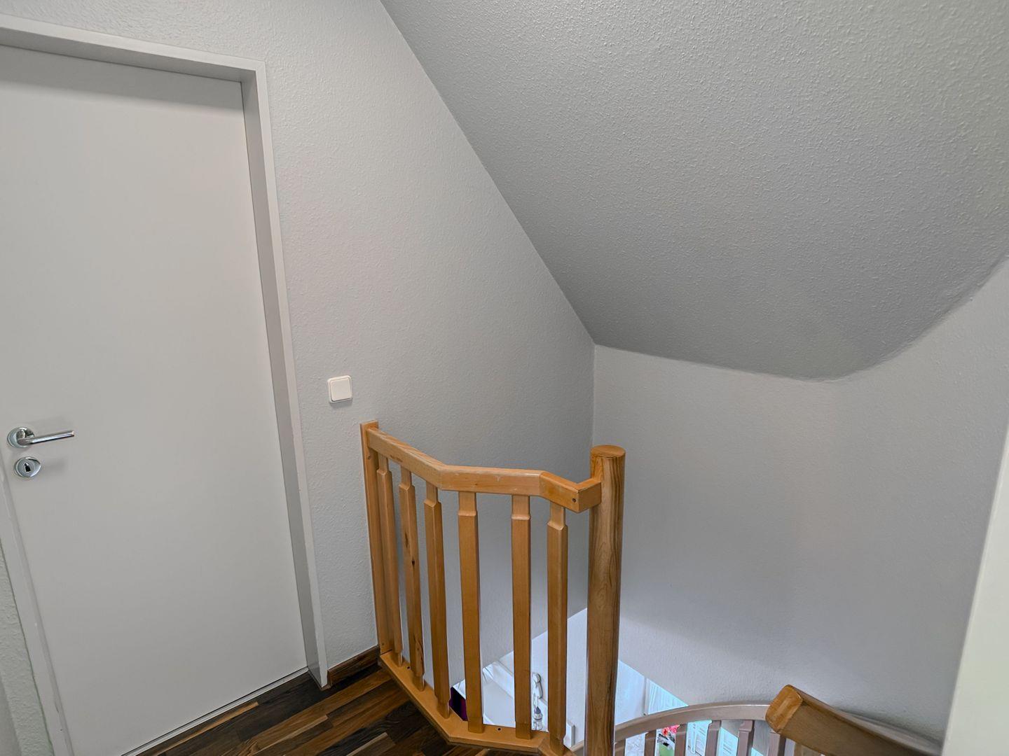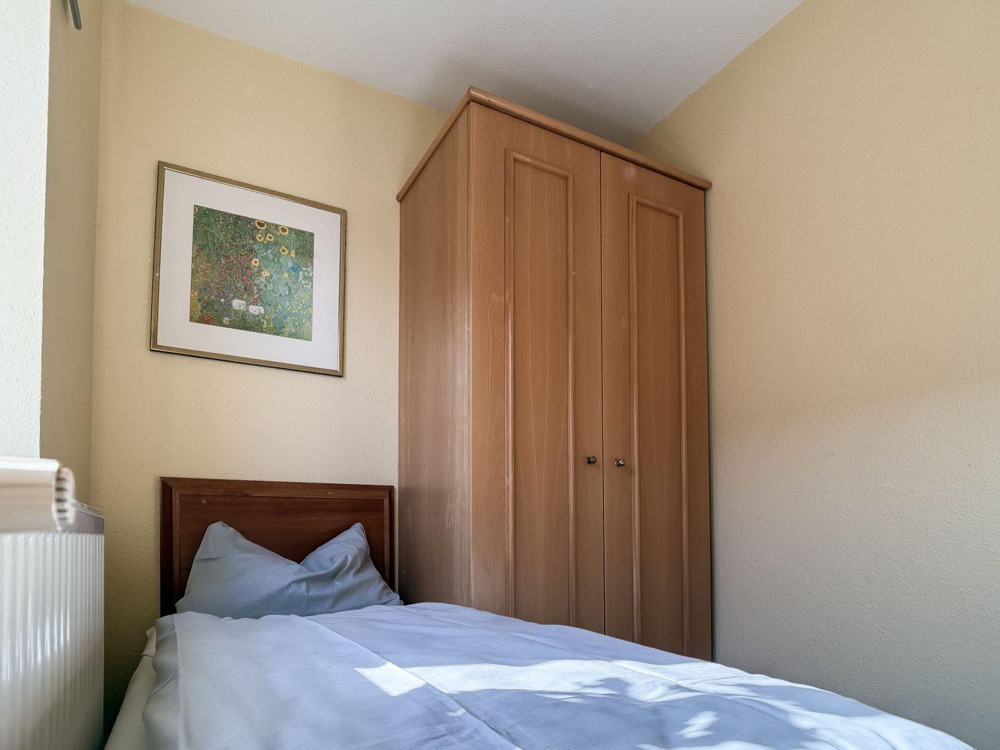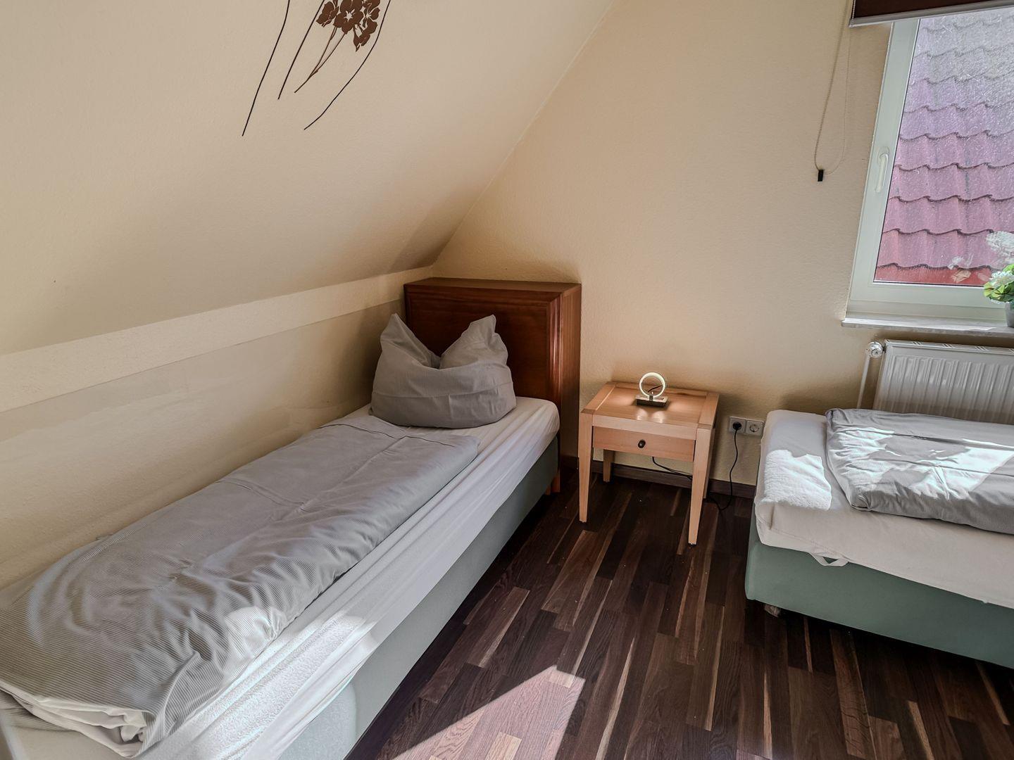 Über eine stabile Holztreppe im Wohnzimmer erreichen Sie die obere Etage, in der sich die beiden liebevoll eingerichteten Schlafzimmer befinden. Das erste Schlafzimmer verfügt über ein gemütliches Doppelbett und einen geräumigen Kleiderschrank, während im zweiten Schlafzimmer zwei Einzelbetten bereitstehen – ideal für Kinder oder mitreisende Freunde. Alle Räume lassen sich für eine erholsame Nachtruhe verdunkeln.