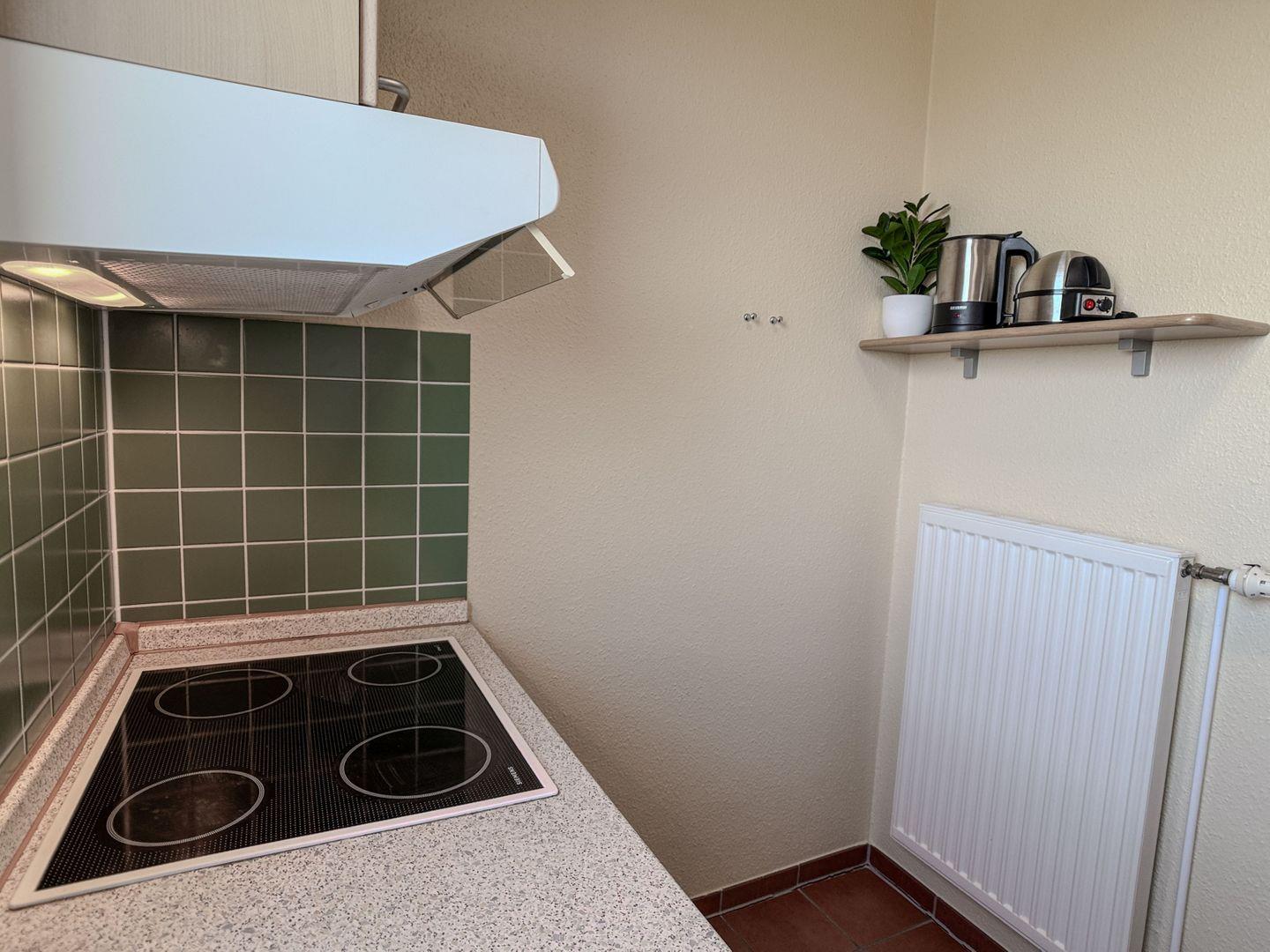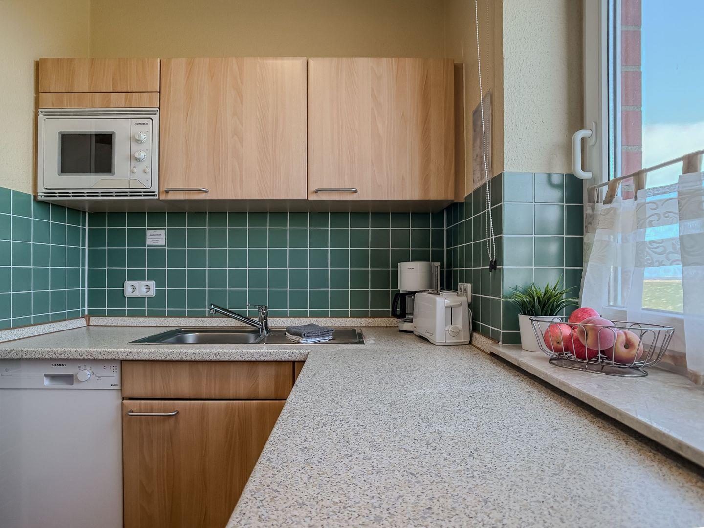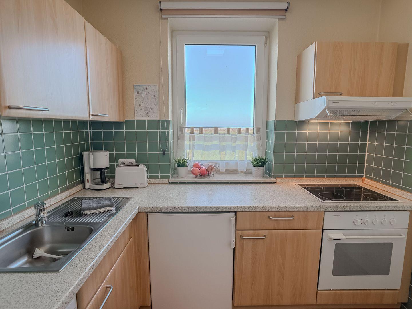 Die vom Flur abgehende Küche ist voll ausgestattet und bietet alles, was Sie für die Selbstversorgung benötigen – damit Sie Ihre Lieblingsgerichte auch im Urlaub ganz entspannt zubereiten können.