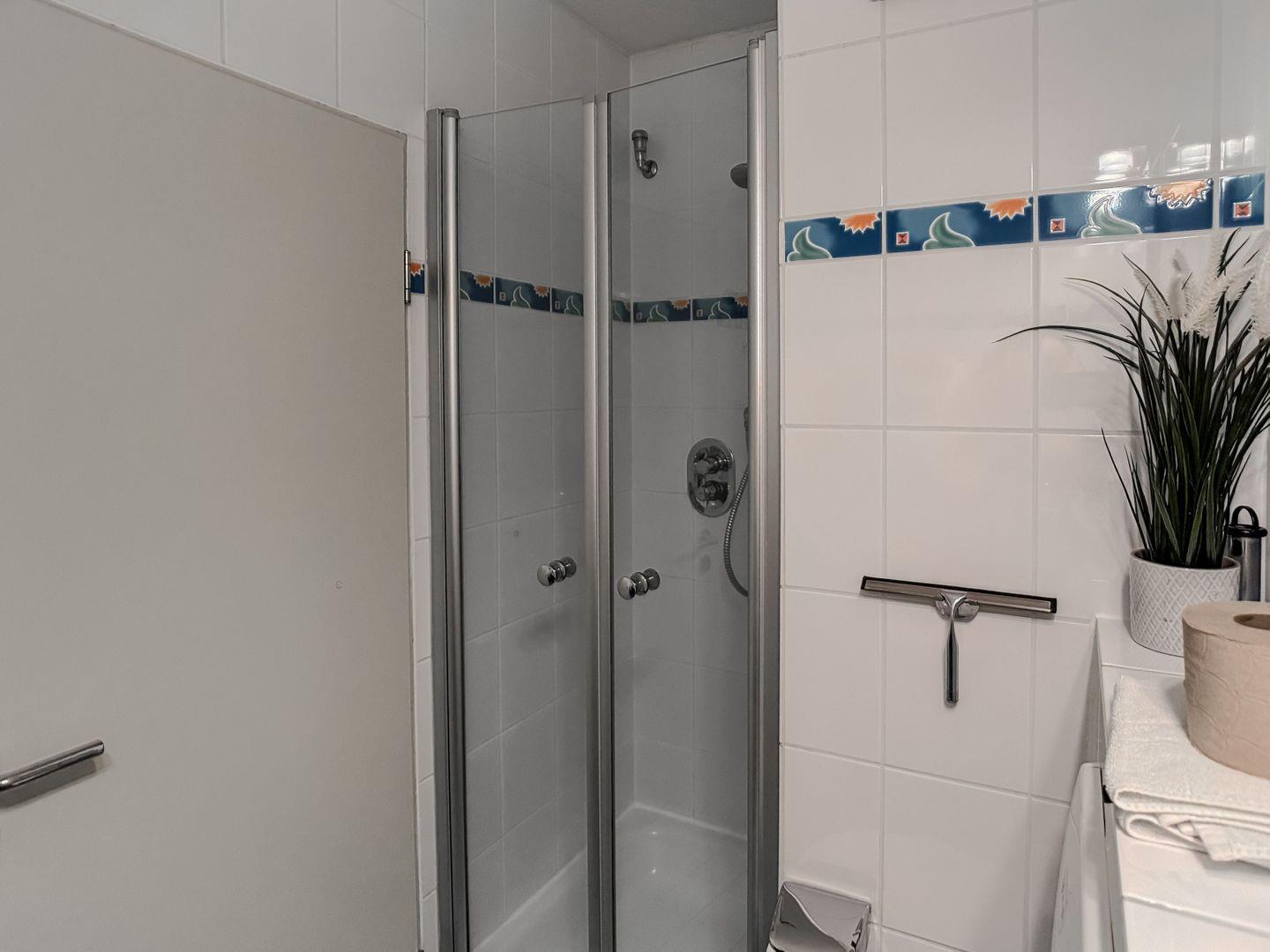 Das moderne, hell geflieste Badezimmer bietet ausreichend Platz für Ihre tägliche Pflege und sorgt mit seiner freundlichen Atmosphäre für einen angenehmen Start in den Tag.