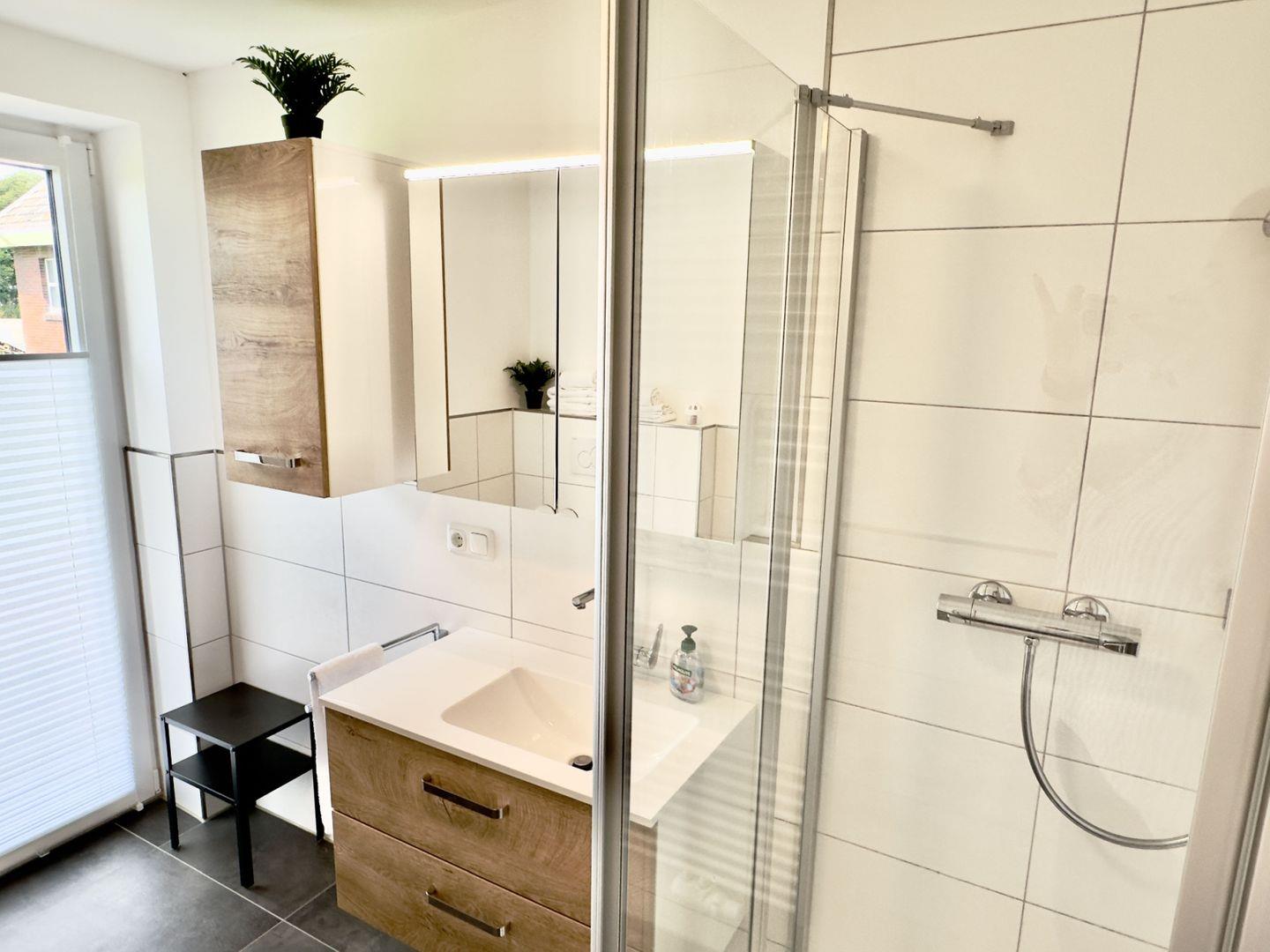 Das helle Tageslichtbad begeistert mit einer großzügigen, barrierefreien Dusche und einem praktischen Spiegelschrank. Der Waschbeckenunterschrank bietet zusätzlichen Stauraum für Ihre persönlichen Dinge.