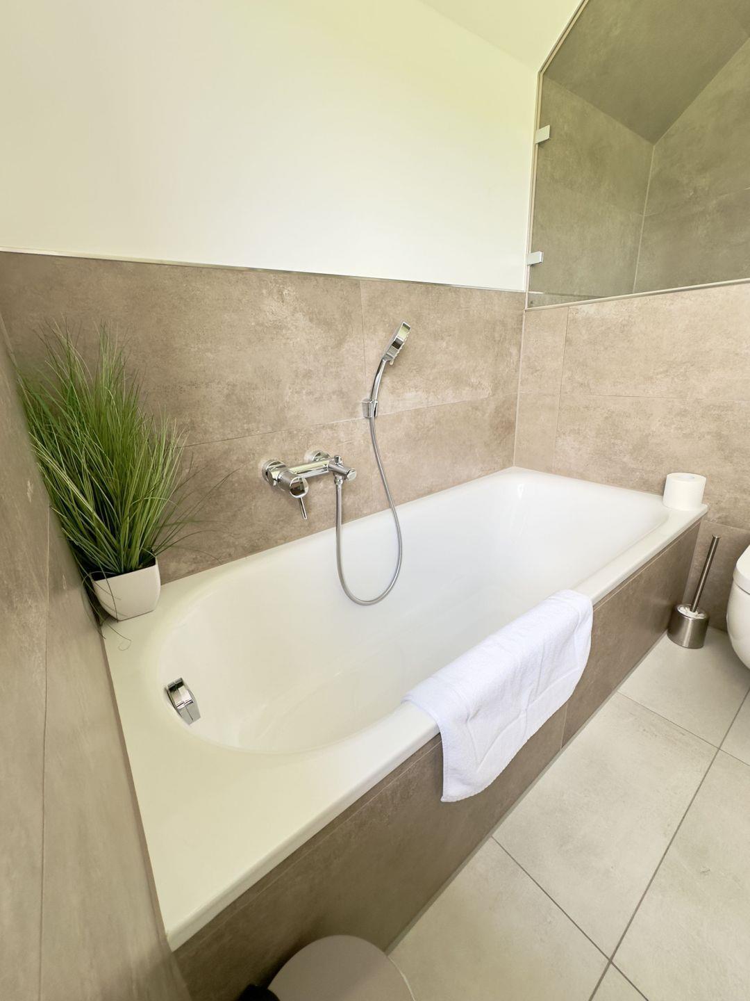 Das großzügige Badezimmer mit ebenerdiger Dusche und Badewanne verwandelt sich an stürmischen oder regnerischen Tagen in Ihren persönlichen Wellnessbereich.