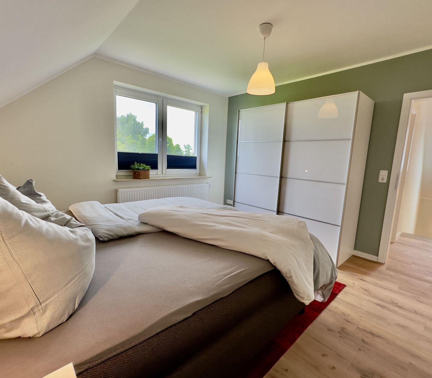 Das Schlafzimmer mit Boxspringbett und geräumigem Kleiderschrank bietet Ihnen den Raum, den Sie für einen erholsamen Aufenthalt benötigen. Im zweiten Schlafzimmer finden Sie ein gemütliches Doppelbett und einen praktischen Kleiderschrank.
