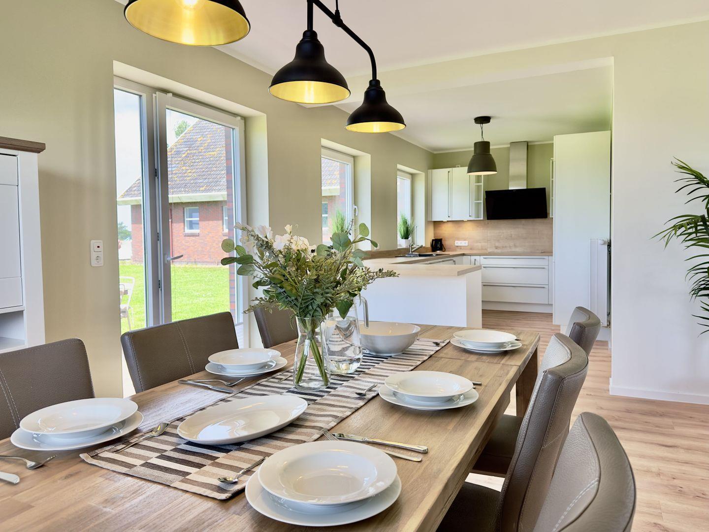 Der große Esstisch wird zum Mittelpunkt, an dem nicht nur Mahlzeiten, sondern auch gesellige Stunden ihren Platz finden.