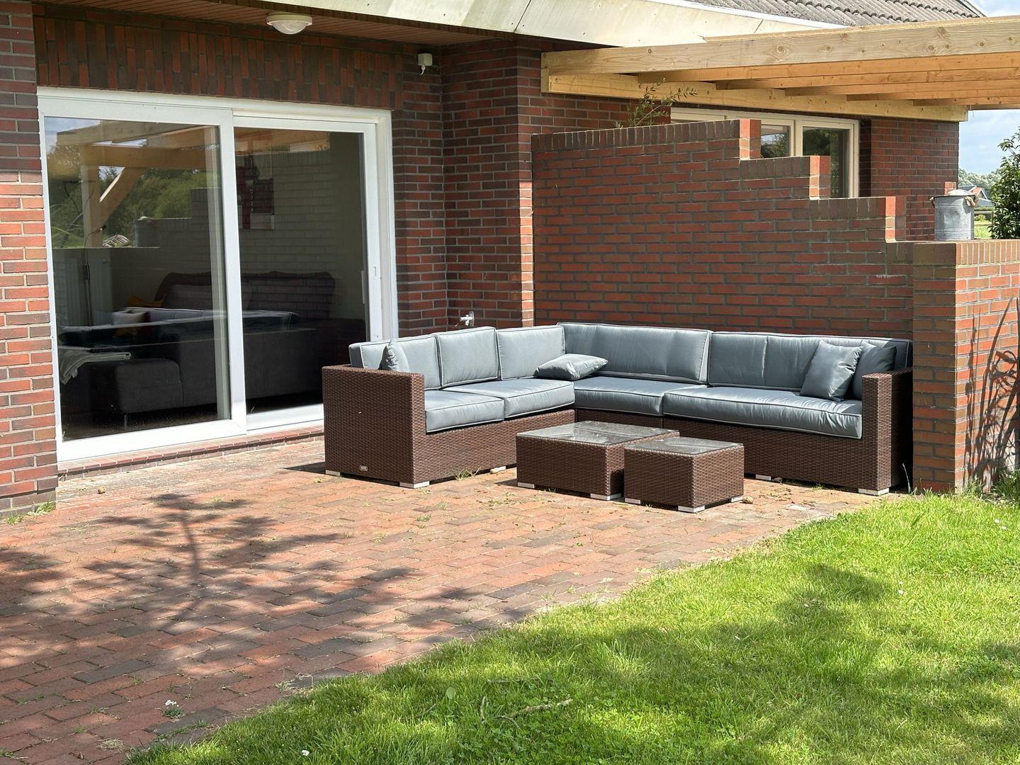 Die Terrasse lädt dazu ein, den Tag entspannt ausklingen zu lassen, während die gemütliche Sofaecke im hinteren Bereich des Hauses eine zusätzliche Rückzugsmöglichkeit bietet. Auch hier genießen Sie das behagliche Flair des Kamins.