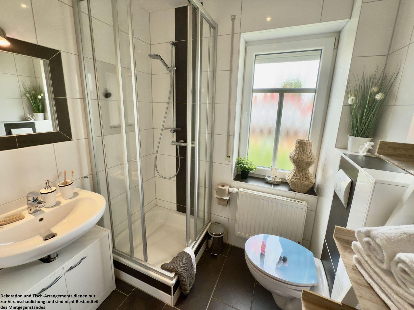 Das moderne Badezimmer begeistert mit Helligkeit und ist mit Dusche, Waschbecken und Spiegel ausgestattet.