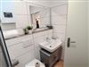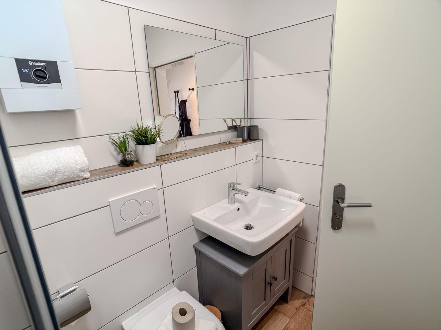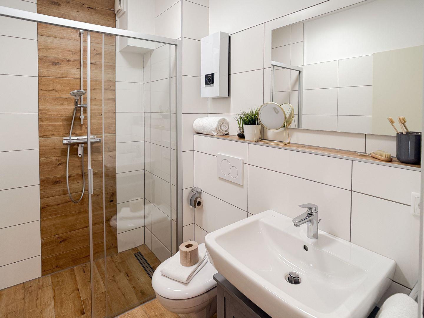 Das moderne Badezimmer lädt mit einer geräumigen, bodengleichen Dusche und einem großen Spiegel zu einer angenehmen Hygiene ein.