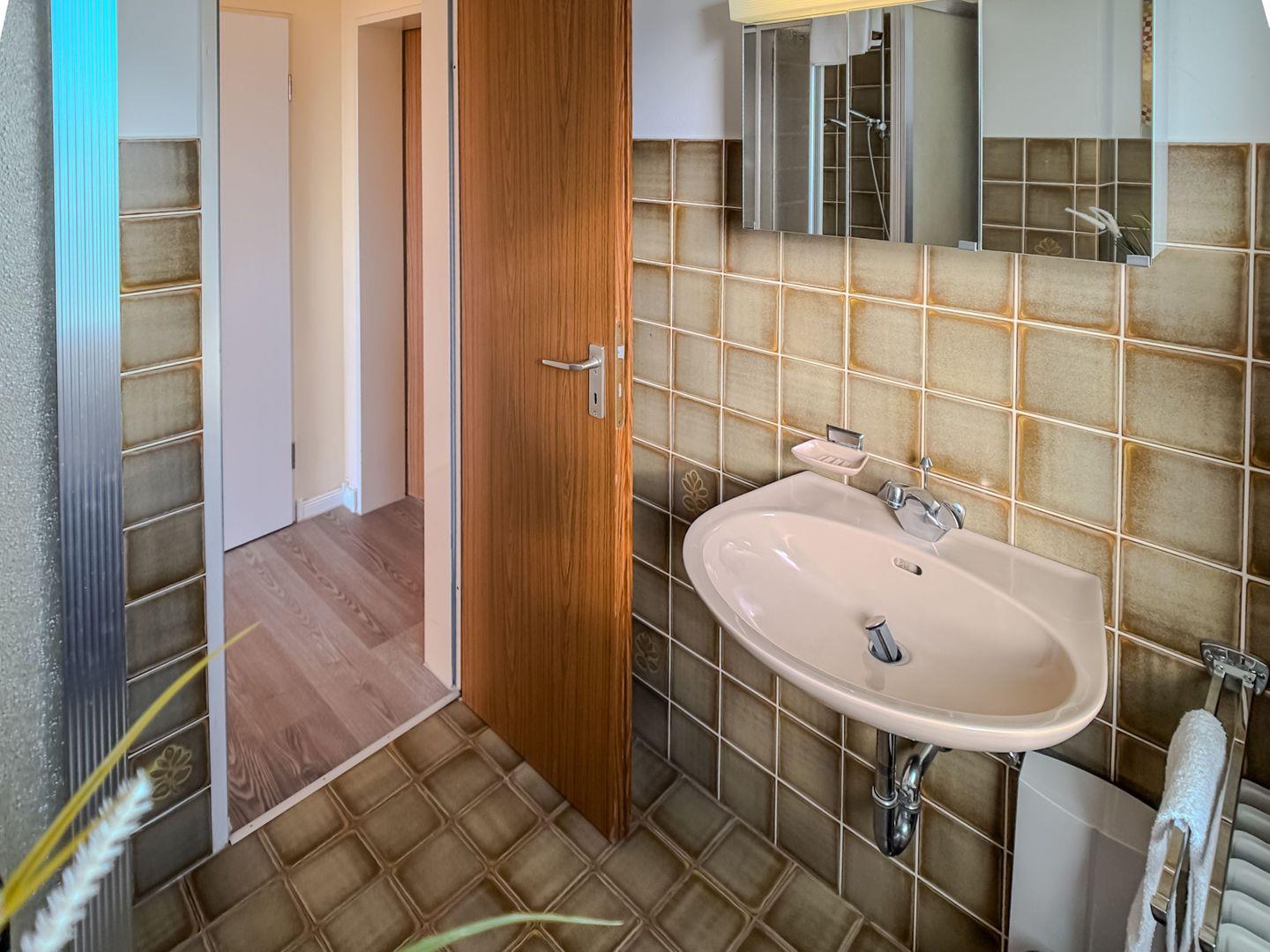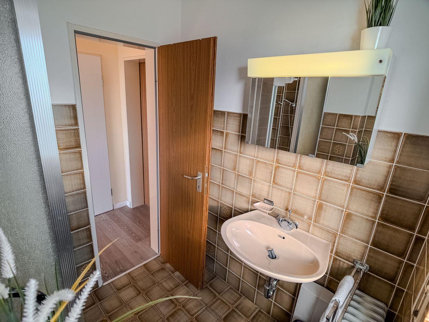 Das Badezimmer – schlicht, funktional und ehrlich – bietet Ihnen alles, was Sie für die tägliche Pflege brauchen. Kein überflüssiger Schnickschnack, sondern praktische Klarheit, die Ihnen Raum für das Wesentliche lässt: sich selbst.