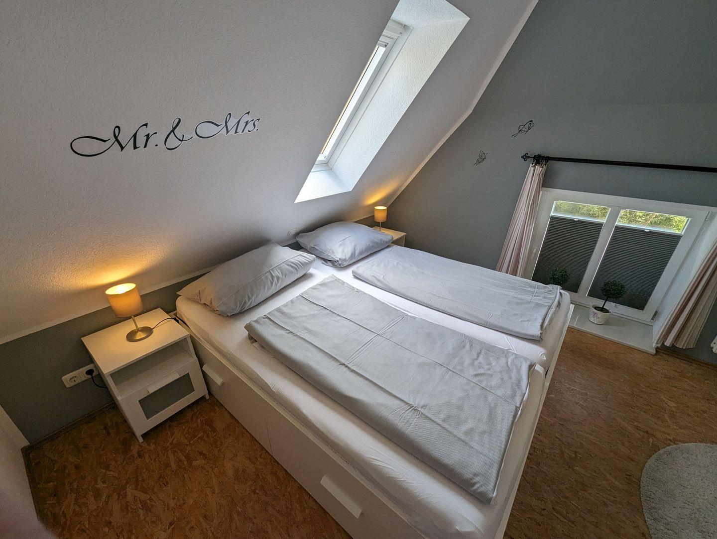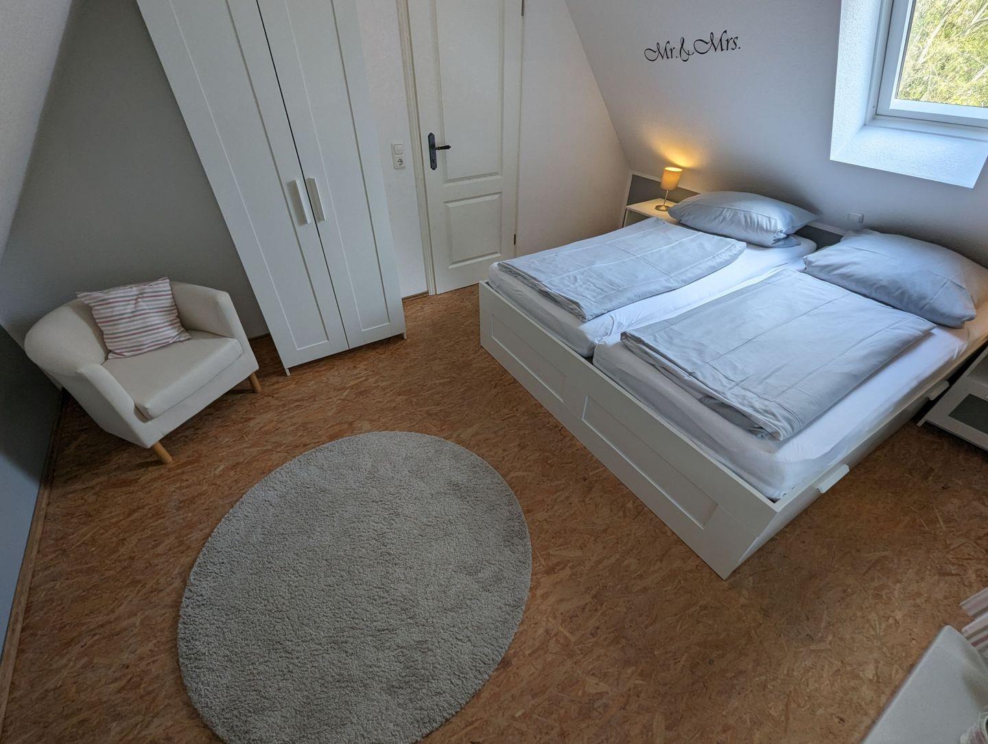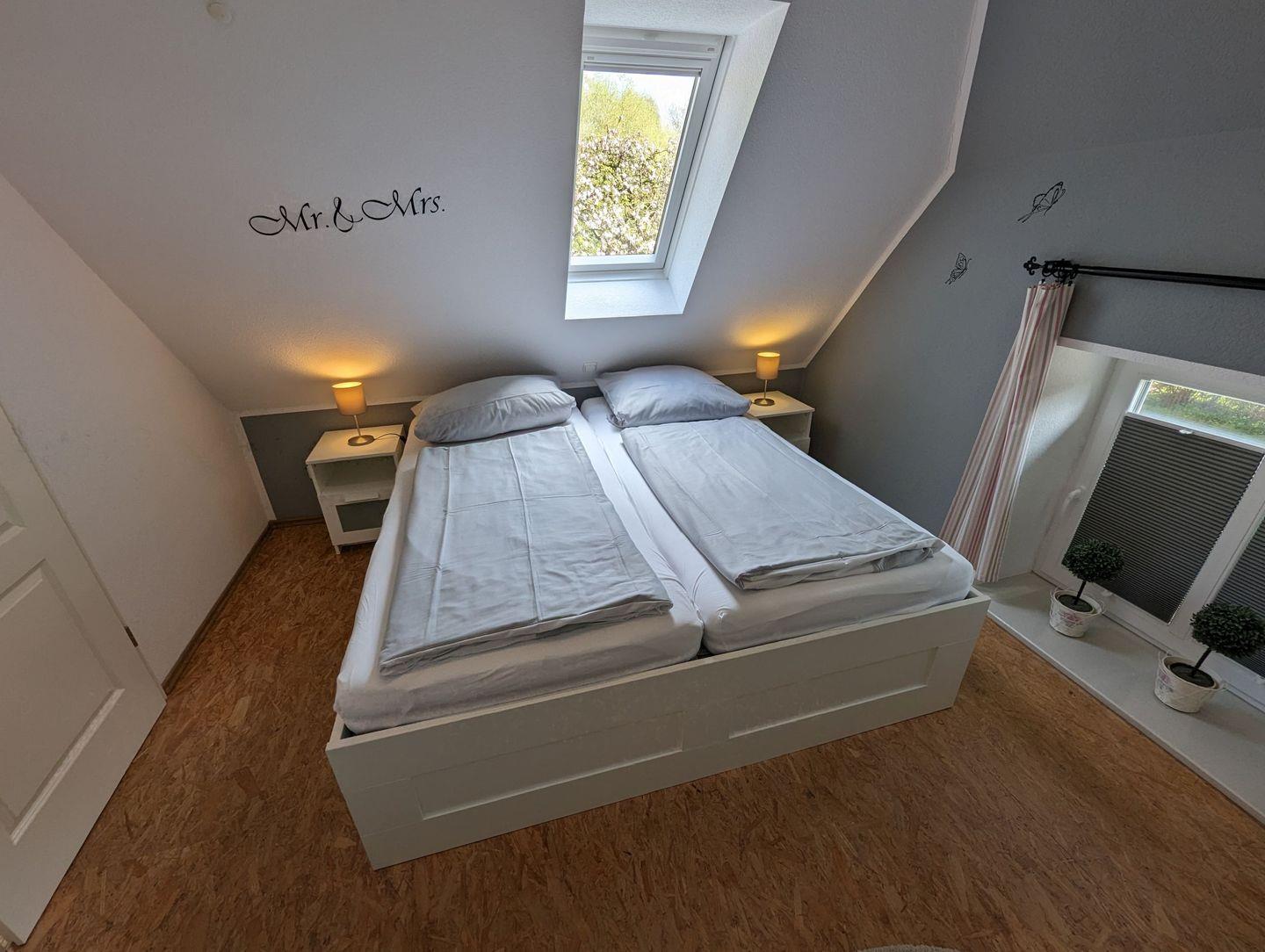 Eine stabile Treppe führt Sie in das Obergeschoss, wo Sie in den behaglich eingerichteten Schlafzimmern zur Ruhe kommen können. Diese bieten den perfekten Rückzugsort nach einem erlebnisreichen Tag.