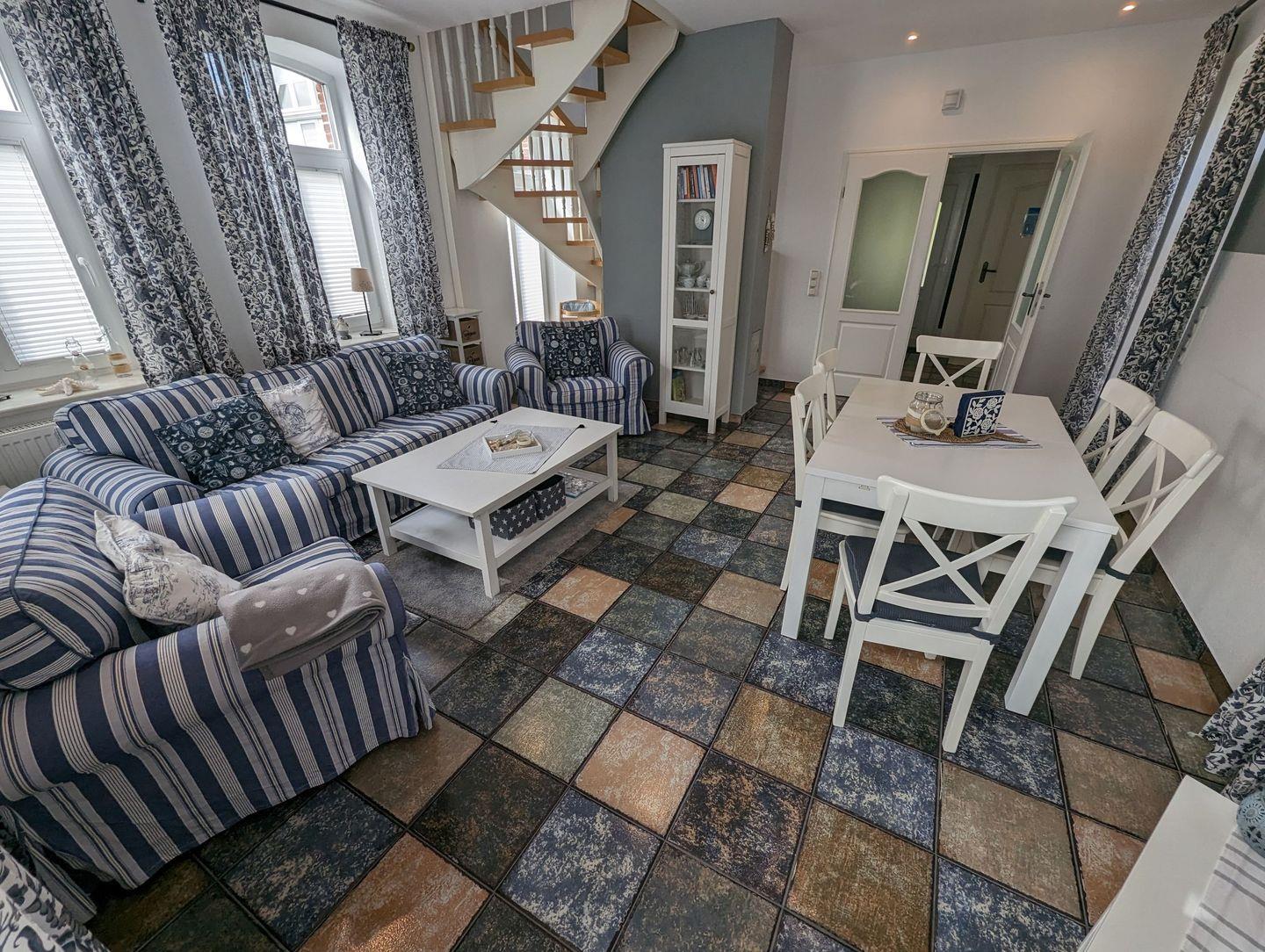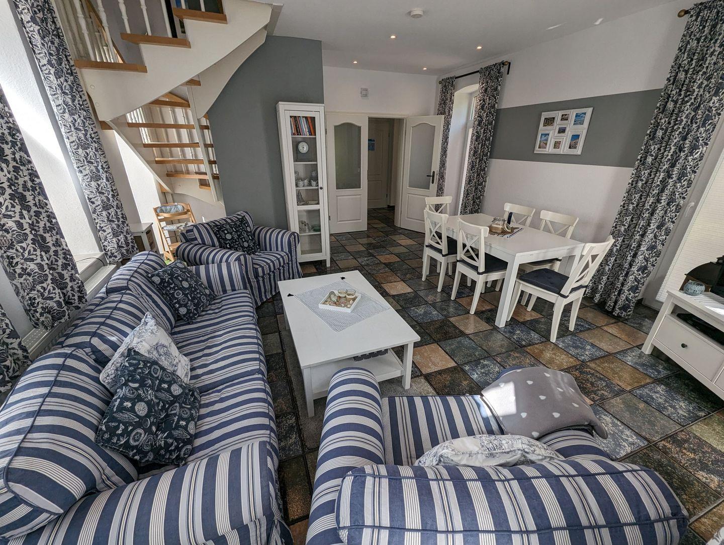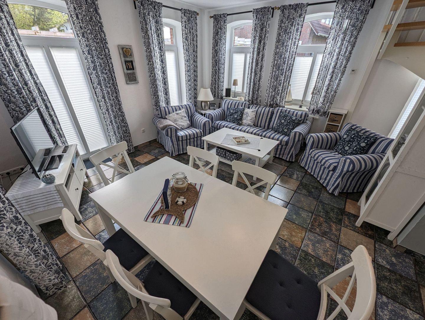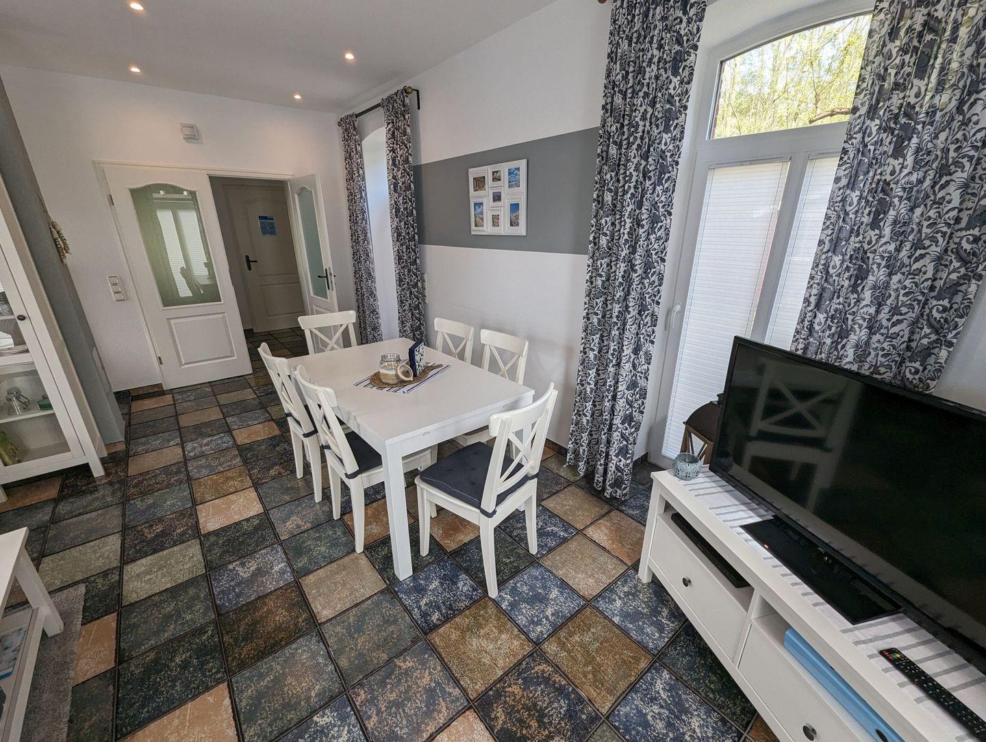 Hier finden Sie eine gemütliche Sitzecke für entspannte Stunden und eine Essecke, die perfekt für gemeinsame Mahlzeiten oder gesellige Spieleabende ist.