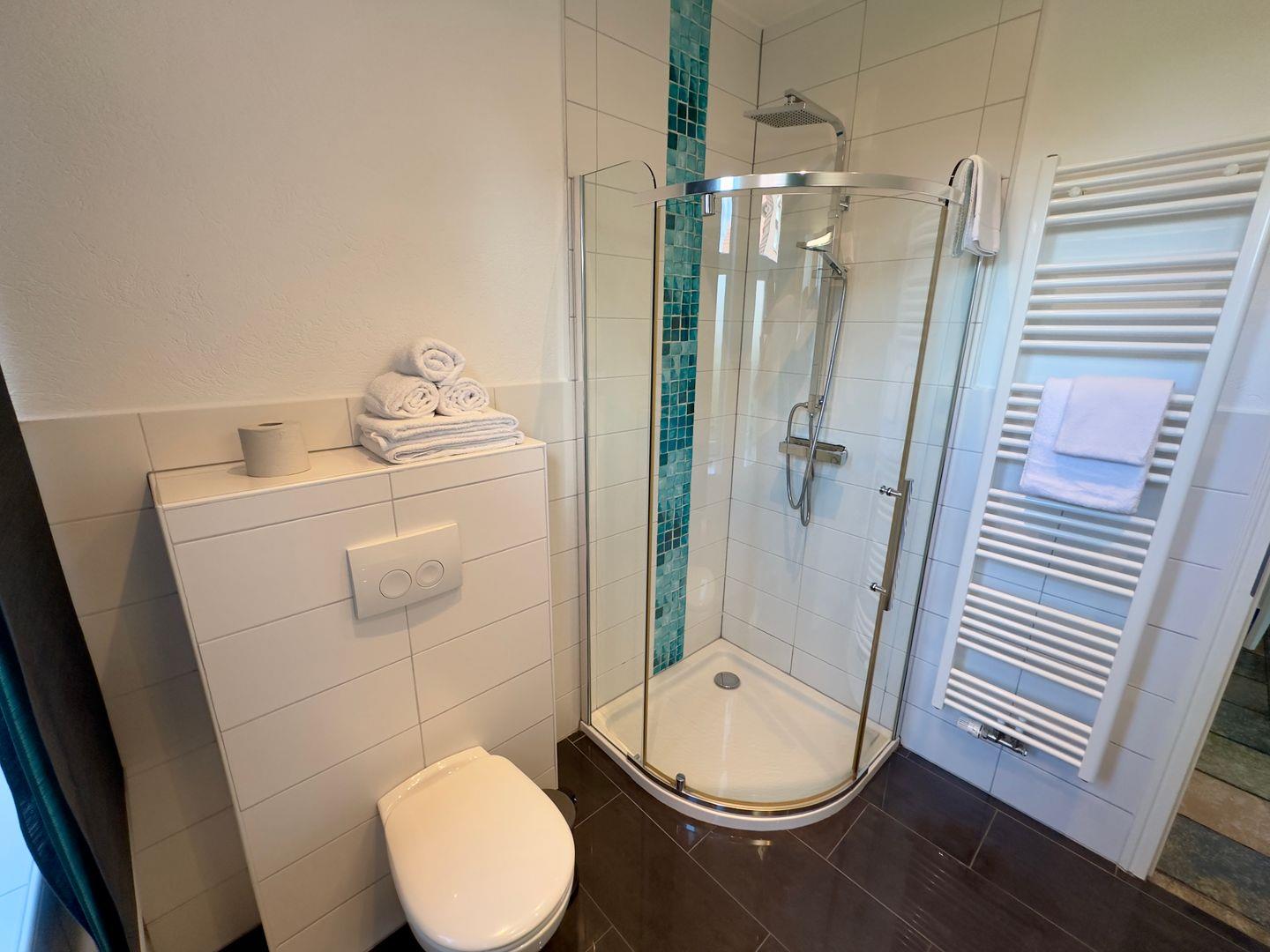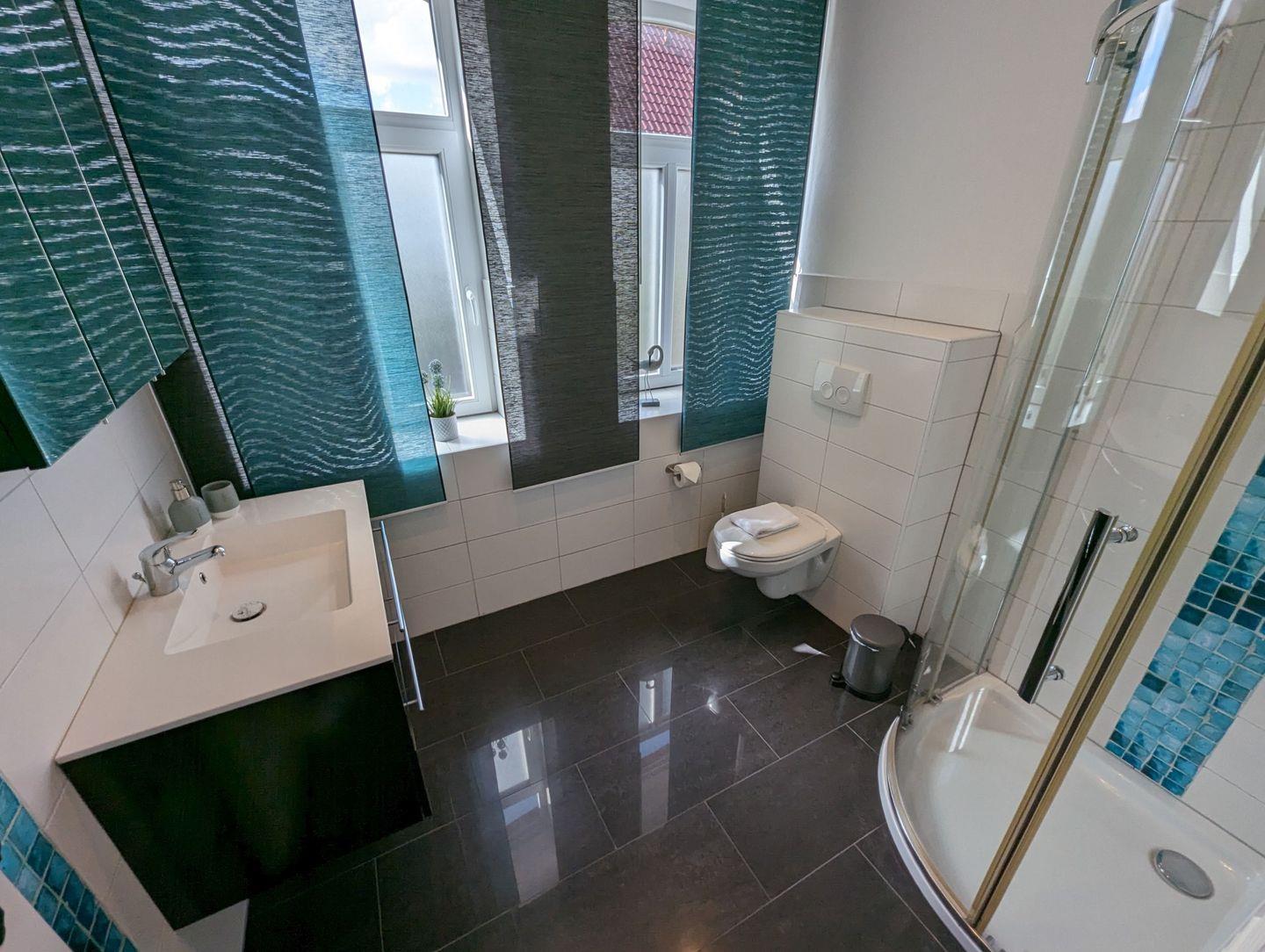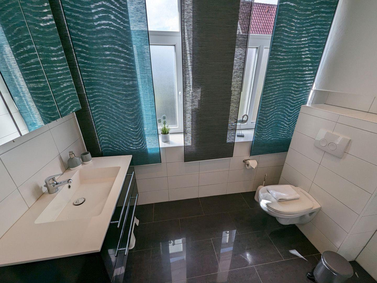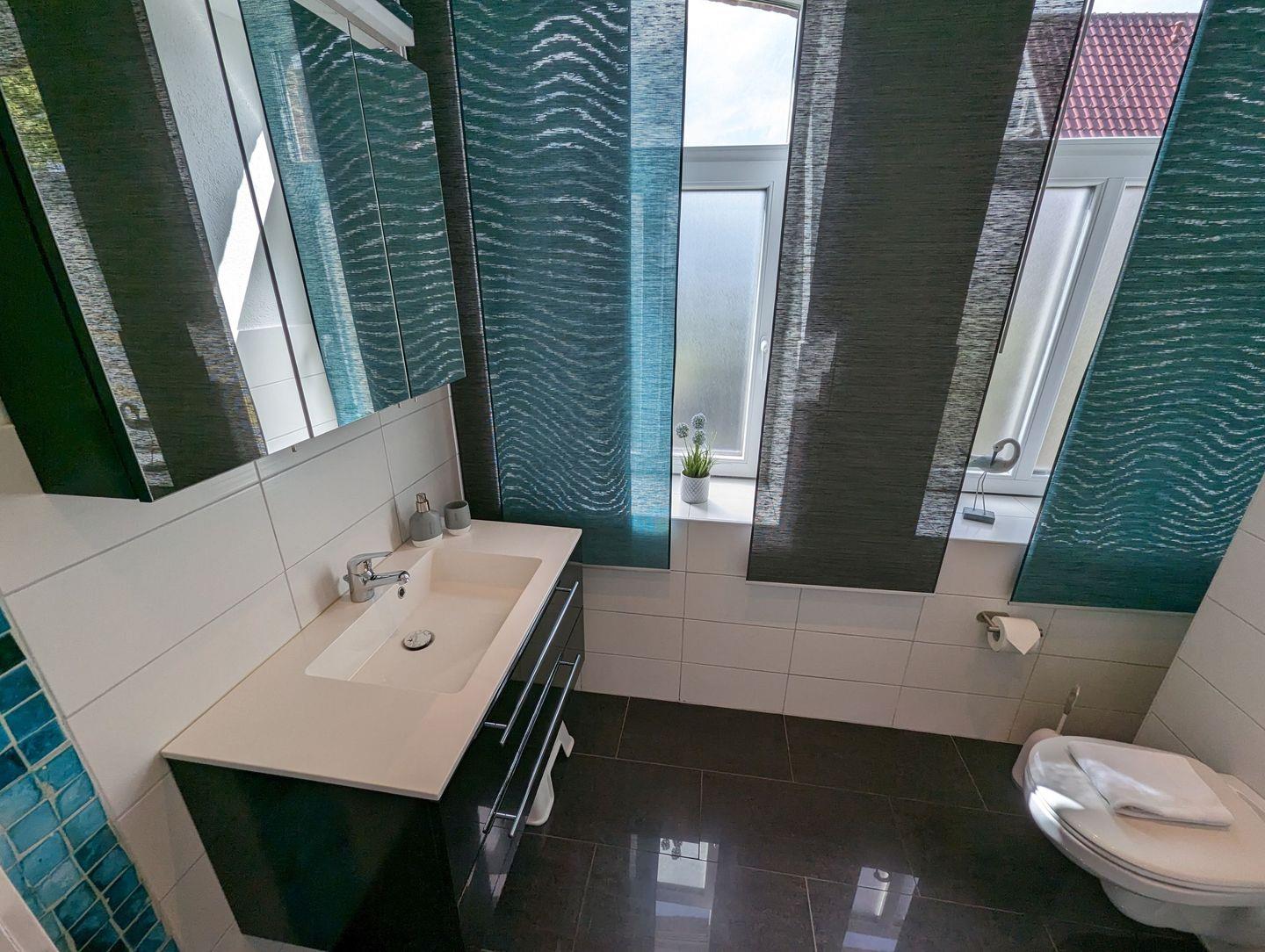 Das helle Tageslichtbad überrascht mit modernem Design und einem Hauch maritimen Flairs.