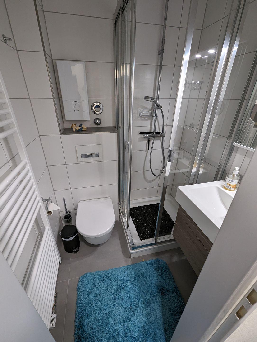 Das helle und moderne Badezimmer bietet alles für Ihre morgendliche Hygiene, während die voll ausgestattete Küche über den Flur leicht erreichbar ist und Ihnen die Möglichkeit zur Selbstversorgung bietet. Im separaten Schlafzimmer findet eine dritte Person Platz, und der große Kleiderschrank bietet ausreichend Stauraum für Ihre persönlichen Dinge.
