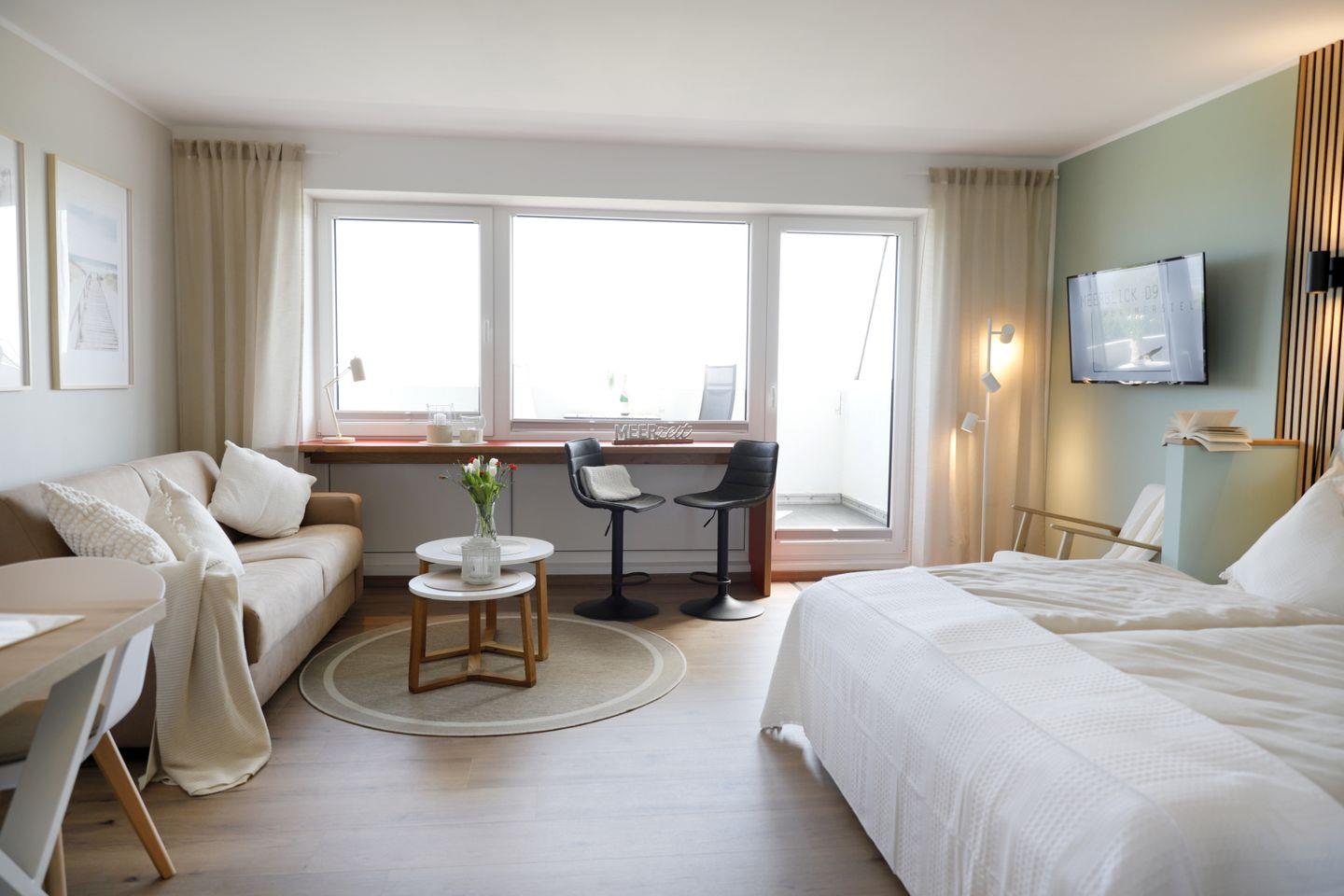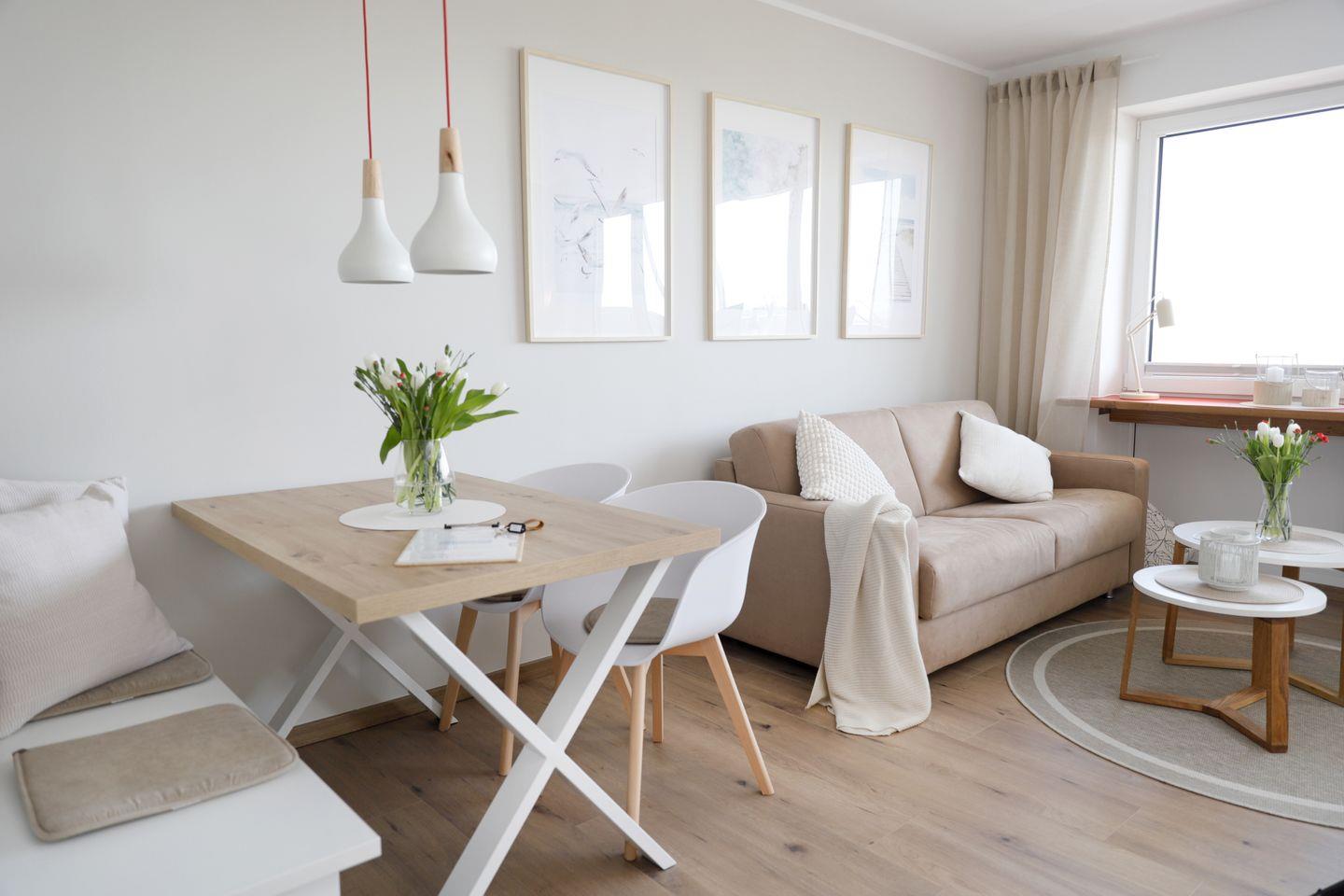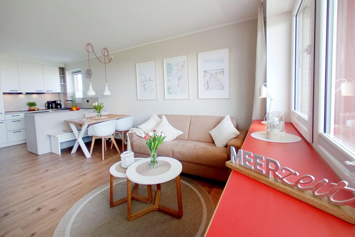 Eine großzügige Sitzecke grenzt direkt an die Küche, alternativ können Sie Ihre Mahlzeit oder einen frischen Kaffee von unserem persönlichen Lieblingsplatz aus - einem 2,5 m langen Bartisch mit Hochstühlen direkt entlang der Fensterfront mit Meerblick - genießen!