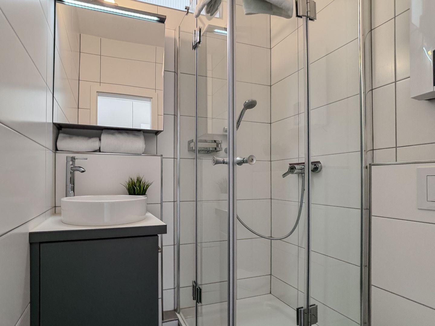 Das moderne, zweckmäßige Badezimmer ist vom Flur aus erreichbar und rundet das Wohlfühlpaket dieser einzigartigen Ferienwohnung ab.