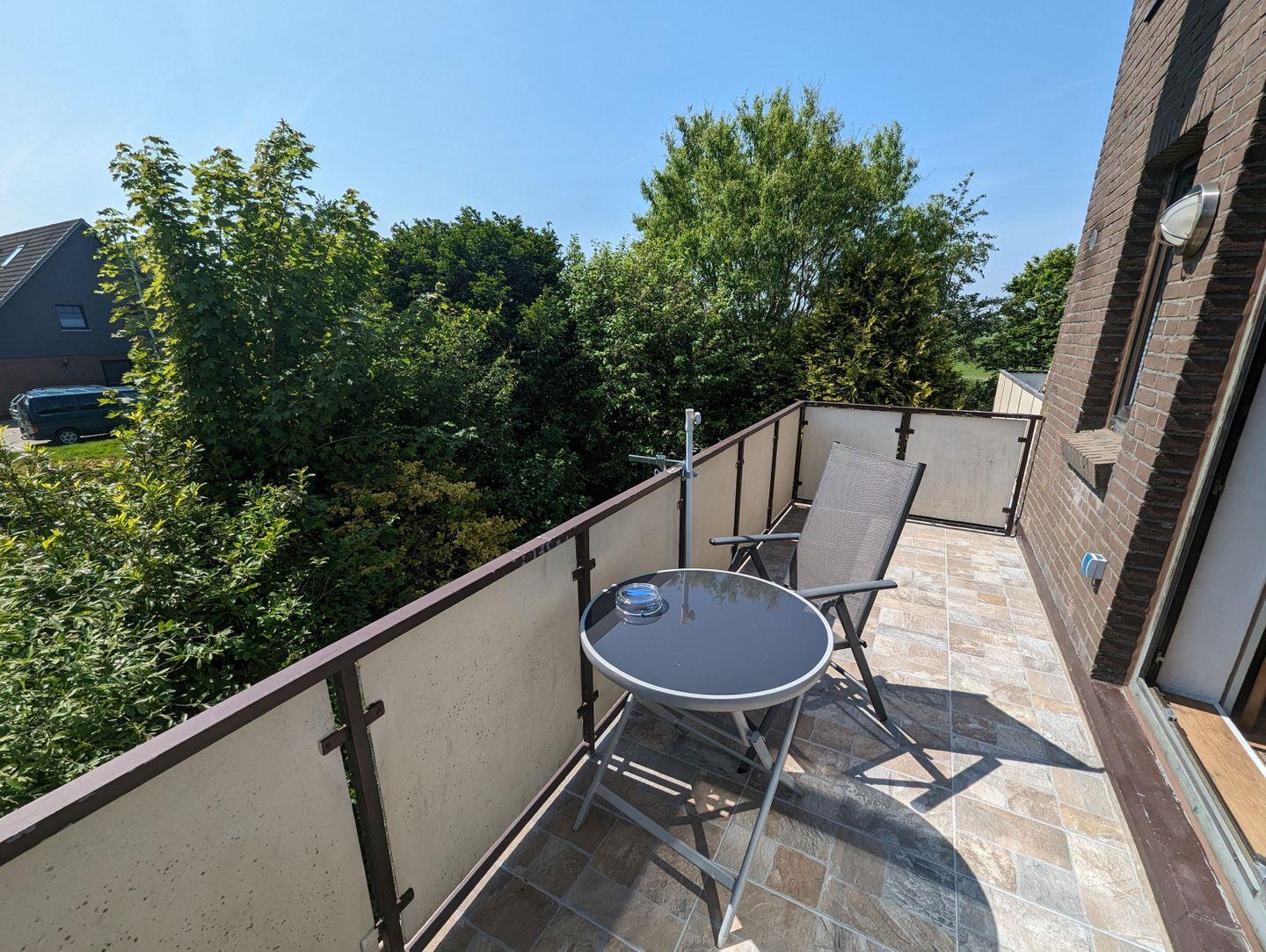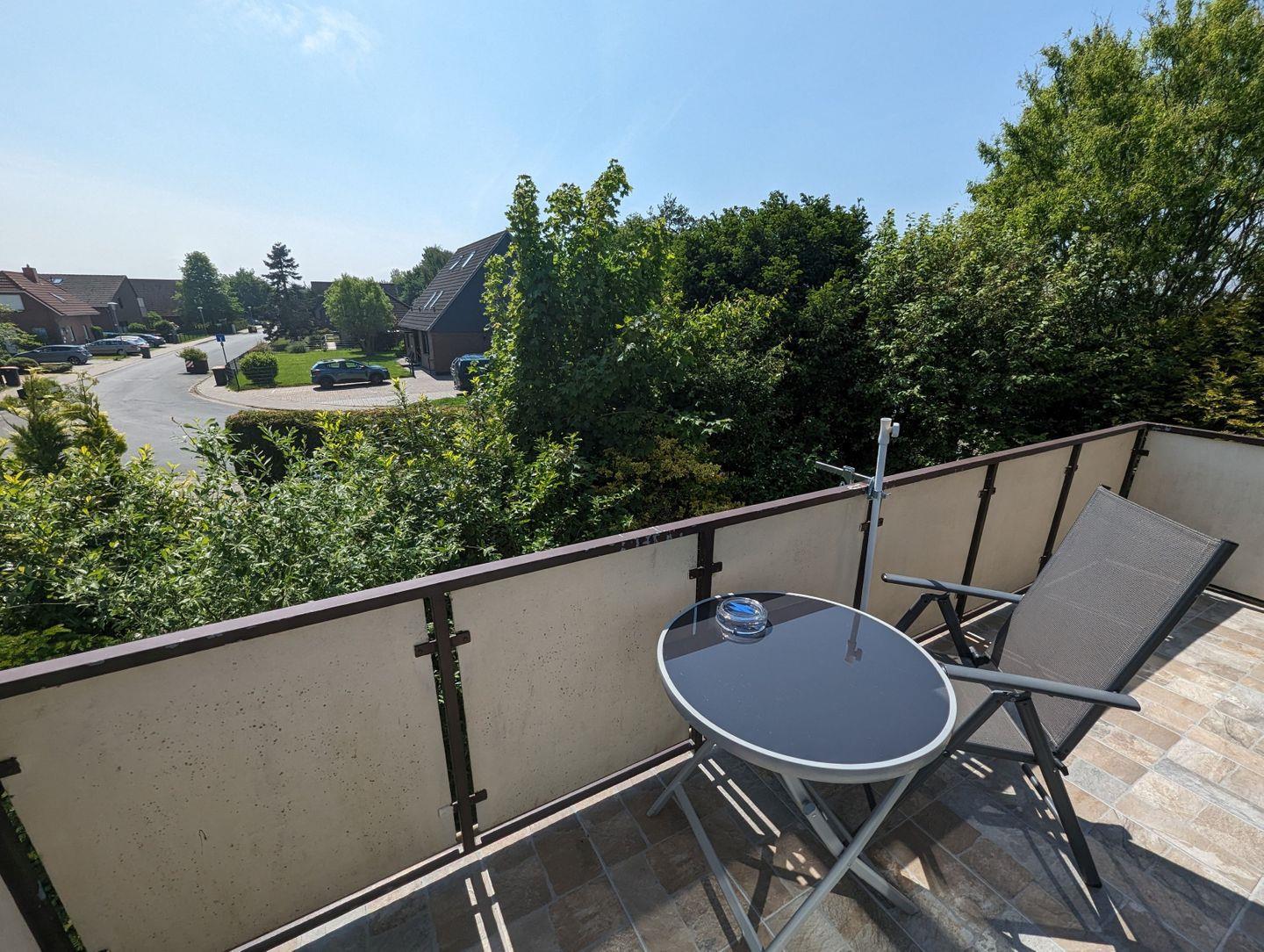 Treten Sie auf den großzügigen und einladenden Balkon hinaus, umgeben von der Schönheit der Natur. Hier können Sie die frische Luft genießen und den Blick auf die grünen Bäume schweifen lassen – der ideale Ort für morgendliche Kaffeerunden oder abendliche Entspannung.