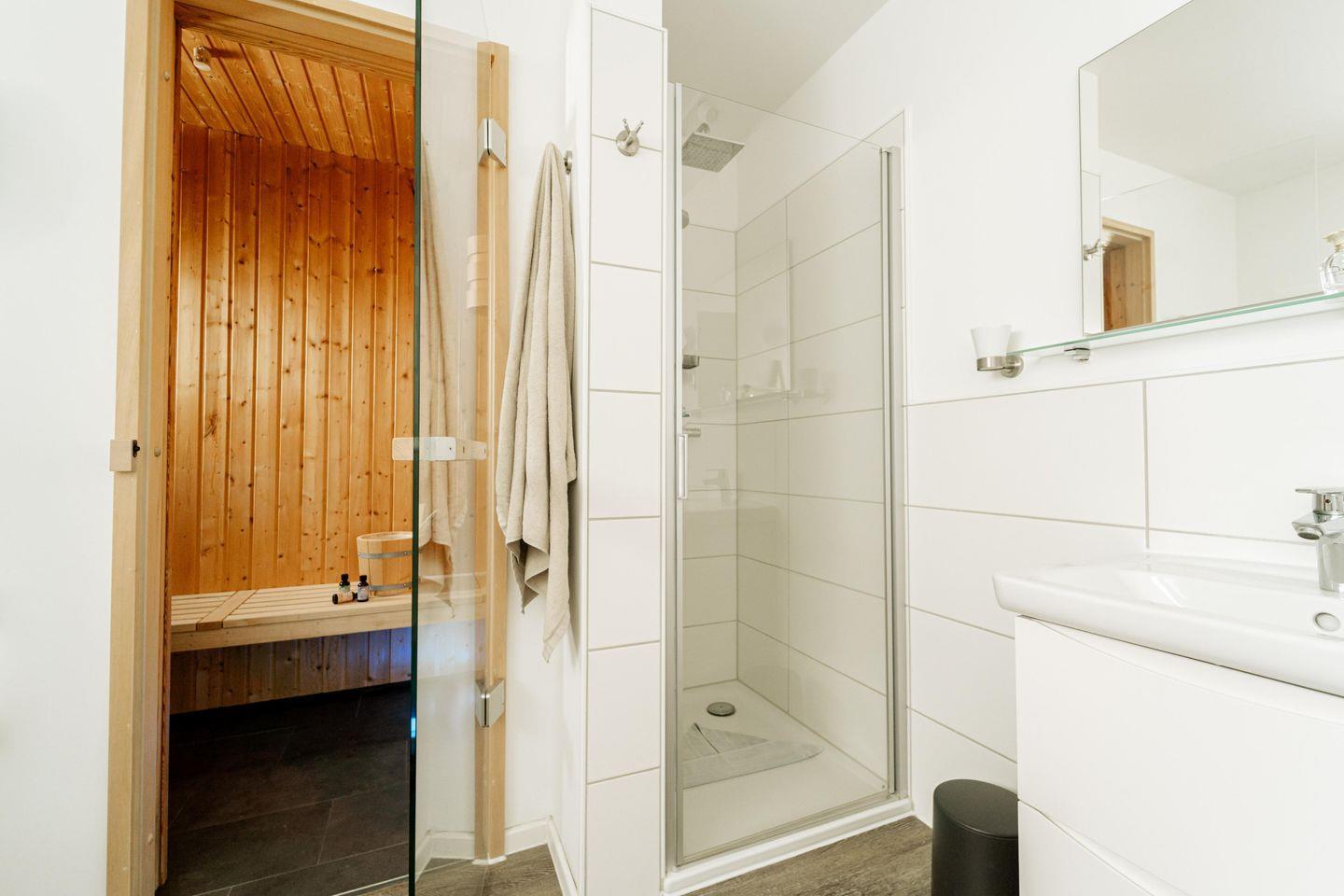 Starte den Tag unter einer erfrischenden Dusche und genieße abends nach einem langen Strandspaziergang die wohltuende Wärme Deiner privaten Sauna. Entspanne Dich anschließend in der Badewanne und lasse den Tag perfekt ausklingen. Ein Fön und ein Kosmetikspiegel runden das Wohlfühlerlebnis ab und sorgen dafür, dass Du Dich rundum wohlfühlst.