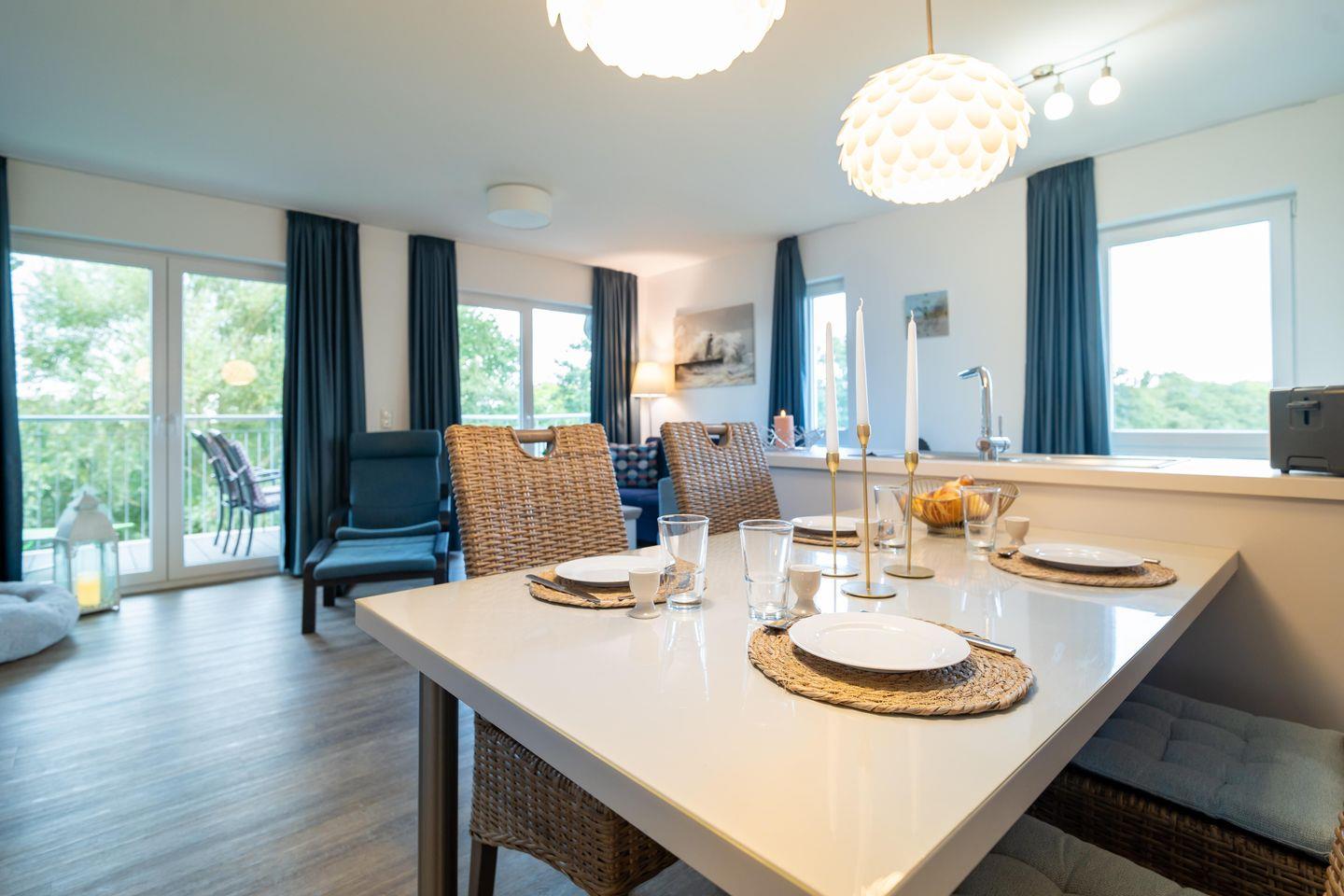 Die Ferienwohnung "Ankerplatz" bietet auf ihren großzügigen 80 Quadratmetern alles, was Ihr für einen entspannten Urlaub benötigt. Der Wohnbereich lädt mit einem gemütlichen Sofa und einem Schwingsessel mit Fußteil zum Verweilen ein. Das umfangreiche Entertainmentpaket mit Fernseher und Musikanlage sorgt für zusätzlichen Komfort. Ein großzügiger Essbereich für die ganze Familie, sowie eine gut ausgestattete Küche mit Herd, Mikrowelle, Spülmaschine und allem, was das Herz begehrt, runden das Angebot ab.