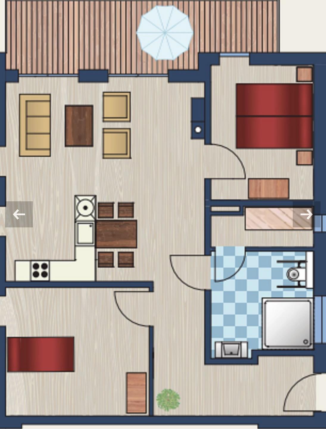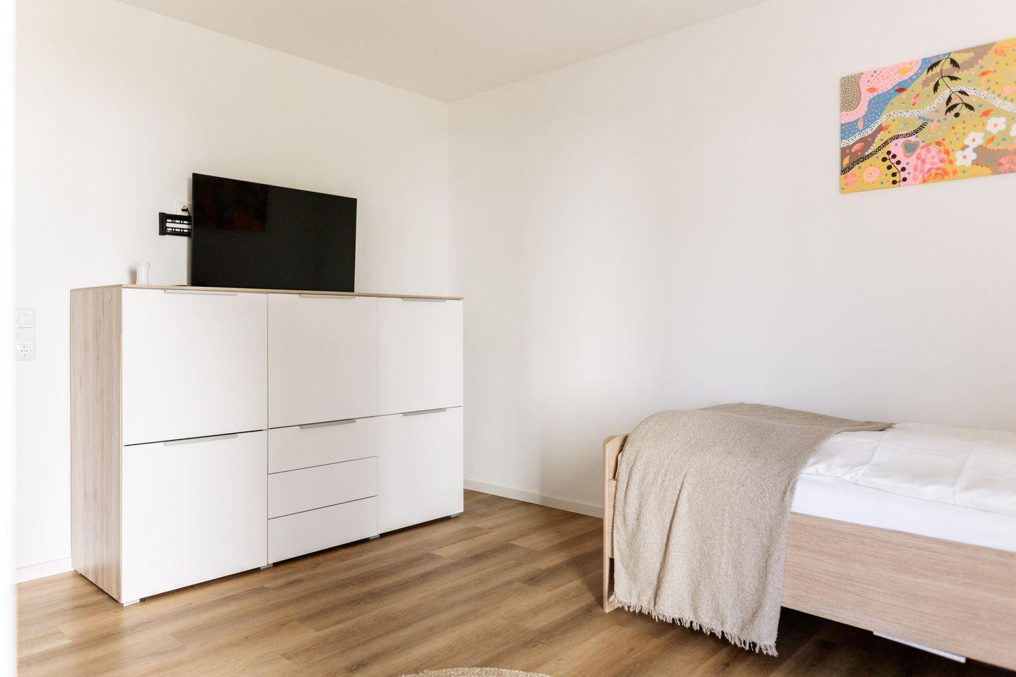 Die Wohnung verfügt über zwei Schlafzimmer: ein erhöhtes Einzelbett im ersten Schlafzimmer und ein gemütliches Doppelbett im zweiten Schlafzimmer. Beide Schlafzimmer verfügen über einen eigenen Fernseher – im Einzelzimmer sogar mit Smart-TV. Perfekte Rückzugsorte zum Entspannen. Die getrennten Schlafbereiche und die eigene Sauna sind ideal, um auch den Mitreisenden ihre private Erholung zu ermöglichen.