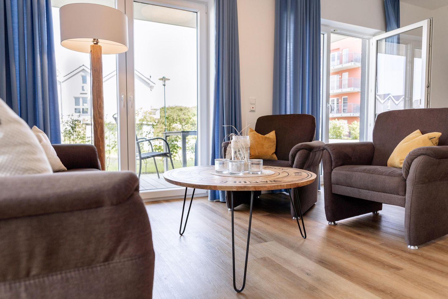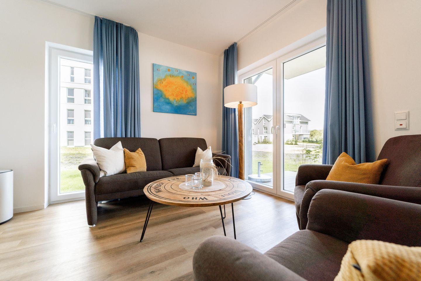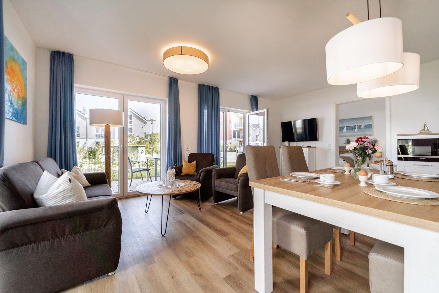 Im gemütlichen Wohnbereich können Sie auf dem Sofa und den zwei Sesseln entspannen. Ein Smart-TV und viele Spiele sorgen für Unterhaltung, auch bei Schietwetter. Die private Sauna vervollständigt das Wohlfühlambiente – ideal für entspannte Abende nach einem Tag am Strand.