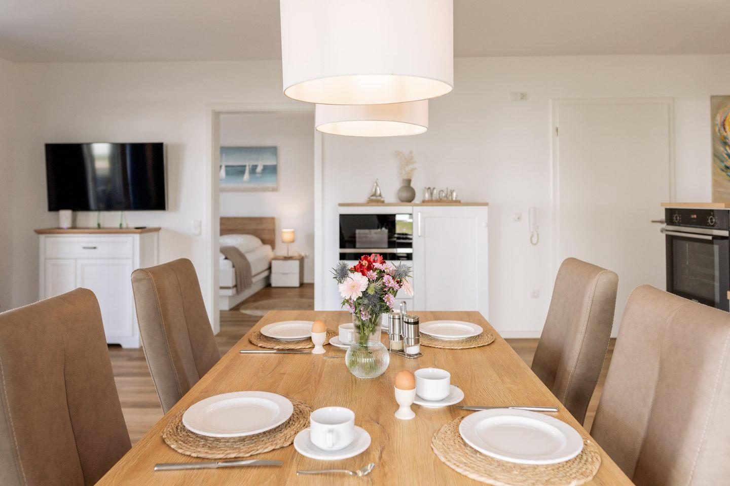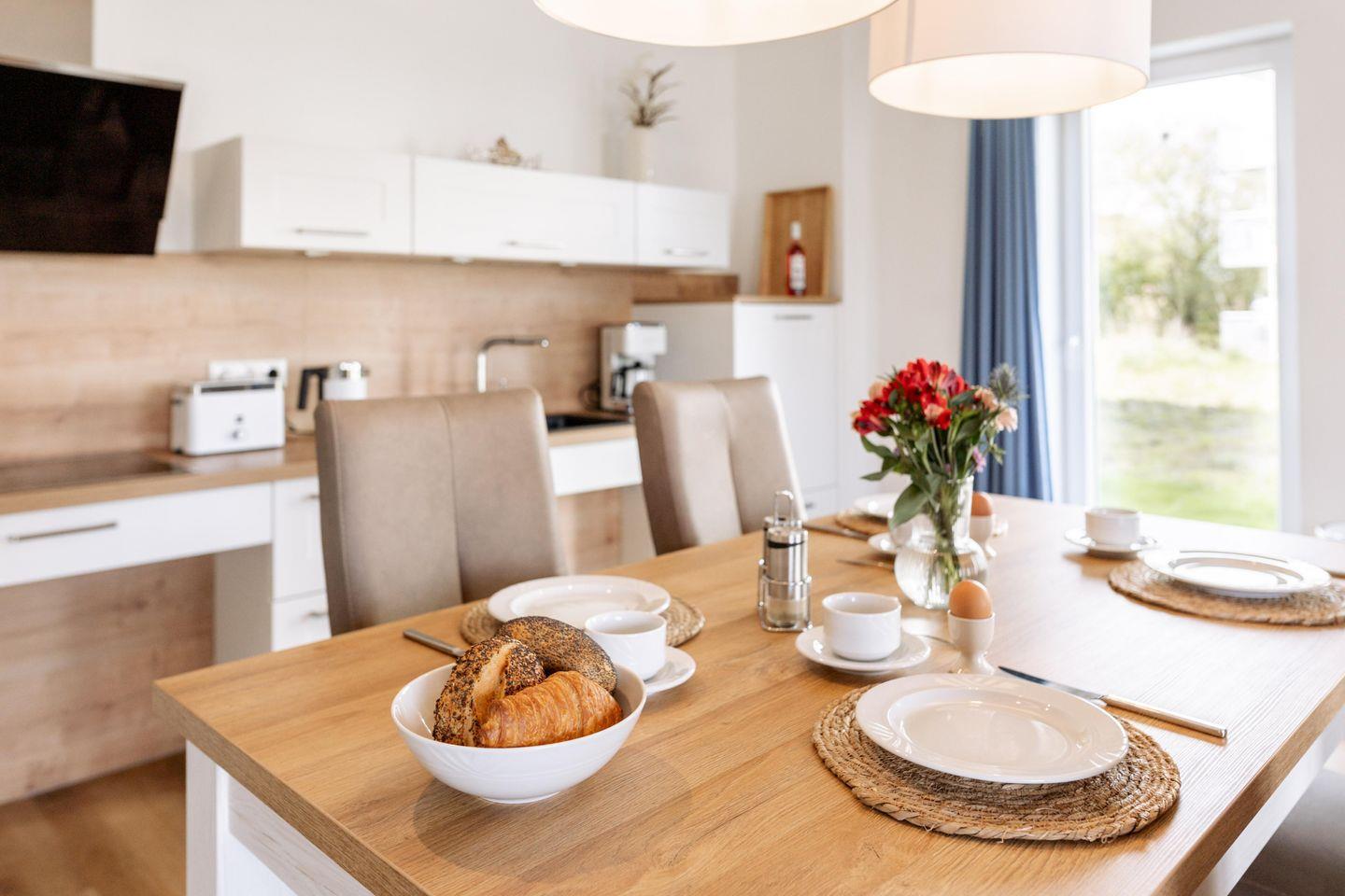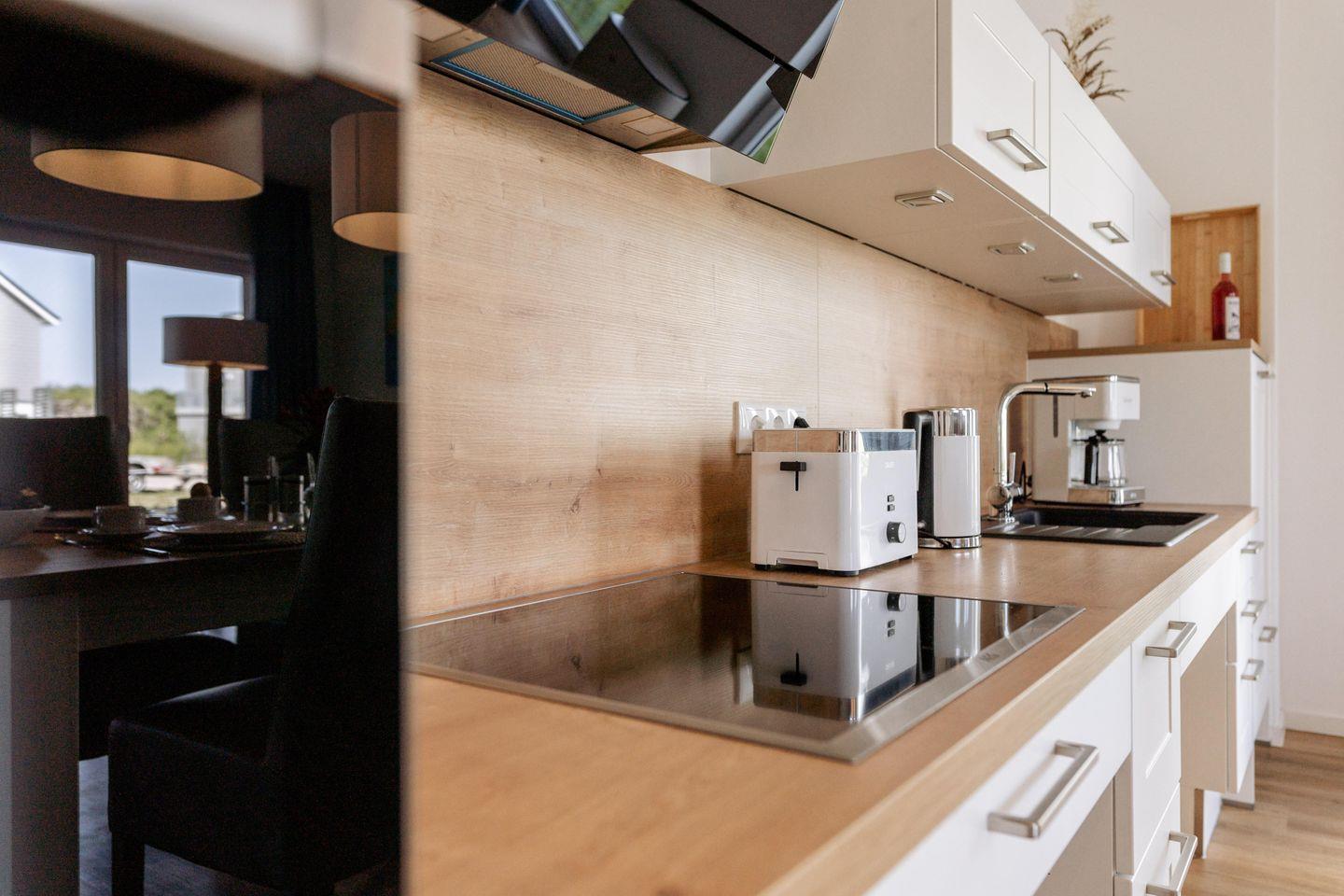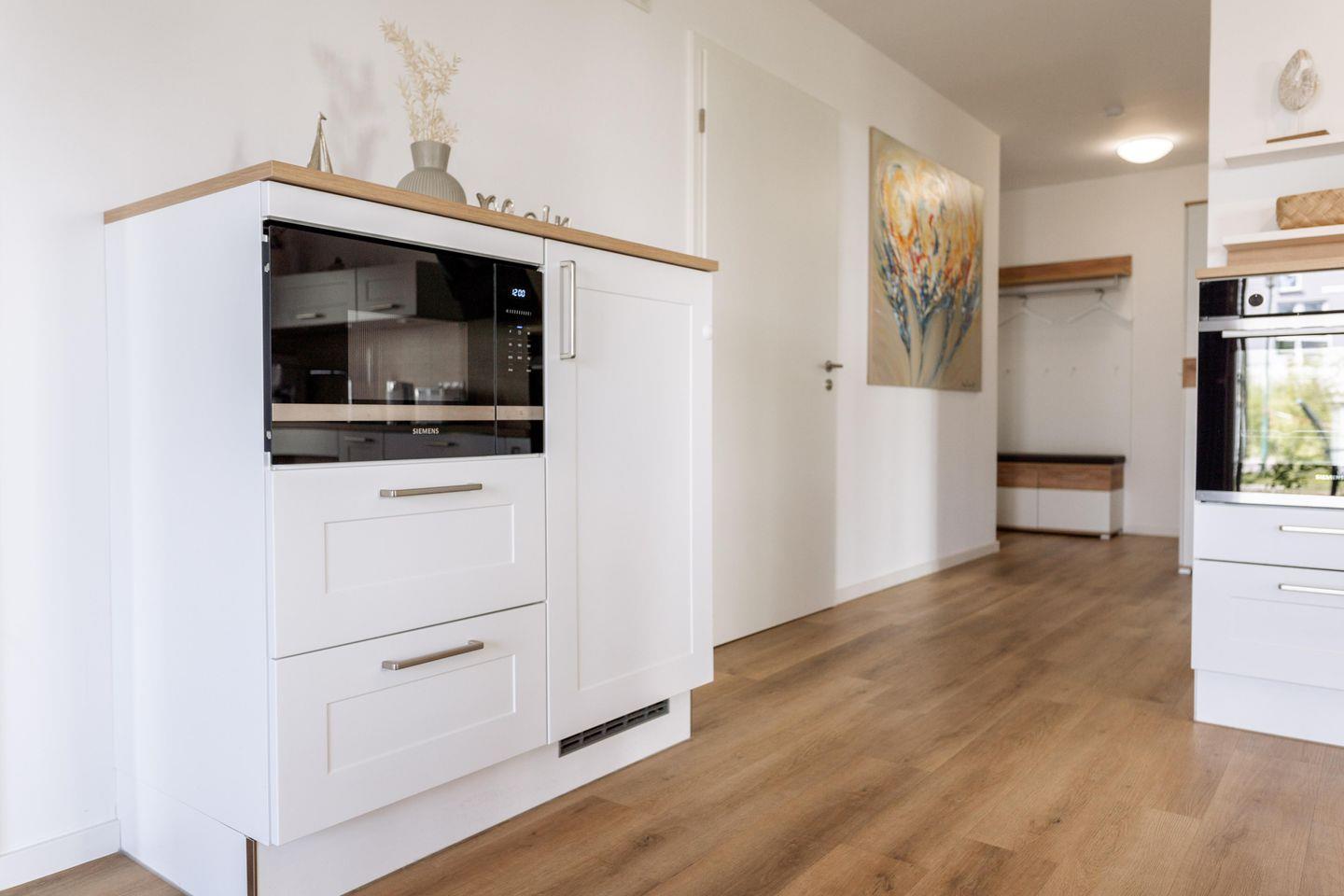 Die rollstuhlgerechte Küche ist ein Höhepunkt der Ferienwohnung. Mit einem unterfahrbaren Herd und Arbeitsflächen sowie niedrigen Schränken sind sie für alle Bedürfnisse ausgestattet. Hier können Sie gemeinsame Kochabende verbringen und dank der umfangreichen Ausstattung, zu der auch moderne Geräte wie eine Spülmaschine, ein Kühlschrank mit Gefrierfach, ein Airfryer und eine Kapsel-Kaffee-Maschine gehören, bleibt kein Wunsch offen.