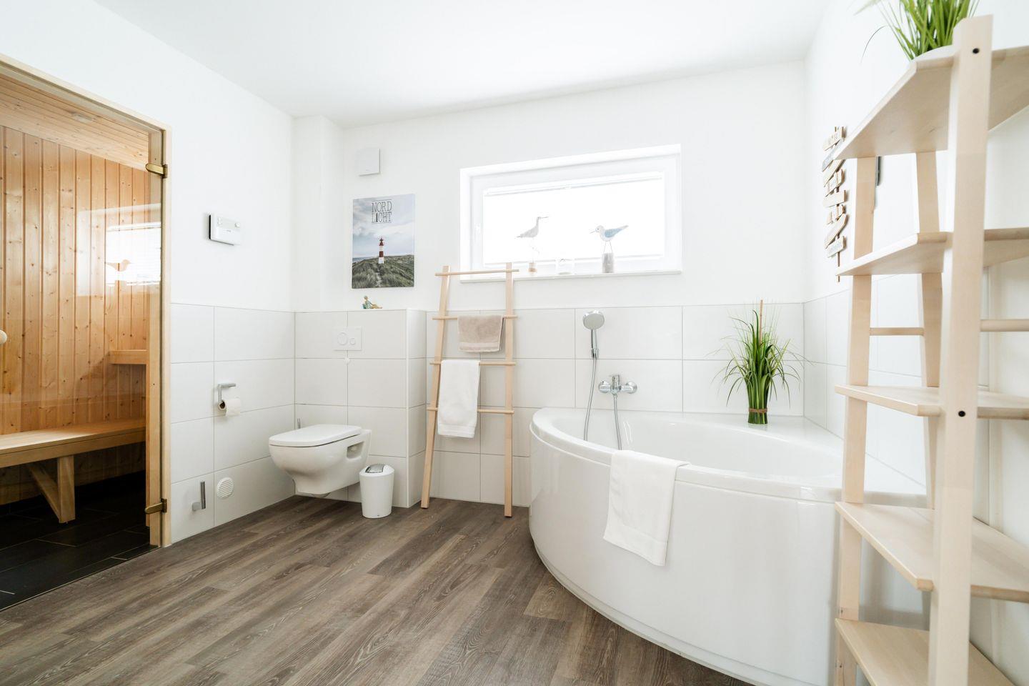 Die "Deichperle" begeistert mit einer luxuriösen Ausstattung und einer einladenden Atmosphäre. Die großzügigen Räume laden dazu ein, sich rundum wohlzufühlen. Im Wohnbereich schafft ein Elektrokamin eine behagliche Wärme und sorgt für romantische Abende. Lehnt Euch entspannt auf dem Sofa zurück und profitiert von dem vielfältigen Entertainmentangebot. Die Küche ist vollständig ausgestattet und lässt kulinarische Herzen höherschlagen: Vom Herd mit Backofen über eine Spülmaschine bis hin zur Espressomaschine. Hier lassen sich gemeinsam köstliche Gerichte zaubern. Der Essbereich eignet sich hervorragend für lange Frühstücke und gesellige Abende. In den Schlafzimmern erwarten Euch bequeme Betten und geräumige Kleiderschränke, die Komfort und Platz bieten. Das Badezimmer mit privater Sauna rundet das Wohlfühlambiente perfekt ab.