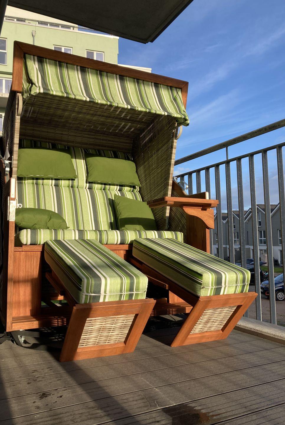 Euer Balkon bietet nicht nur den Blick über die Anlage, sondern auch einen eigenen Strandkorb. Lasst die Seele baumeln und genießt die Nordseeluft. Ein Bollerwagen steht bereit für Eure Ausflüge mit den Kleinen. Erkundet die Umgebung spielend leicht und ohne lästiges Schleppen.