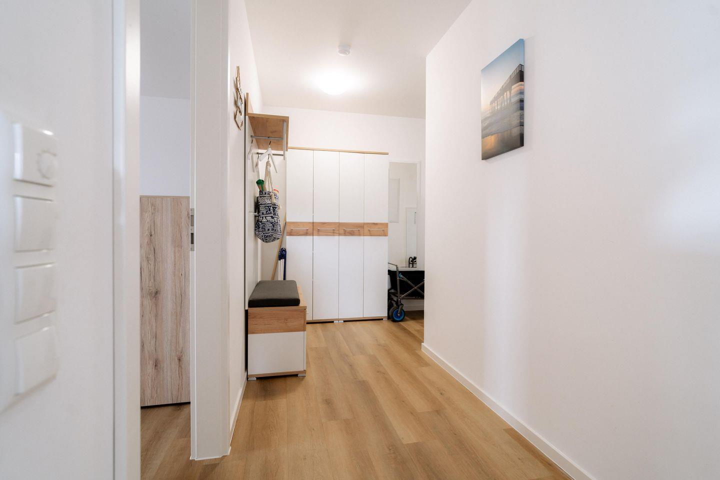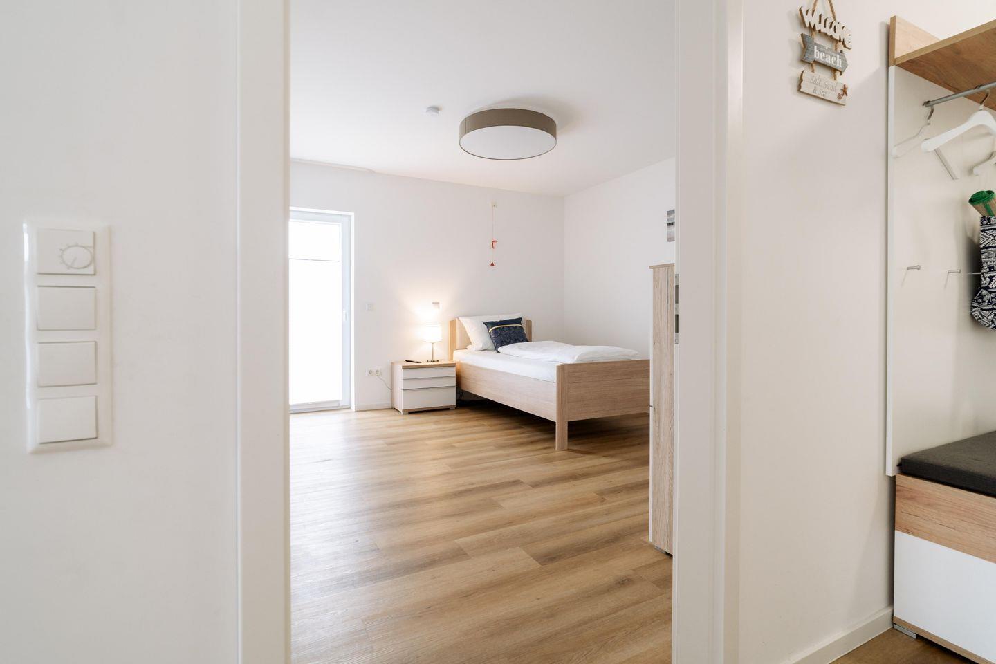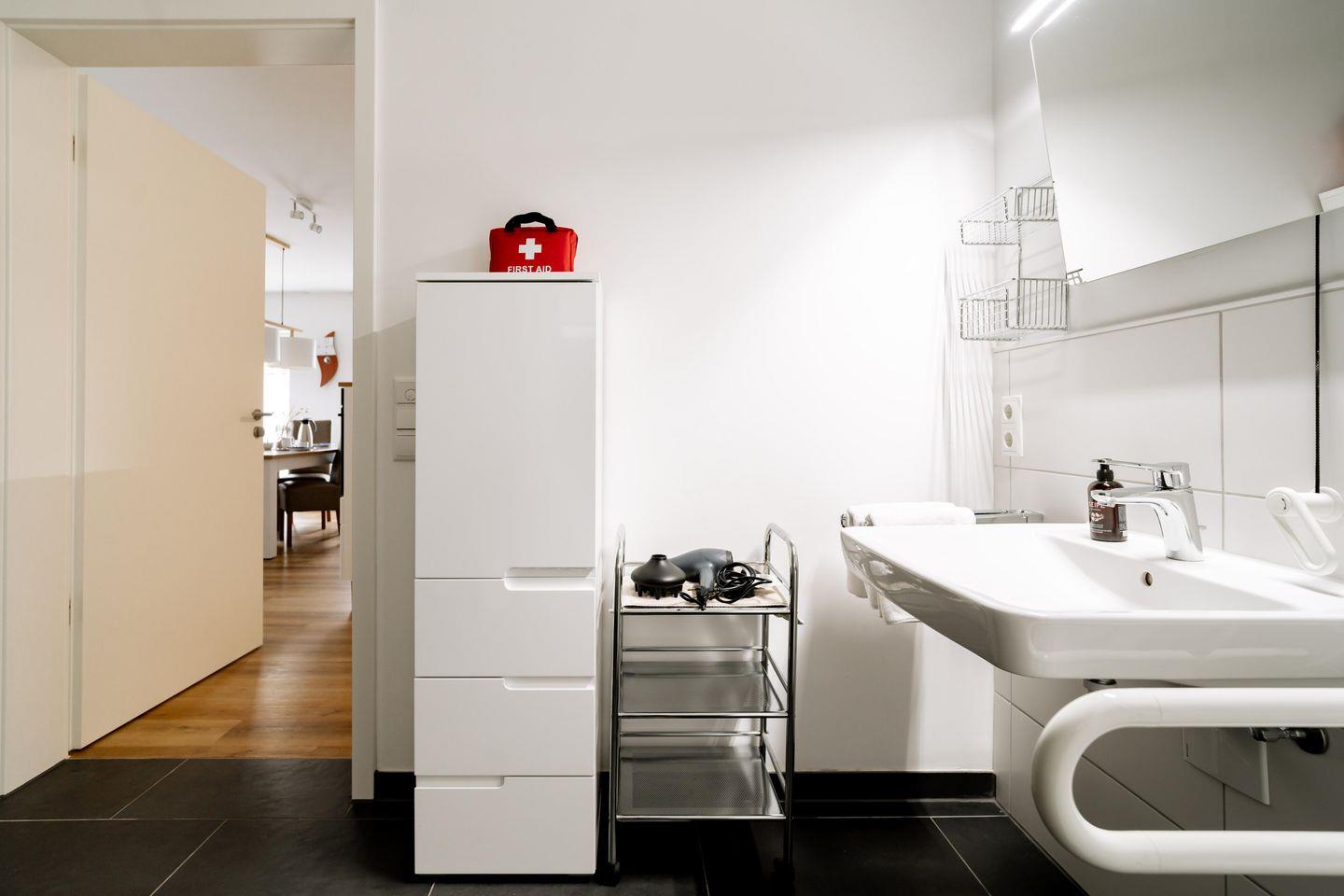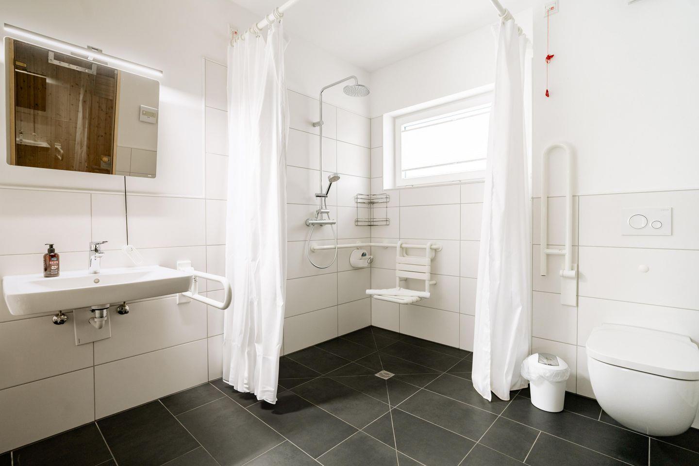 Unsere Wohnung bietet breite Türen, eine rollstuhlgerechte Küche mit unterfahrbarem Herd und Arbeitsflächen sowie niedrige Schränke. Ein Schlafzimmer ist speziell auf die Bedürfnisse von Rollstuhlfahrern ausgerichtet. Das zweite Schlafzimmer besticht durch ein gemütliches Doppelbett. Das moderne Badezimmer verfügt über eine ebenerdige, befahrbare Dusche. Ein intelligent installiertes Meldesystem im Schlaf- und Badezimmer sorgt durch optische und akustische Signale im Wohnraum für maximale Sicherheit.