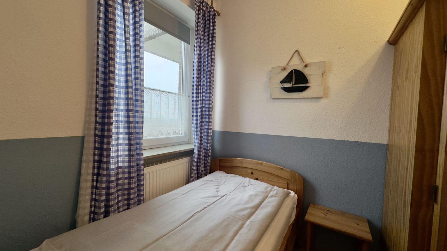 Das separate Schlafzimmer mit zwei Einzelbetten bietet erholsame Nächte und Platz für 2 Personen. Ein Highlight ist der vom Wohnzimmer aus zugängliche Balkon. Hier können Sie sonnige Tage genießen, den Blick über Horumersiel schweifen lassen und einfach entspannen.