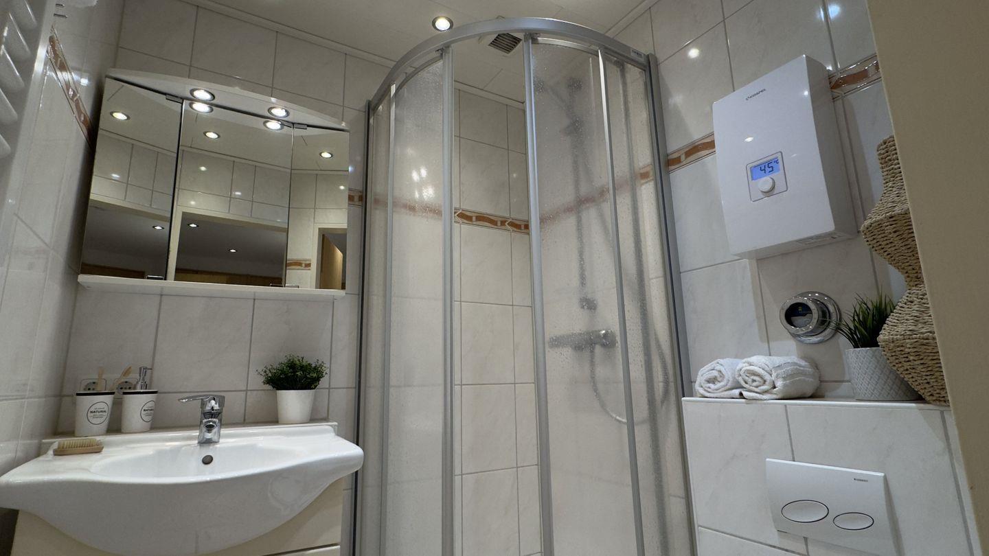 Die angrenzende Wohnküche ist perfekt ausgestattet und bietet alles, was Sie für Ihre Selbstversorgung benötigen. Das hell geflieste Badezimmer überzeugt durch Funktionalität auf kleinem Raum und bietet alles, was Sie für Ihre tägliche Hygiene brauchen.