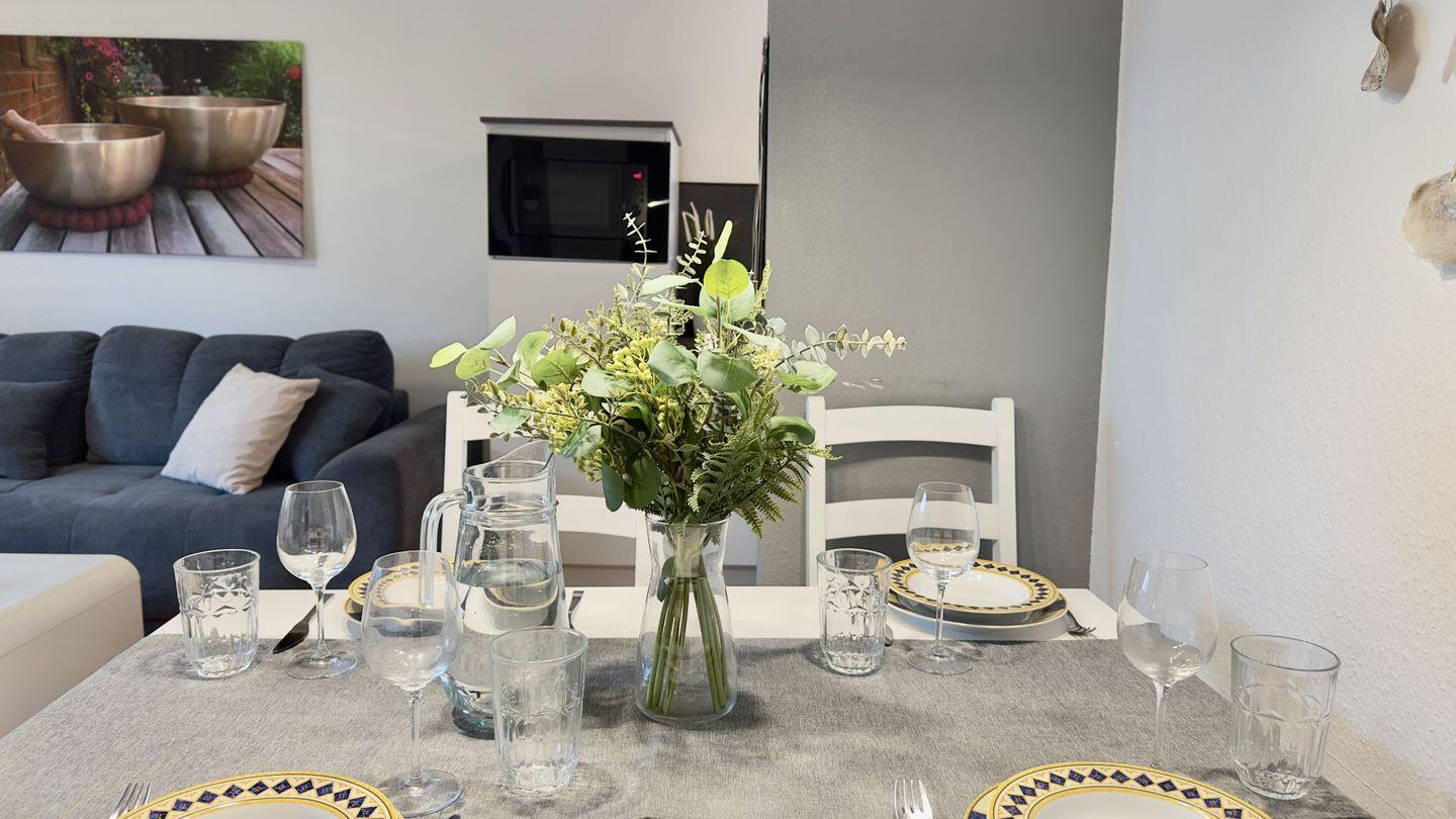 Die angrenzende Essgruppe bietet ausreichend Platz für gemeinsame Mahlzeiten oder gemütliche Spieleabende mit der Familie.