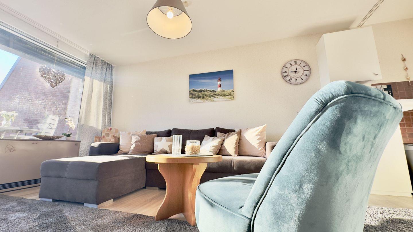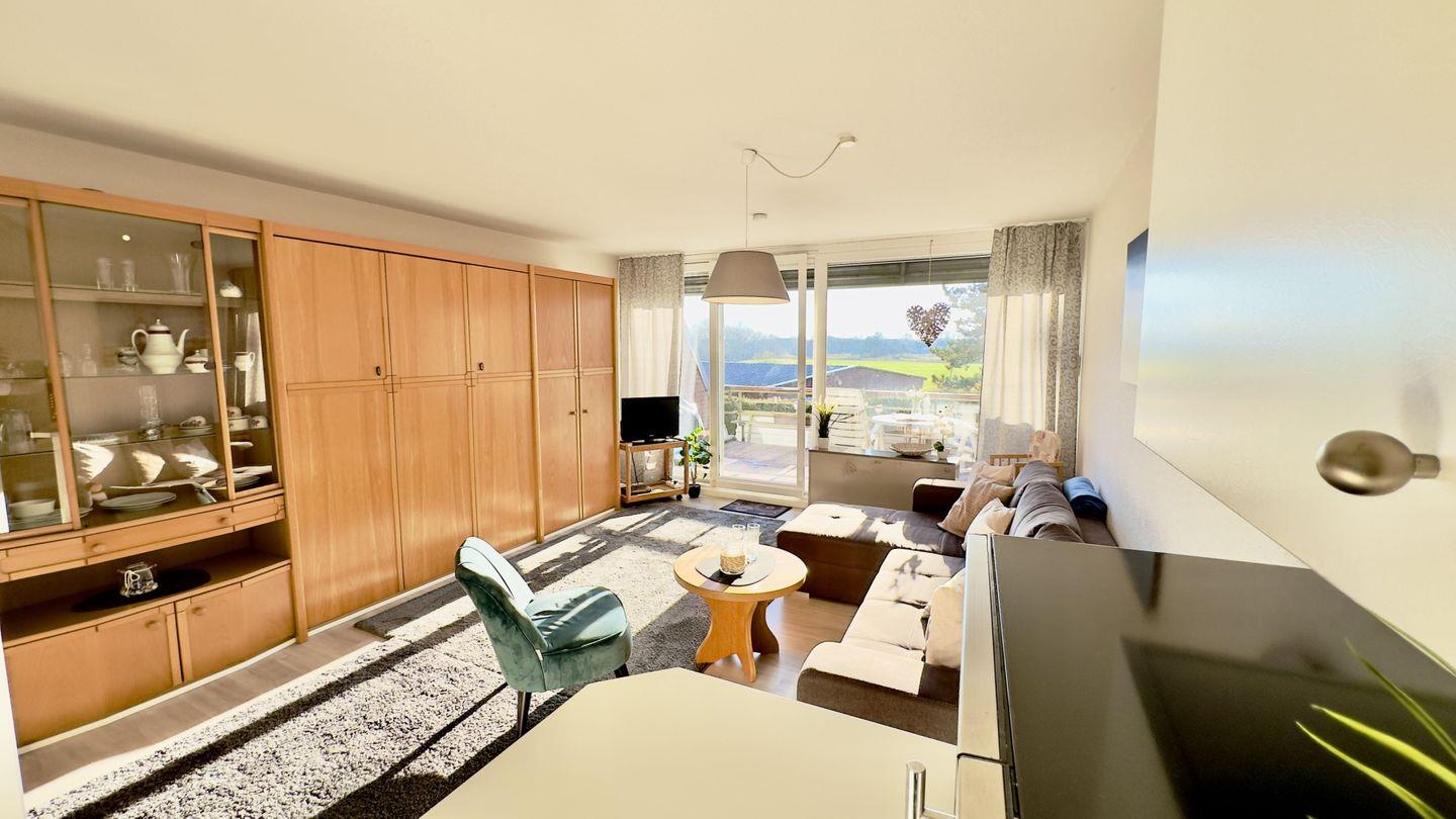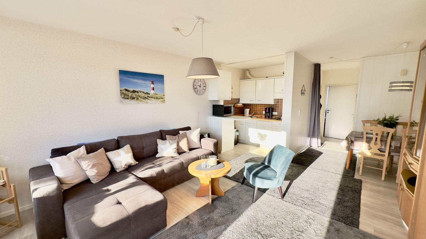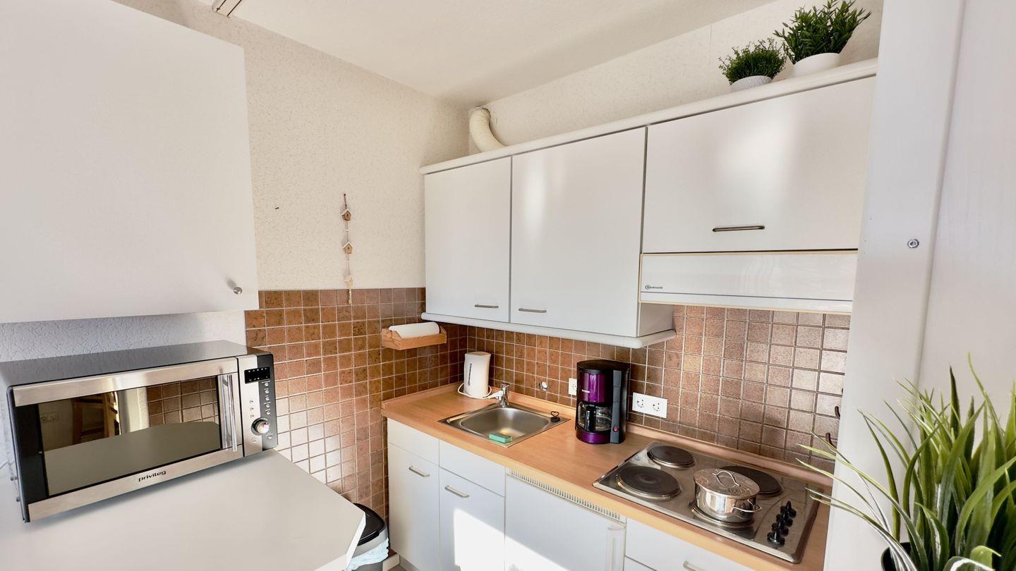 Über den hellen, einladenden Flur betreten Sie das lichtdurchflutete Wohnzimmer. Dank der großen Fensterfronten genießen Sie hier nicht nur viel Tageslicht, sondern auch einen herrlichen Blick ins Grüne und auf den sonnigen Balkon – perfekt für entspannte Stunden bei einem Glas Wein. Die gemütliche Sofaecke lädt zu erholsamen Abenden ein, während die Essgruppe für 4 Personen zum gemeinsamen Essen oder lustigen Spieleabenden einlädt. Die offene Kochnische ist voll ausgestattet und bietet alles, was Sie für die Selbstversorgung benötigen.Die Mikrowelle verfügt über eine Backfunktion.