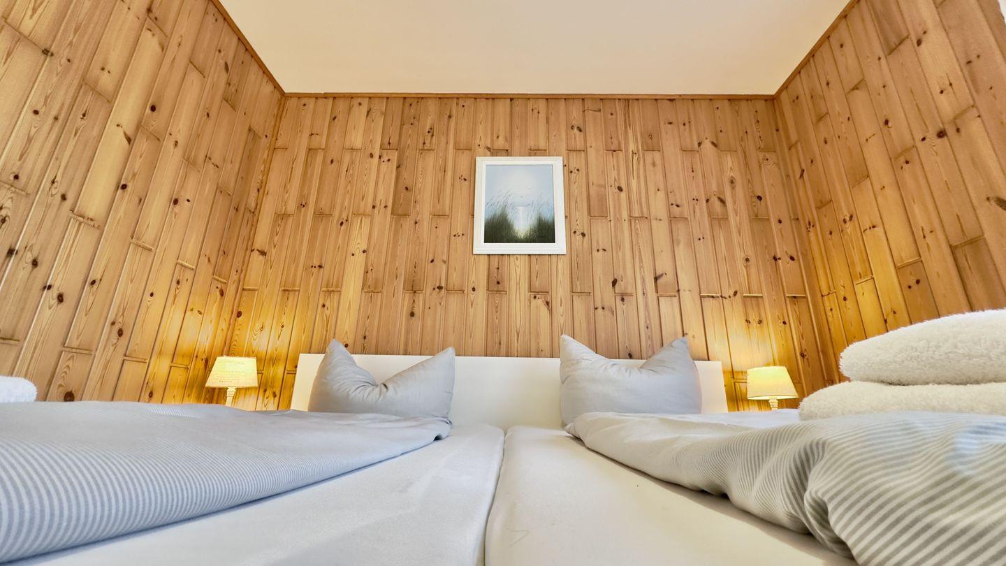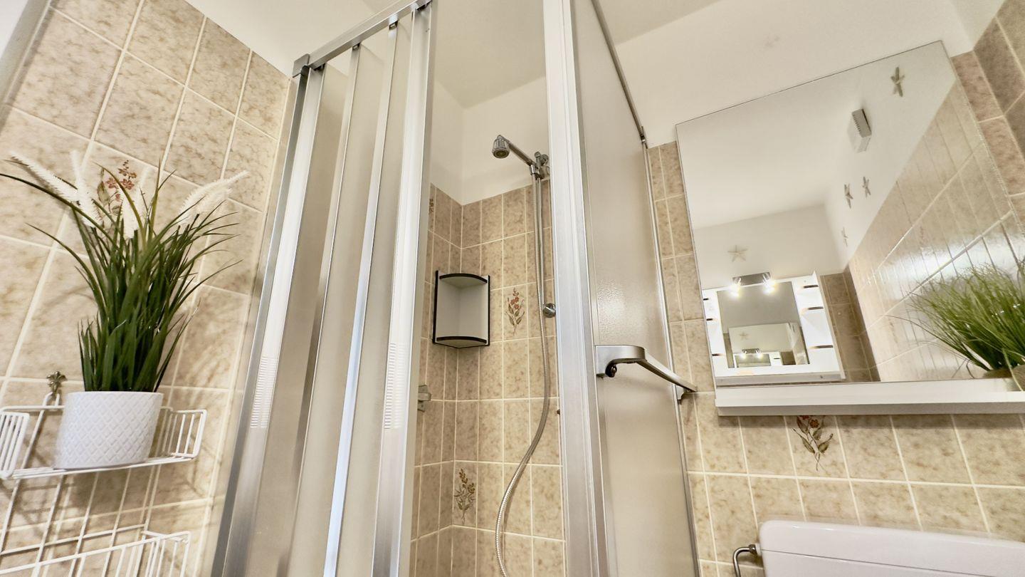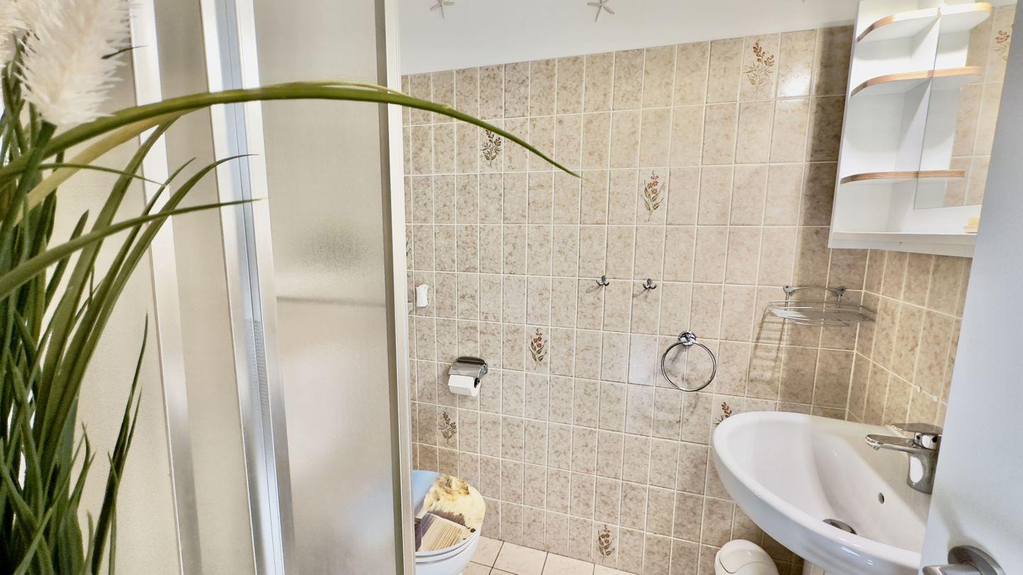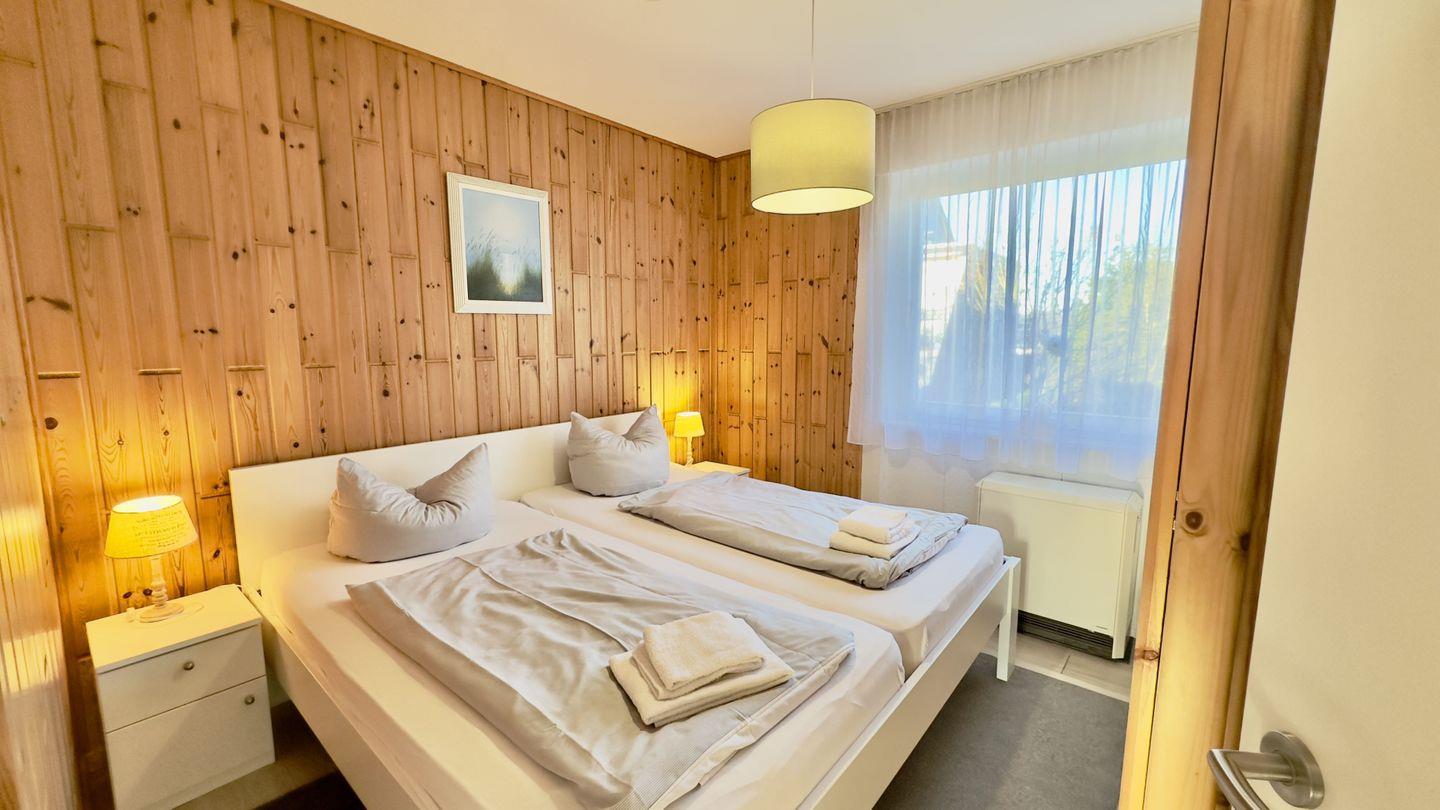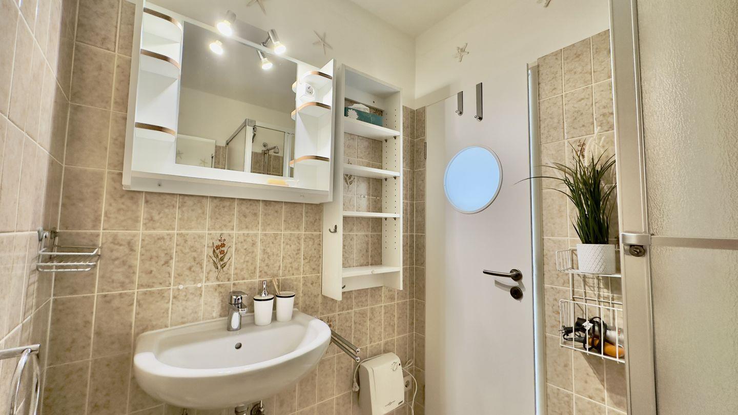 Das separate Schlafzimmer bietet ein Doppelbett mit Einzelmatratzen und einen großzügigen Kleiderschrank. Die warme Holzoptik verleiht dem Raum eine behagliche Atmosphäre, die zum Wohlfühlen einlädt. Das kleine, aber feine Badezimmer verfügt über eine Dusche, einen Spiegel und genügend Platz für Ihre täglichen Bedürfnisse.