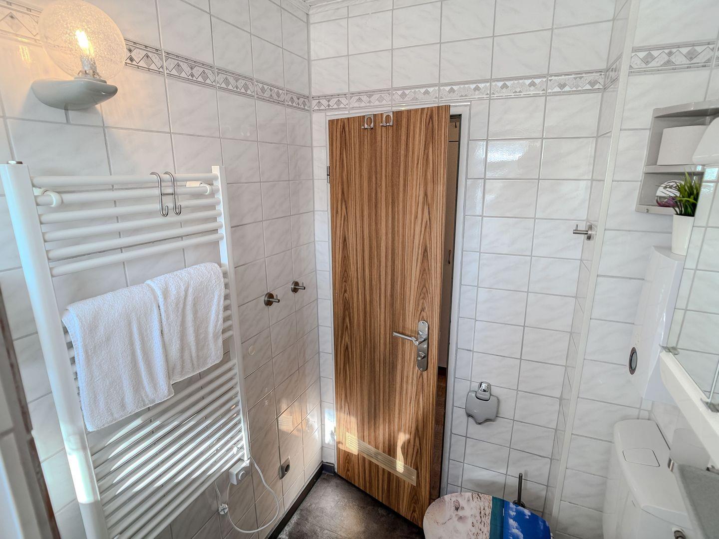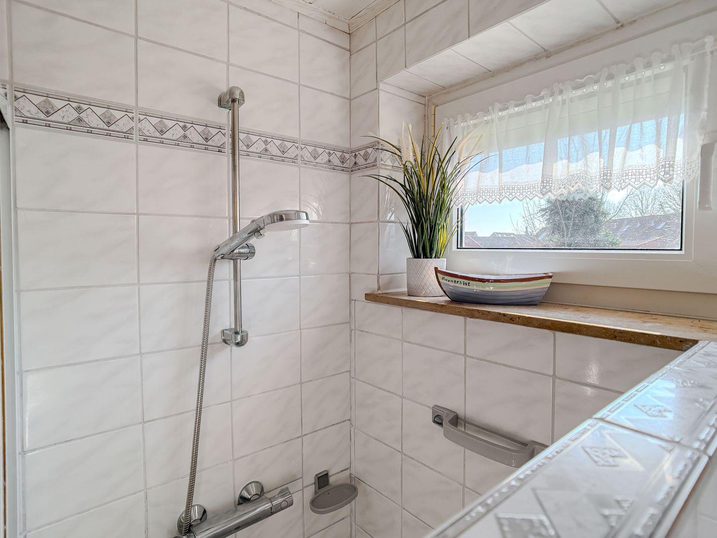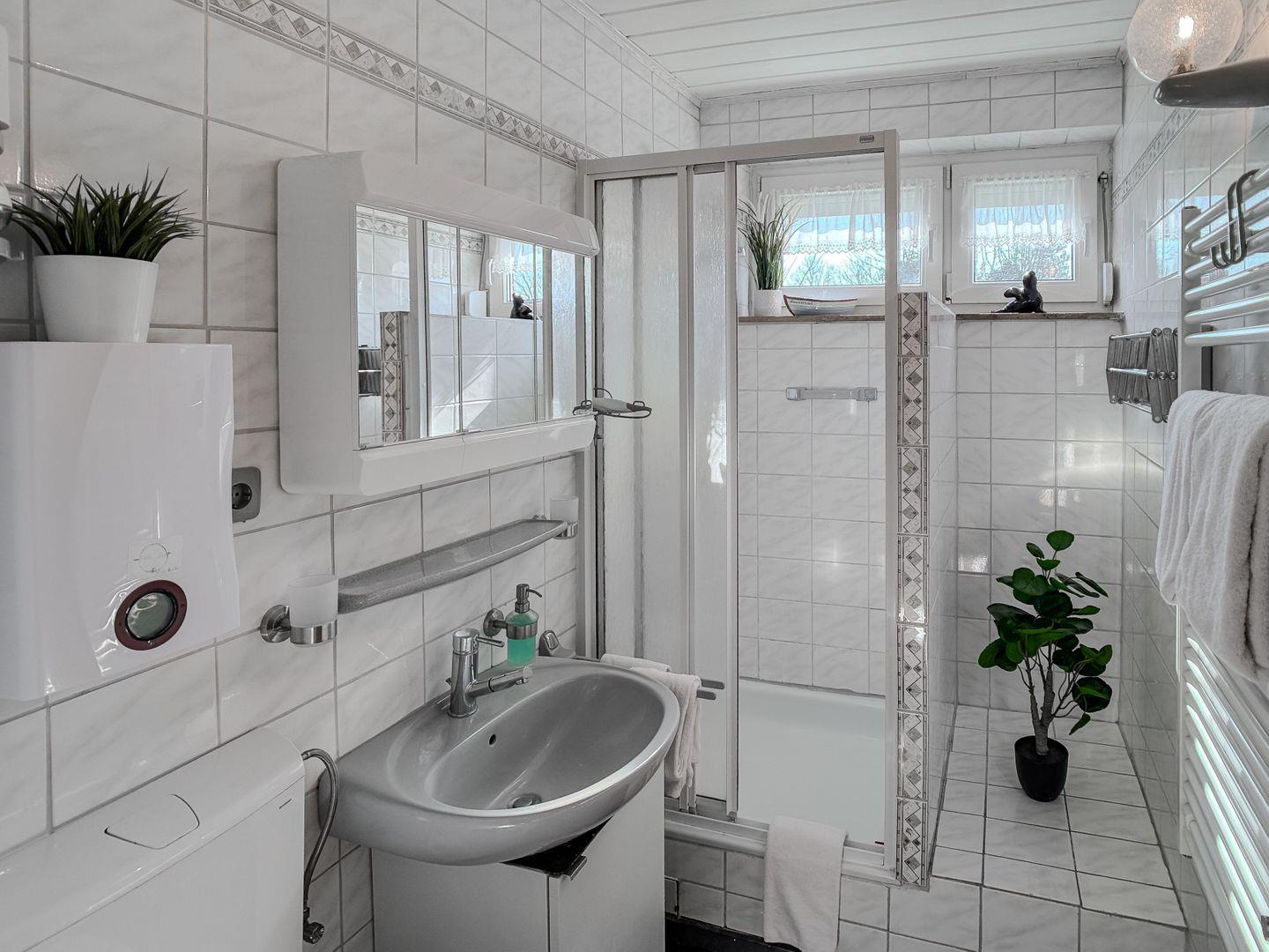 Das helle Tageslichtbad bietet ausreichend Platz für Ihre morgendliche Routine und sorgt mit seiner freundlichen Atmosphäre für einen angenehmen Start in den Tag.