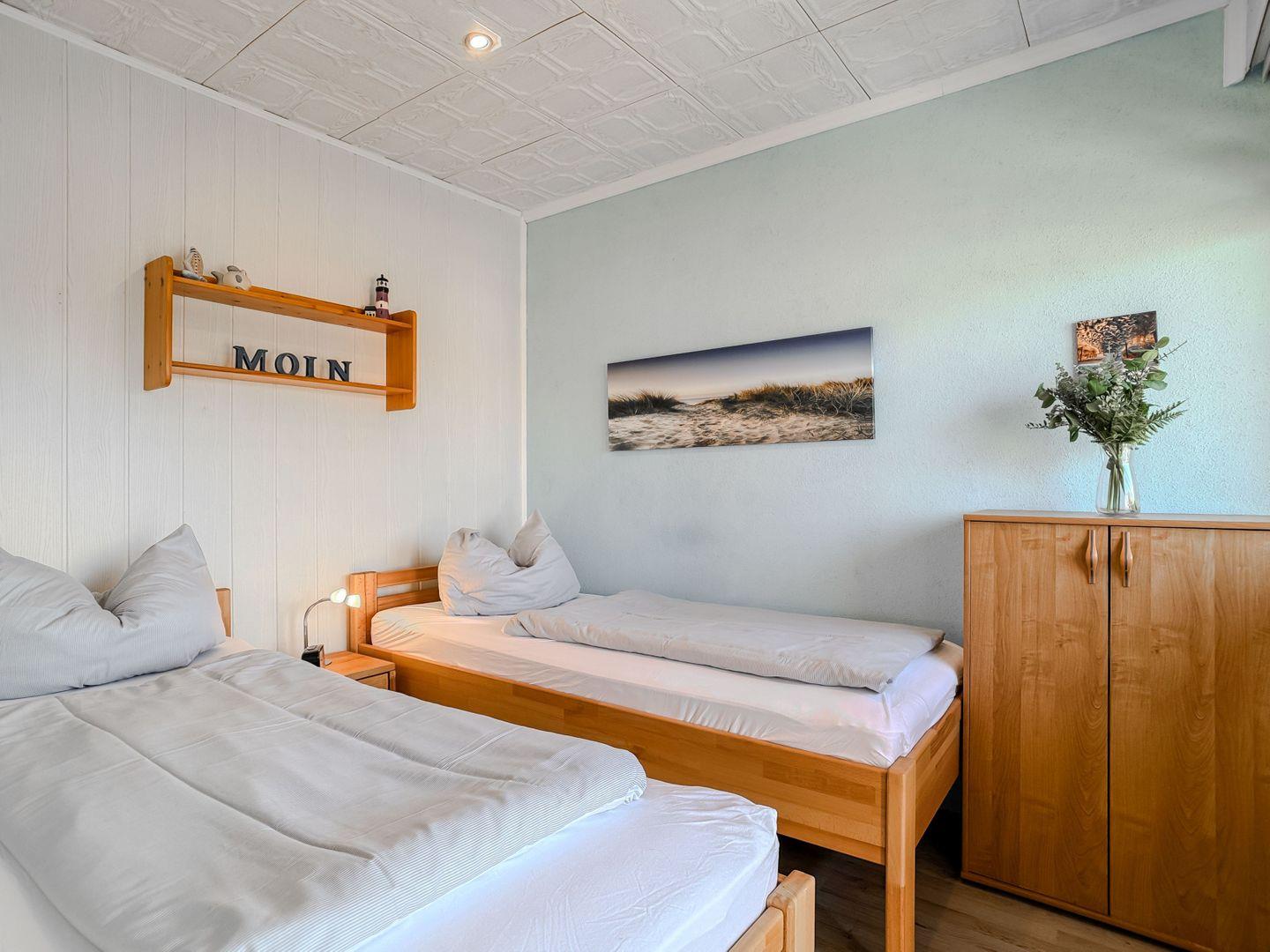 Im gemütlichen Schlafzimmer erwarten Sie zwei bequeme Einzelbetten, die für erholsame Nächte sorgen.