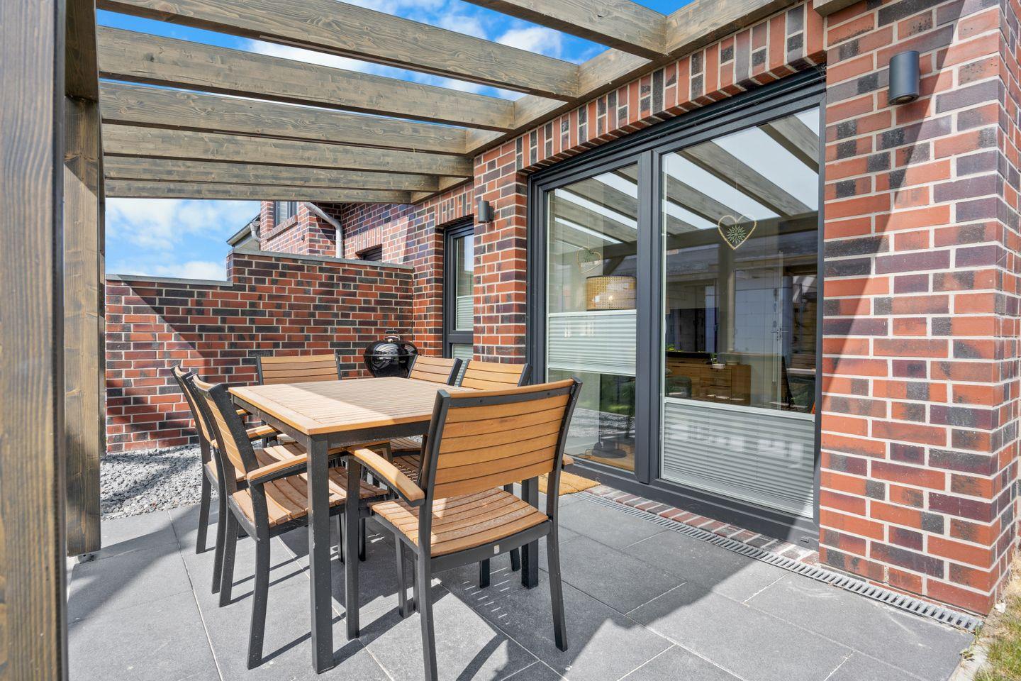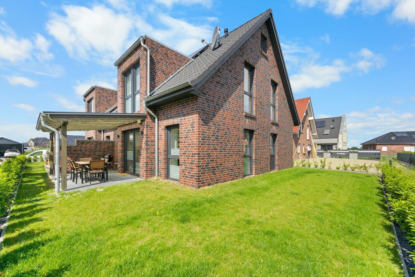 Die Außenbereiche des Hauses sind ebenso einladend. Sie können entspannte Stunden auf der überdachten Terrasse verbringen oder im Garten die frische Luft genießen. Gartenmöbel laden dazu ein, die Sonne zu genießen oder ein Buch zu lesen. Zudem steht Ihnen ein Bollerwagen zur Verfügung, damit Sie die Umgebung bequem erkunden können.