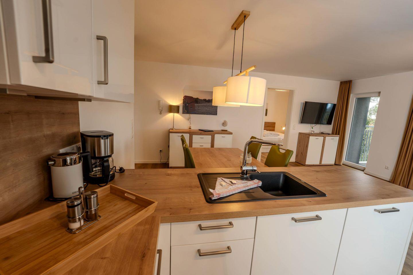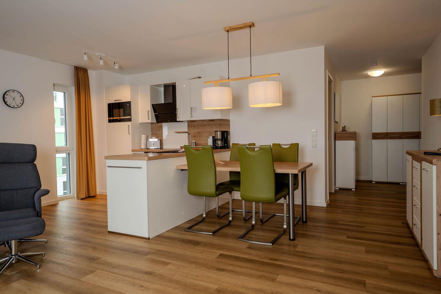 Die offene, modern ausgestattete Küche bietet alles, was Ihr für gemeinsame Mahlzeiten braucht: vom Backofen über die Mikrowelle bis zur Kaffeemaschine. Am gemütlichen Esstisch habt Ihr genügend Platz für ausgedehnte Frühstücke, Spieleabende oder ein Glas Wein zum Tagesausklang.